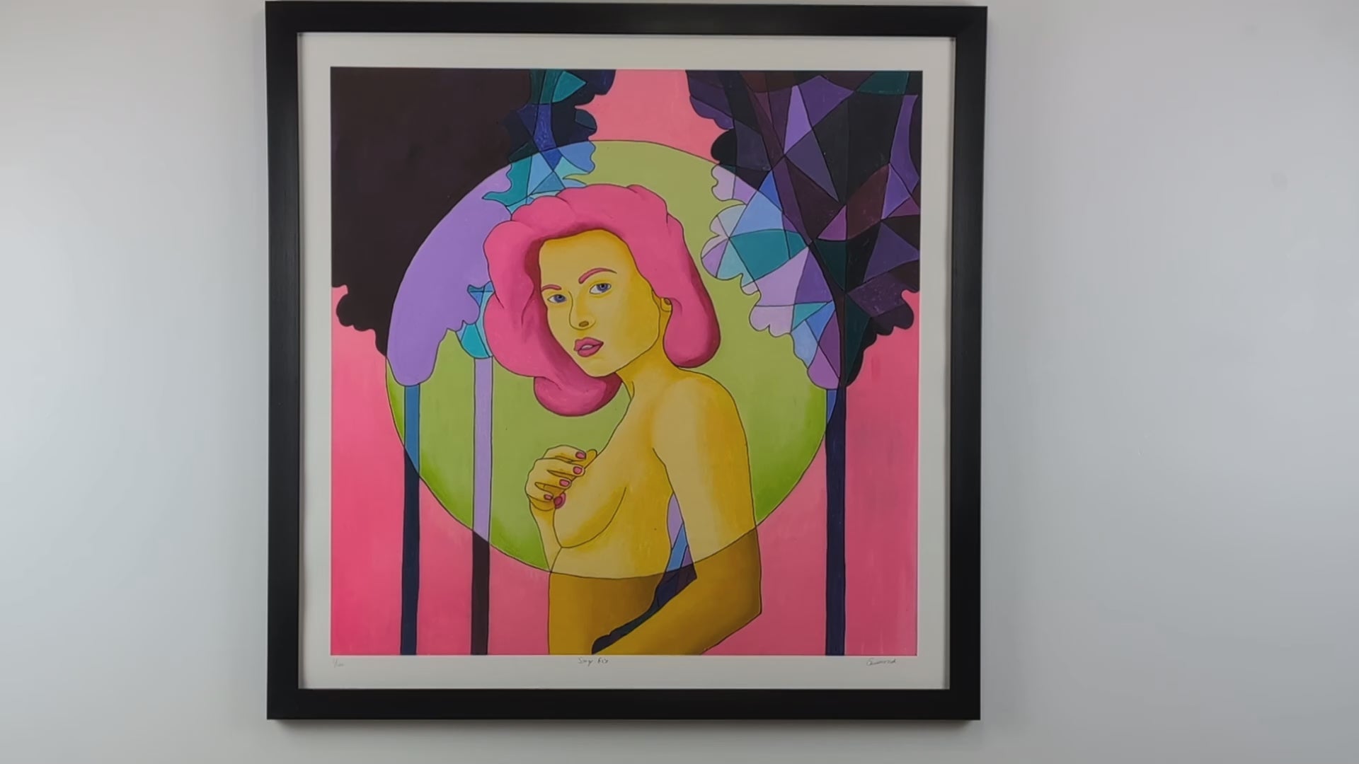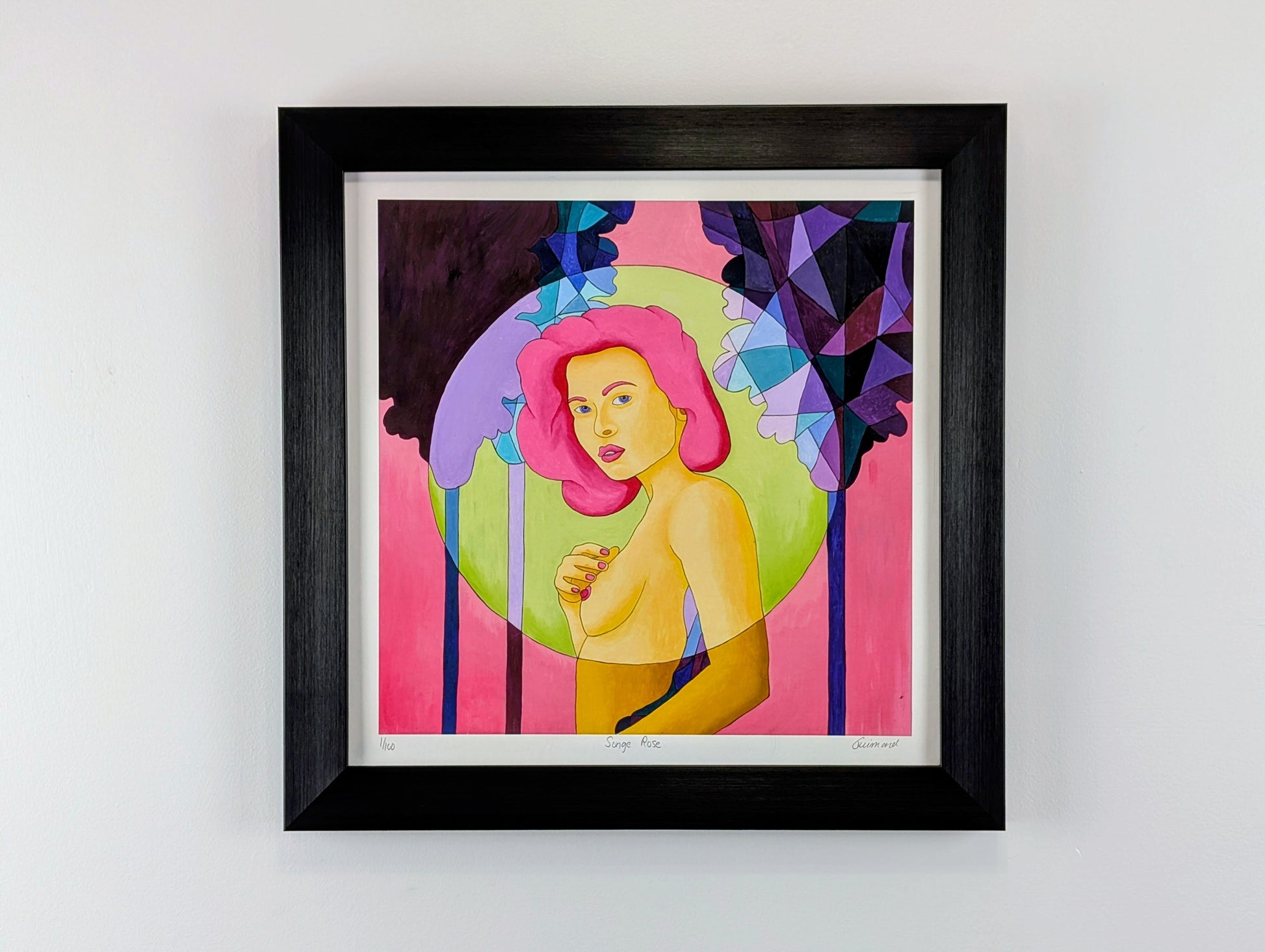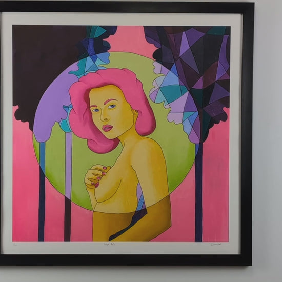 In der Mitte der Komposition repariert eine Frau mit intensivem rosa Haar den Zuschauer mit einem mysteriösen und versicherten Blick. Sein Ausdruck, der Ruhe und Sinnlichkeit beeindruckt, erinnert an einen hängenden Moment, einen Moment der Träumerei zwischen Erwachen und Verlassenheit. Mit einer zarten Hand berührt sie ihre Brust und stärkt die Intimität und Süße der Szene.