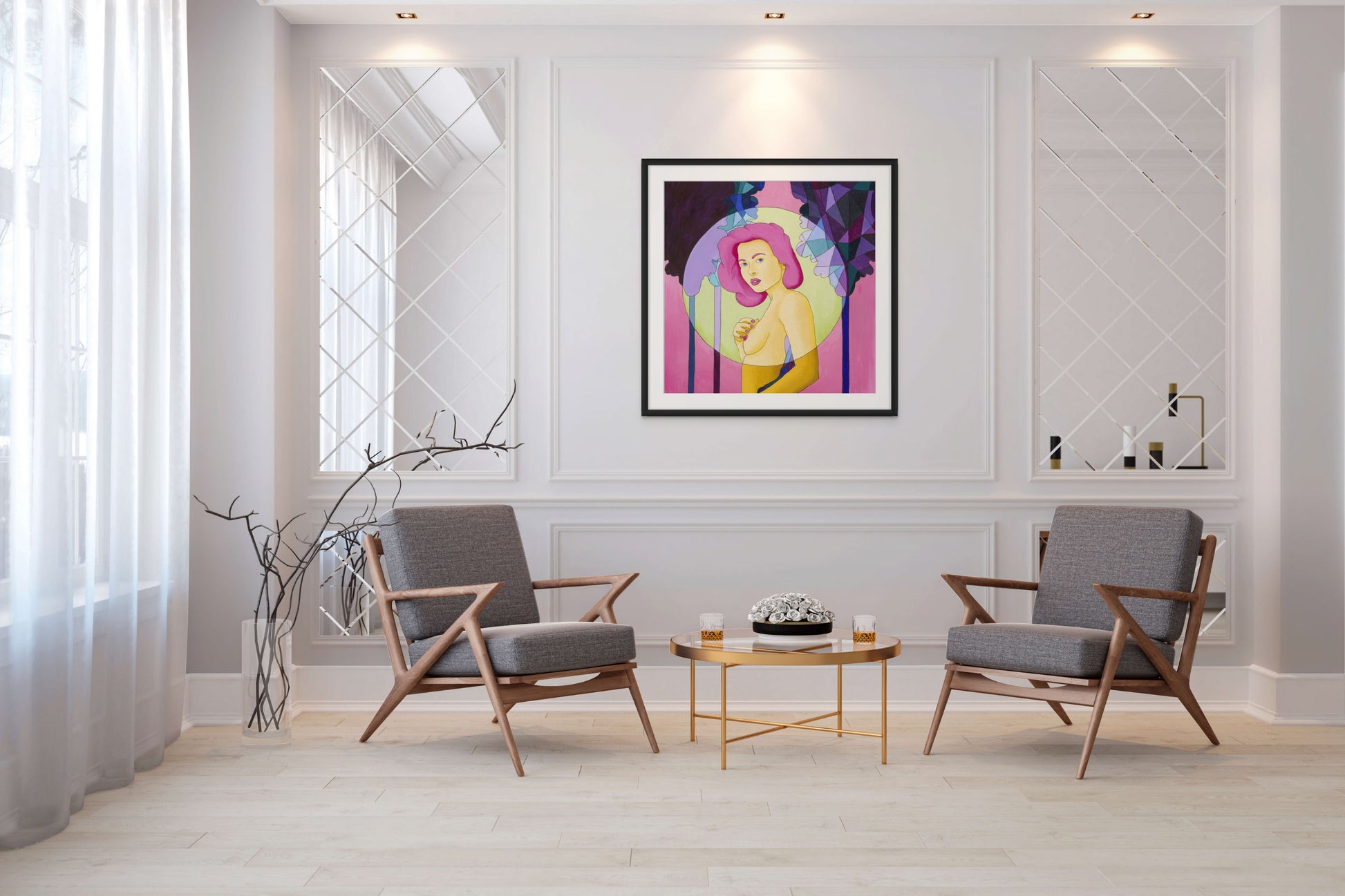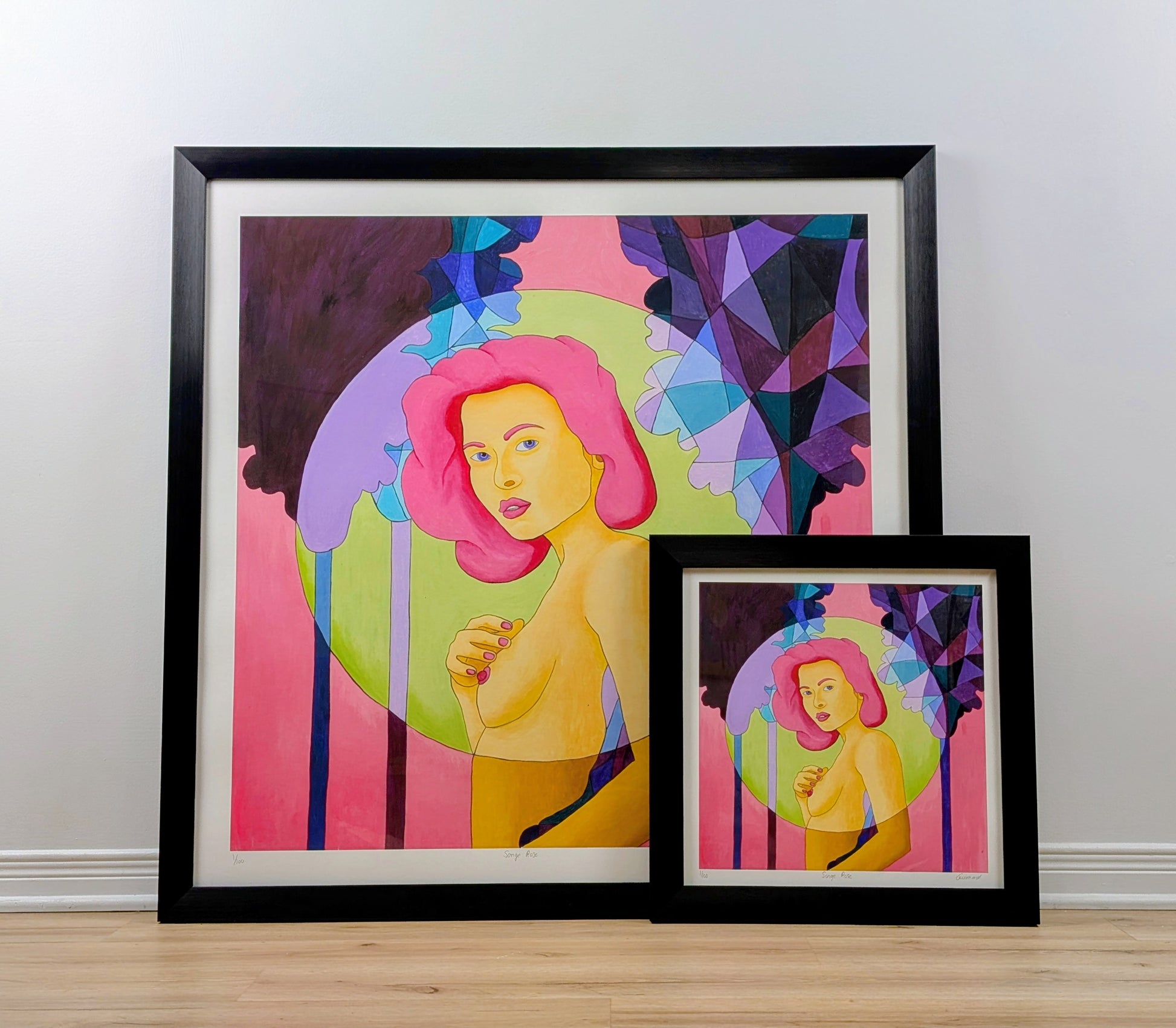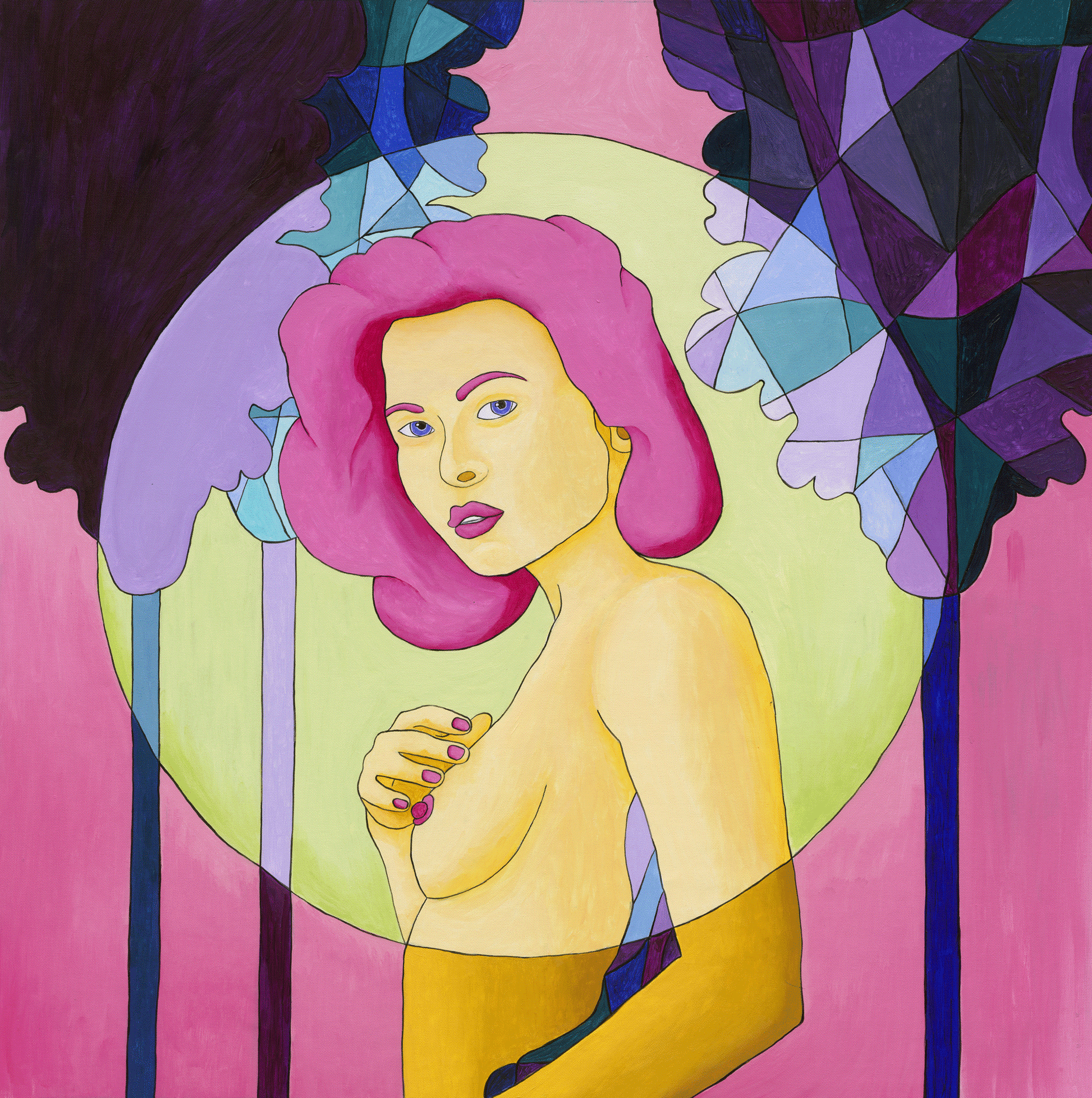In der Mitte der Komposition repariert eine Frau mit intensivem rosa Haar den Zuschauer mit einem mysteriösen und versicherten Blick. Sein Ausdruck, der Ruhe und Sinnlichkeit beeindruckt, erinnert an einen hängenden Moment, einen Moment der Träumerei zwischen Erwachen und Verlassenheit. Mit einer zarten Hand berührt sie ihre Brust und stärkt die Intimität und Süße der Szene.