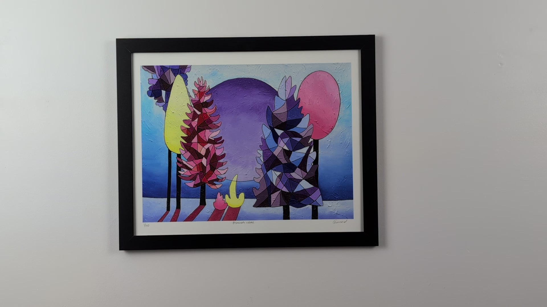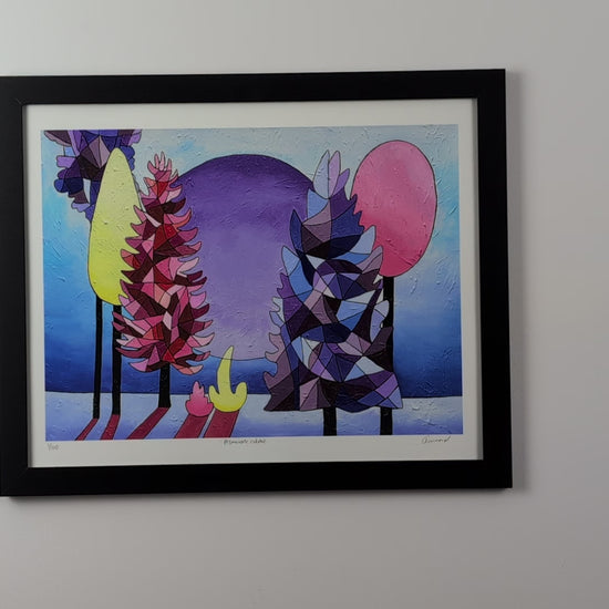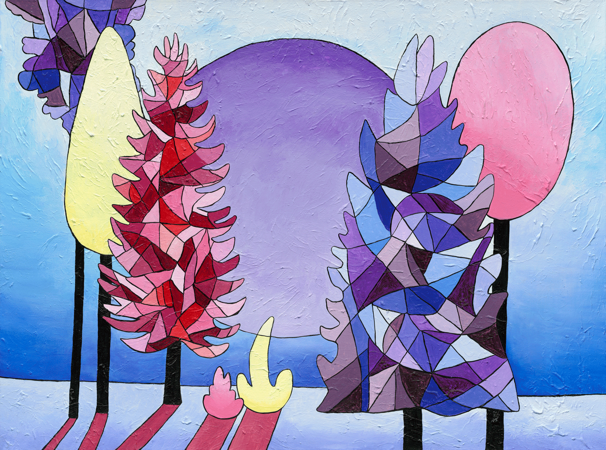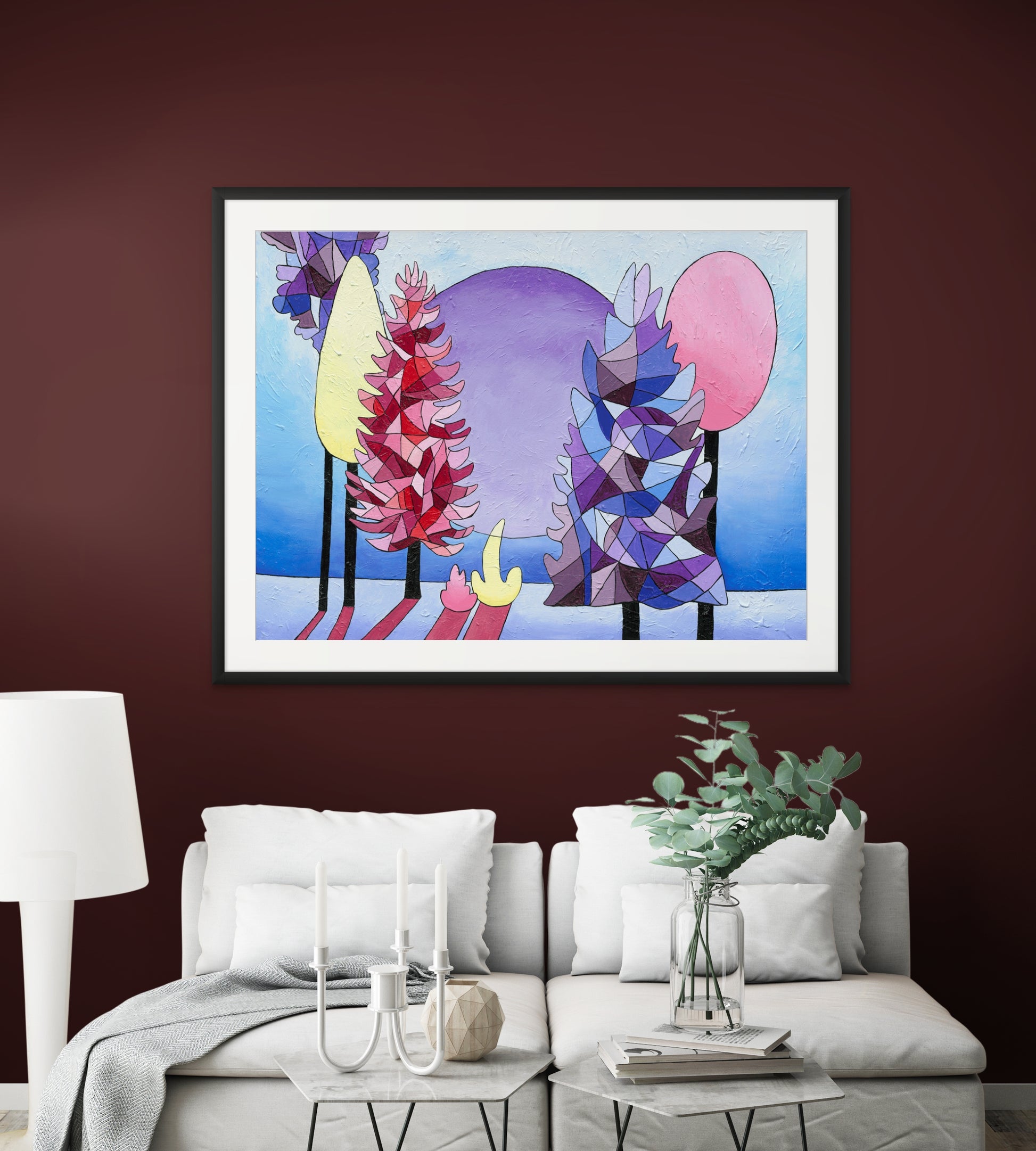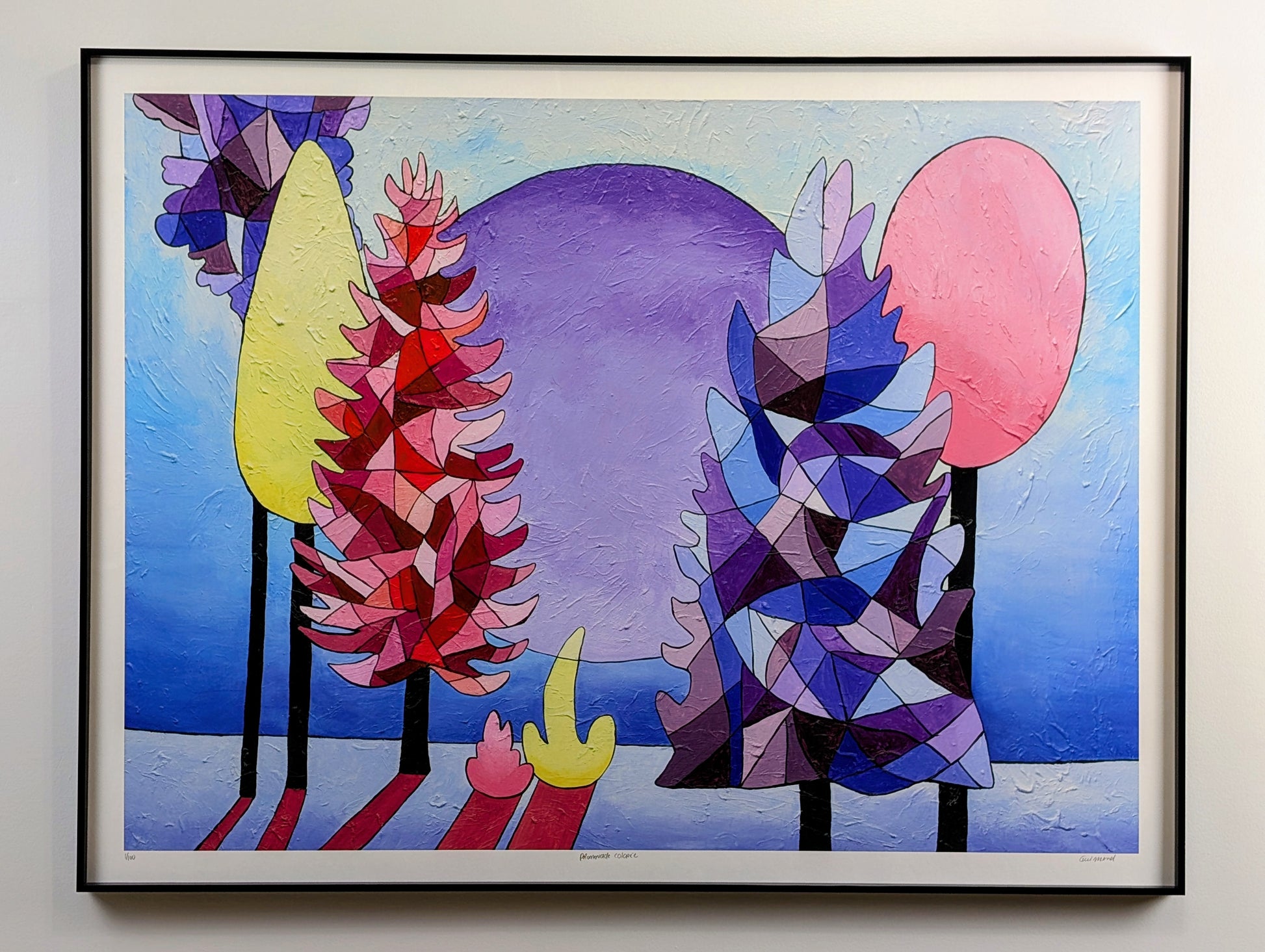 Let yourself be carried away by Colorful walk, a vibrant and joyful work by Guimond. This dreamlike scene highlights stylized trees with geometric shapes and bright colors, rising under a sky with soothing tones of lavender and blue. Each element seems to dance in harmony, creating a dynamic and captivating composition.