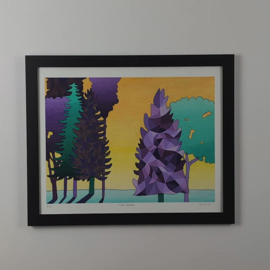 Debajo de un cielo bañado en colores dorados que evoca un amanecer o una puesta de sol, coníferas estilizadas, vibrantes de tonos de azul, púrpura y turquesa. Su follaje, fragmentado en facetas geométricas, parece capturar y reflejar la luz, creando un juego sutil de contrastes y profundidad.