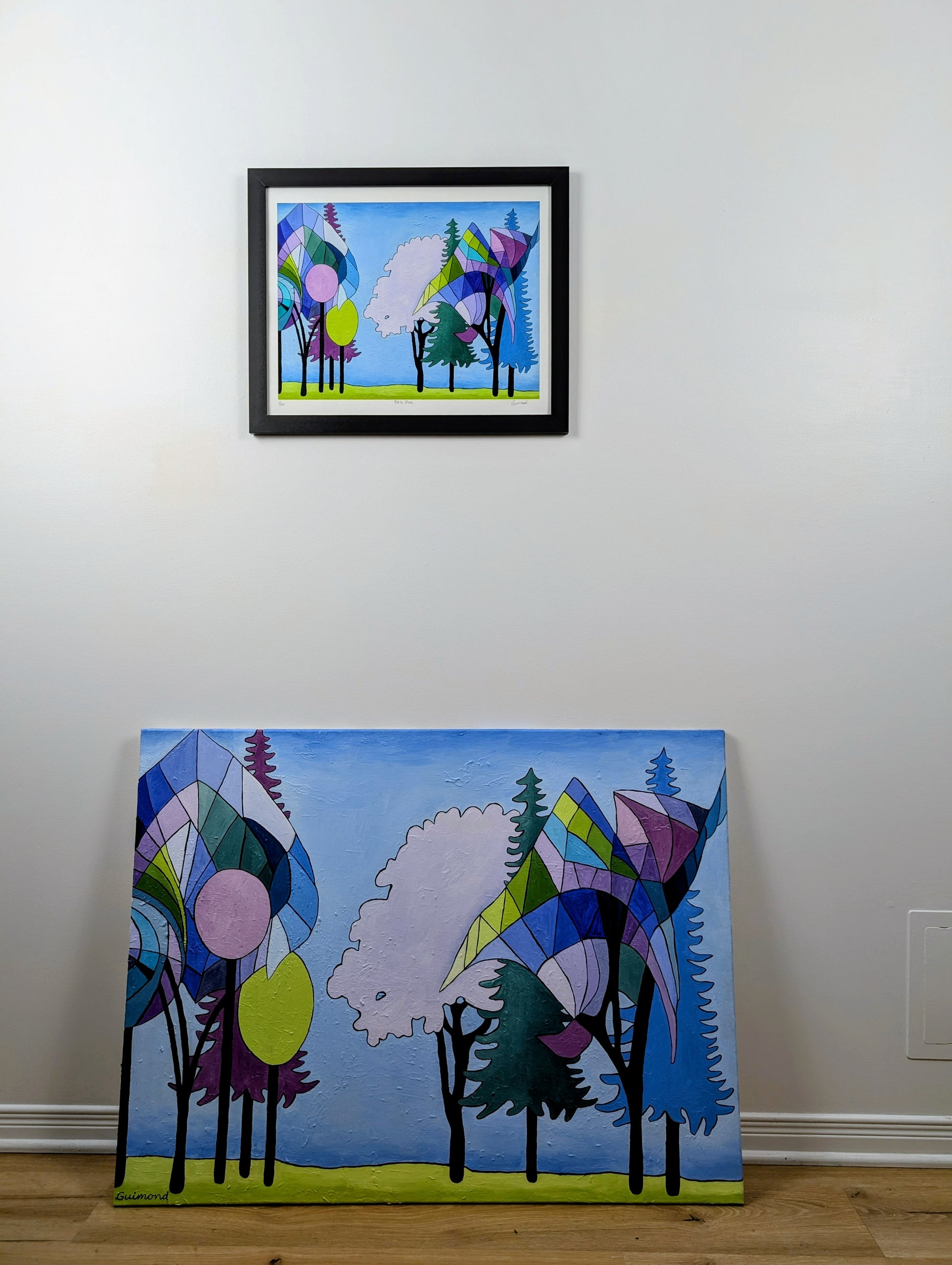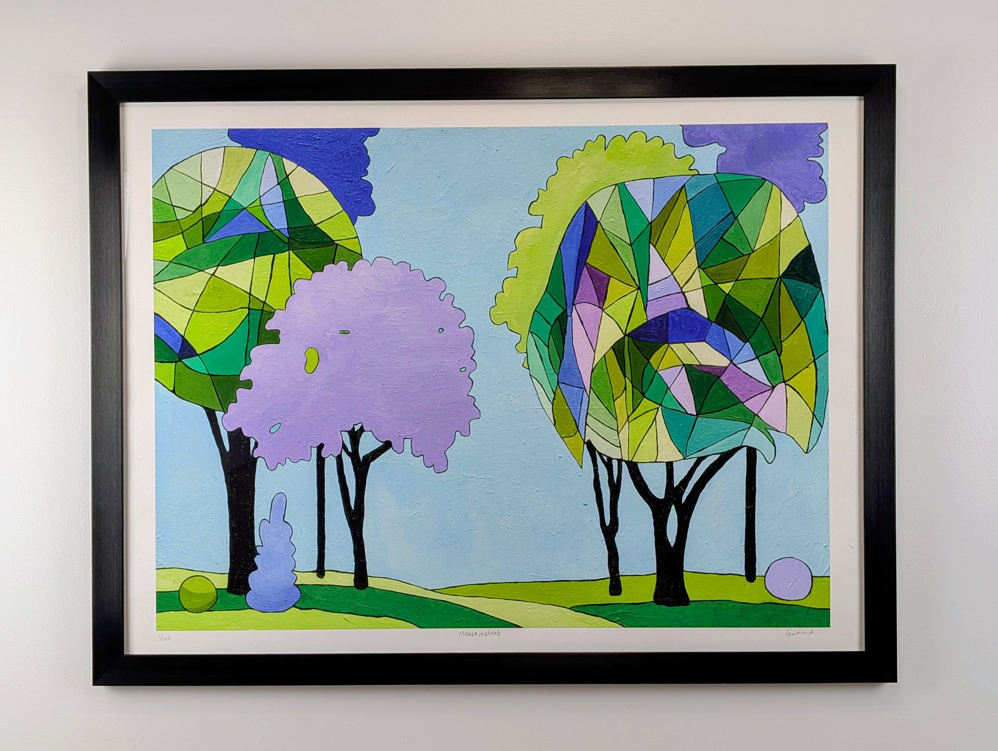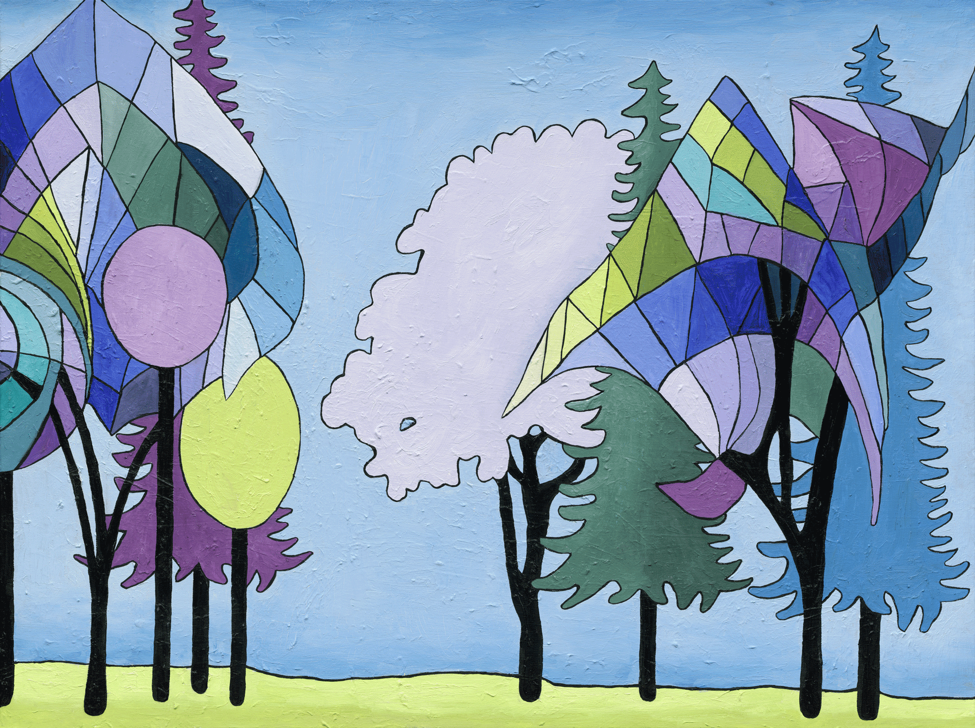 De los árboles estilizados, con hojas fragmentadas en formas geométricas, comienzan bajo un cielo suave y refinado. Sus siluetas negras contrastan con una paleta vibrante de azul, verduras y mauvas, creando un equilibrio sutil entre la estructura y la ligereza. Algunos picos parecen doblarse bajo el efecto del viento, acentuando la impresión de un paisaje en la transformación perpetua.