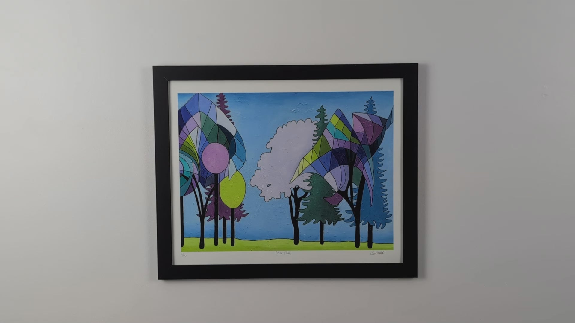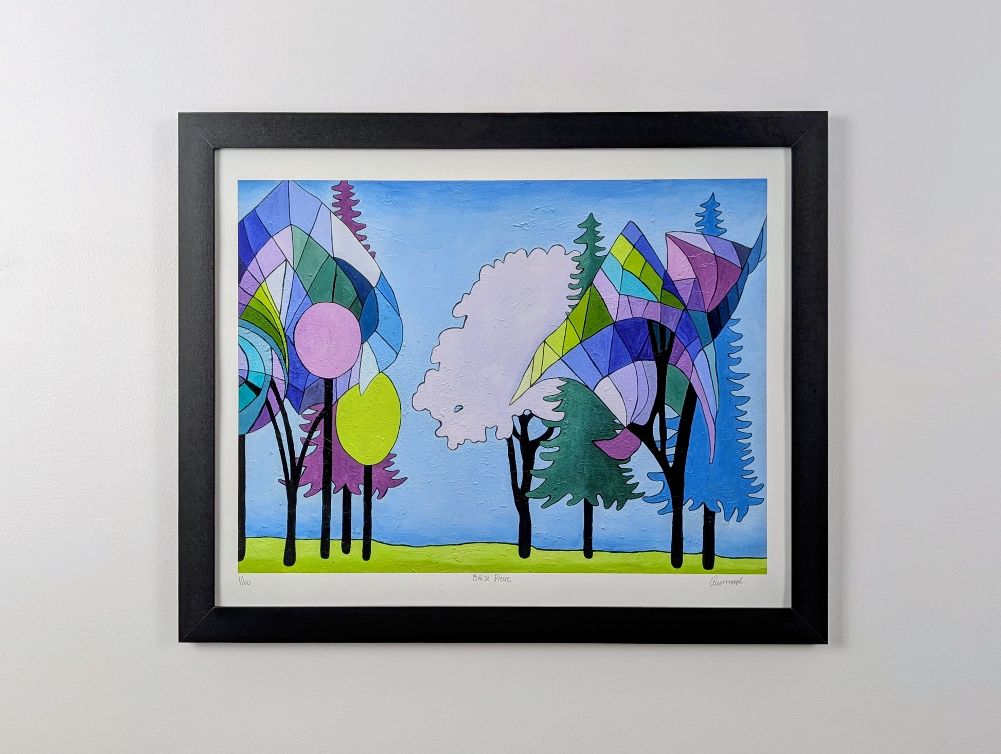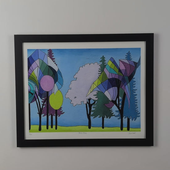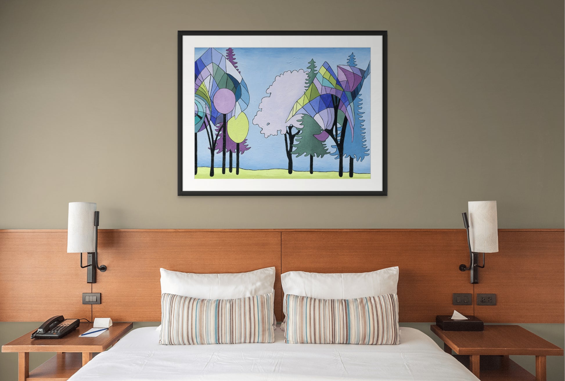 De los árboles estilizados, con hojas fragmentadas en formas geométricas, comienzan bajo un cielo suave y refinado. Sus siluetas negras contrastan con una paleta vibrante de azul, verduras y mauvas, creando un equilibrio sutil entre la estructura y la ligereza. Algunos picos parecen doblarse bajo el efecto del viento, acentuando la impresión de un paisaje en la transformación perpetua.