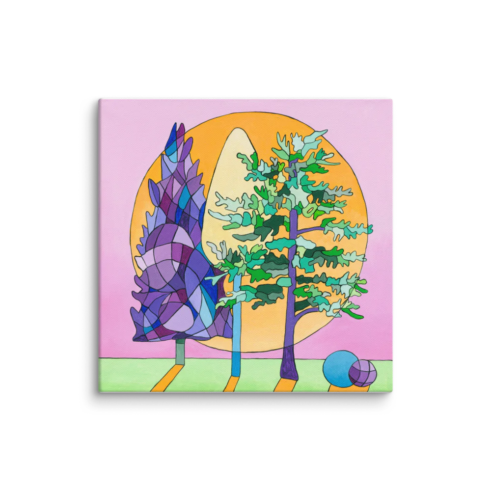 Éclat du Soir est une œuvre vibrante signée Guimond, où deux arbres stylisés, aux feuillages verts et violets, s’élèvent sous un soleil éclatant aux teintes dorées et chaleureuses.