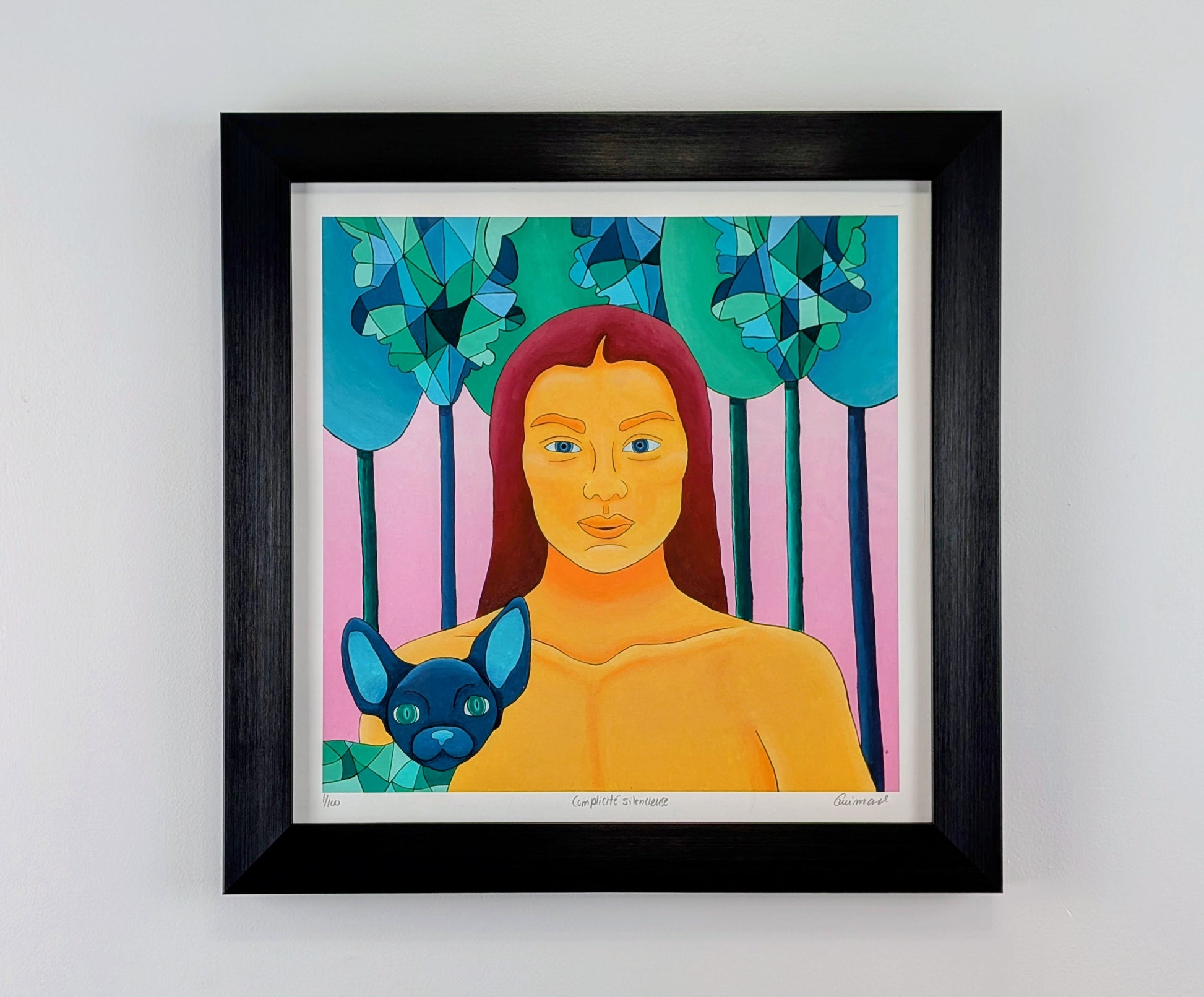 Complicidad silenciosa es un trabajo cautivador de Guimond, donde los humanos y los animales se encuentran en una mirada profunda e intensa. Una mujer con una mirada penetrante, con características dulces y asertivas, comparte espacio con un misterioso felino azul, como congelado en un momento suspendido.