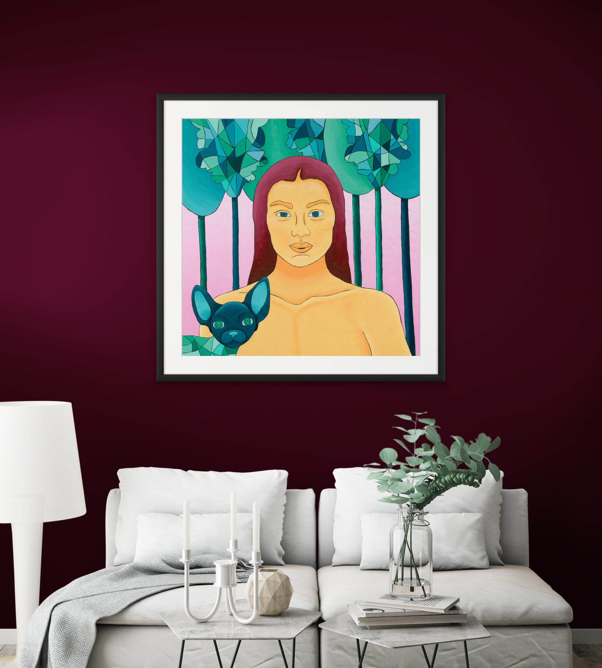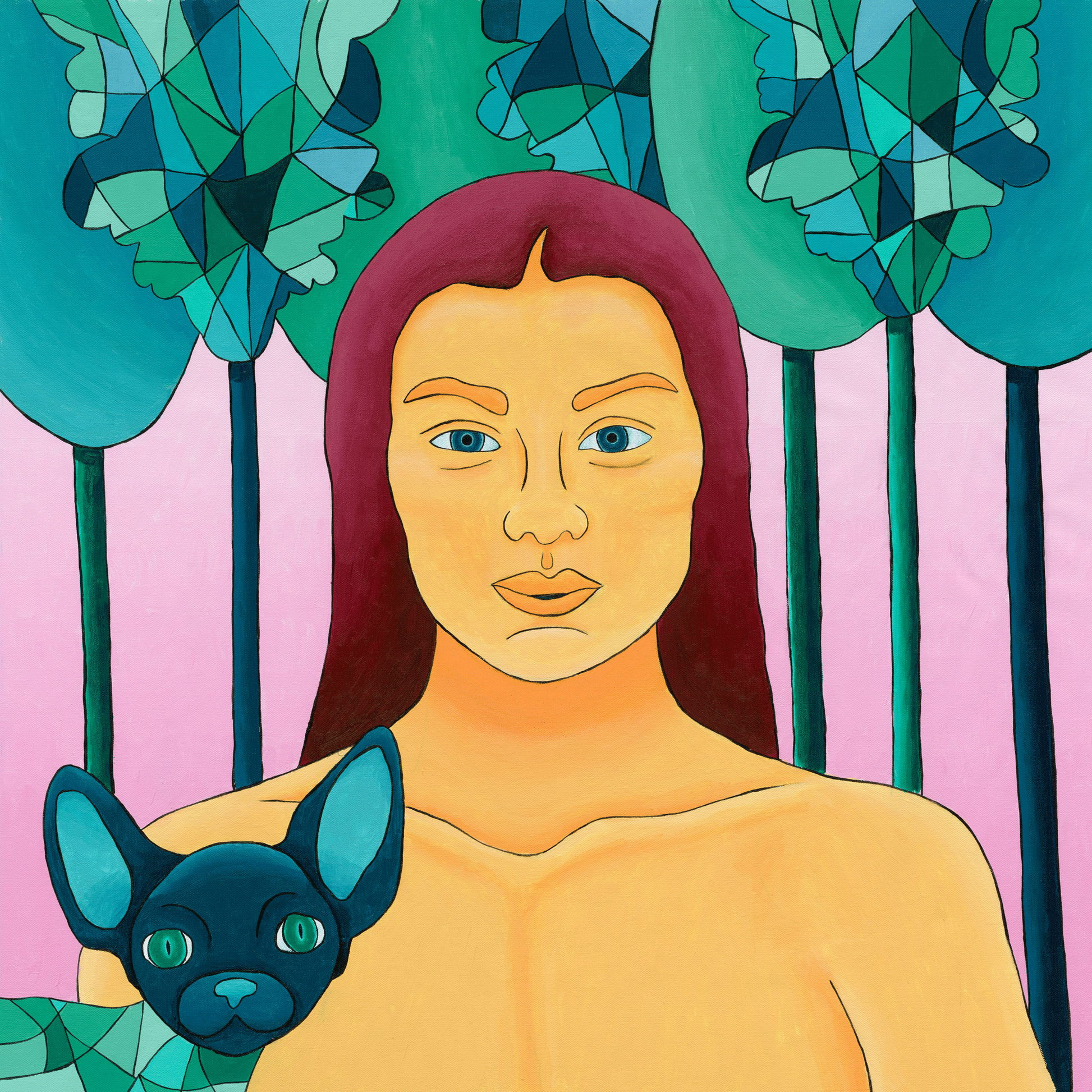 El fondo, compuesto de árboles estilizados con formas geométricas y tonos de verde y azul, crea un contraste sorprendente con la tez dorada del personaje y el delicado fondo rosado. Esta yuxtaposición de colores cálidos y fríos refuerza la intensidad emocional del trabajo, evocando tanto la serenidad como la conexión intuitiva entre los humanos y la naturaleza.