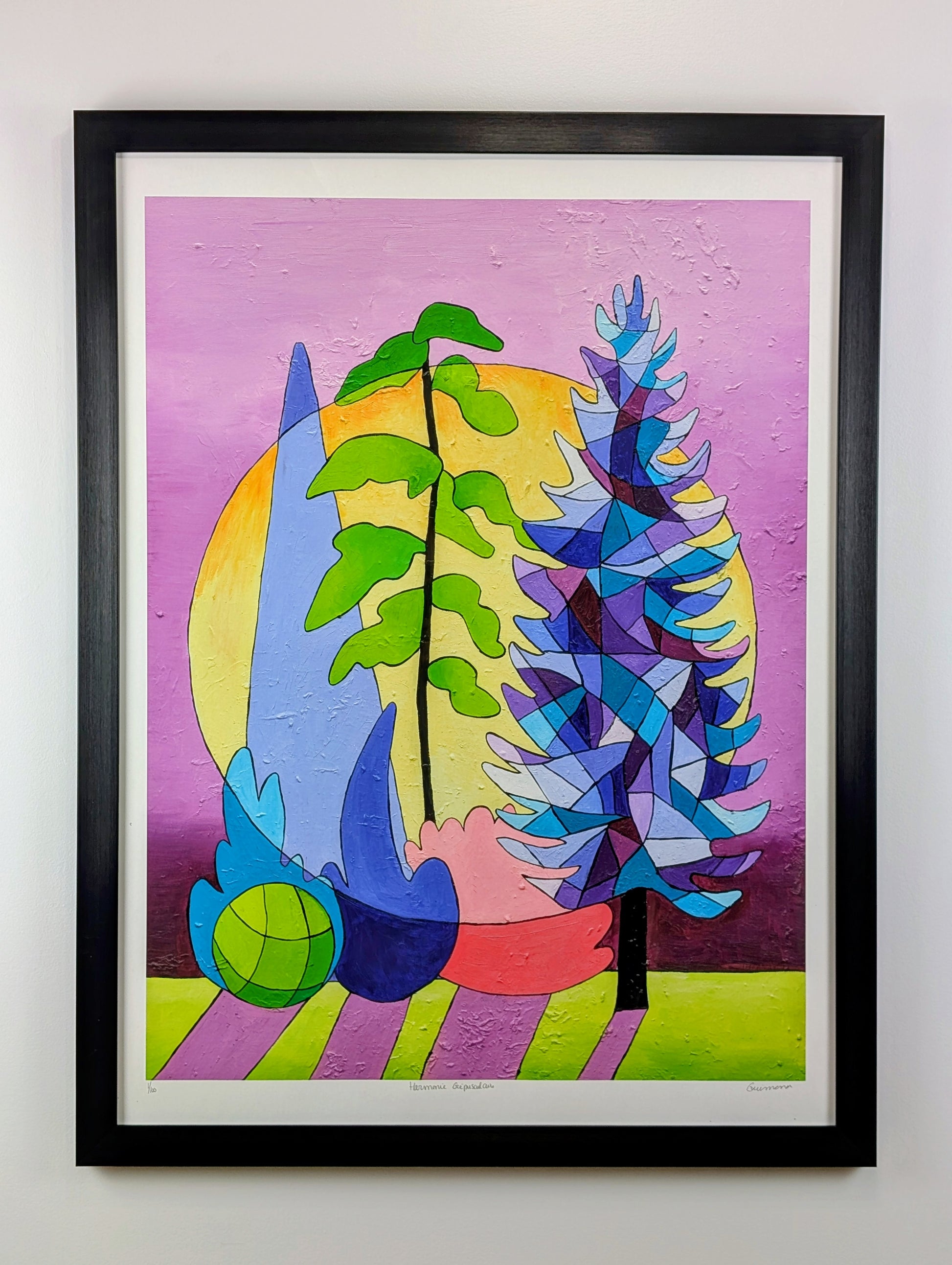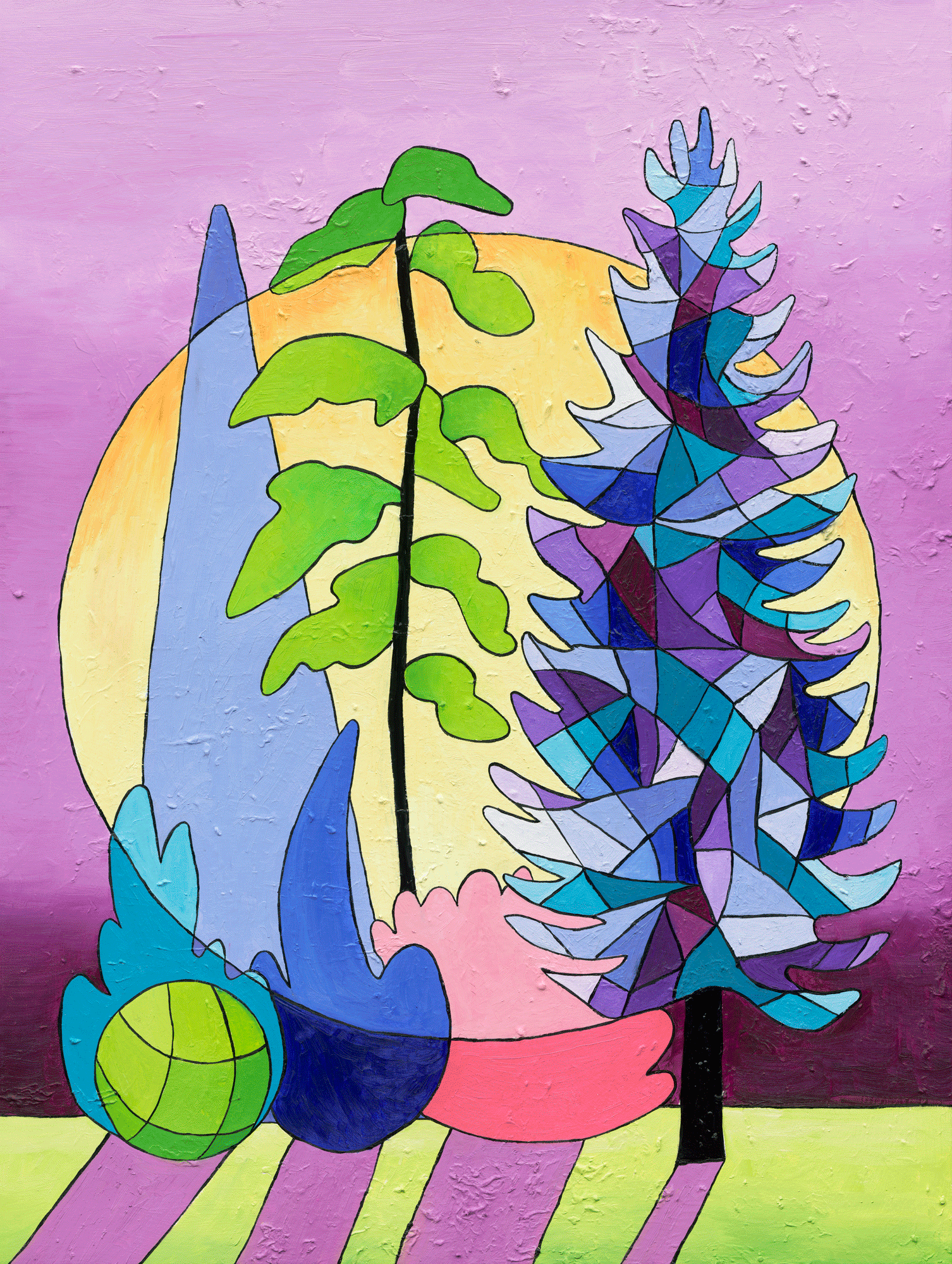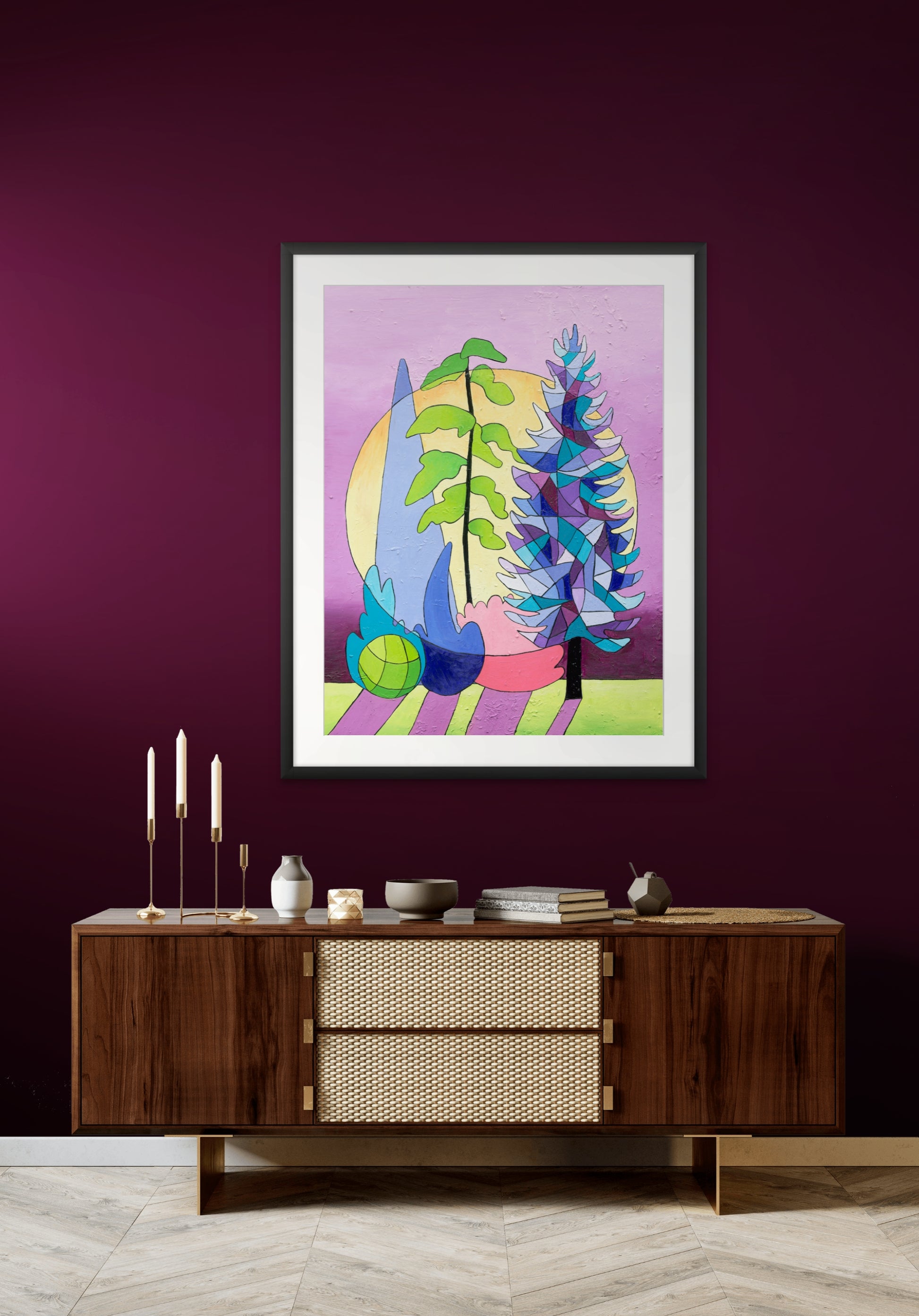 Los tonos de púrpura y rosa del cielo crean un llamativo contraste con el verde brillante del follaje y el azul profundo de los elementos abstractos en primer plano. El equilibrio entre las líneas fluidas y las formas angulares le da a toda una dinámica visual, que evoca un mundo que es real e imaginario.