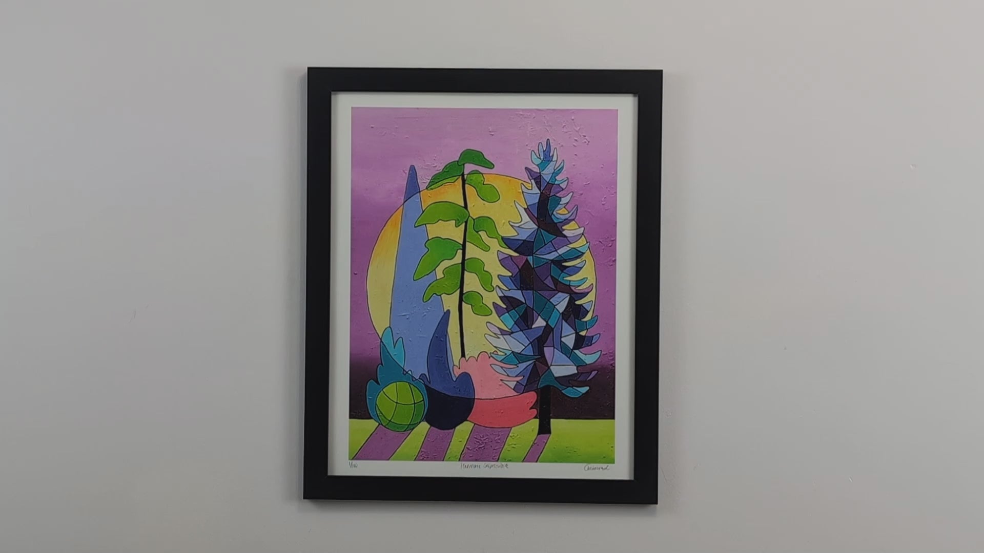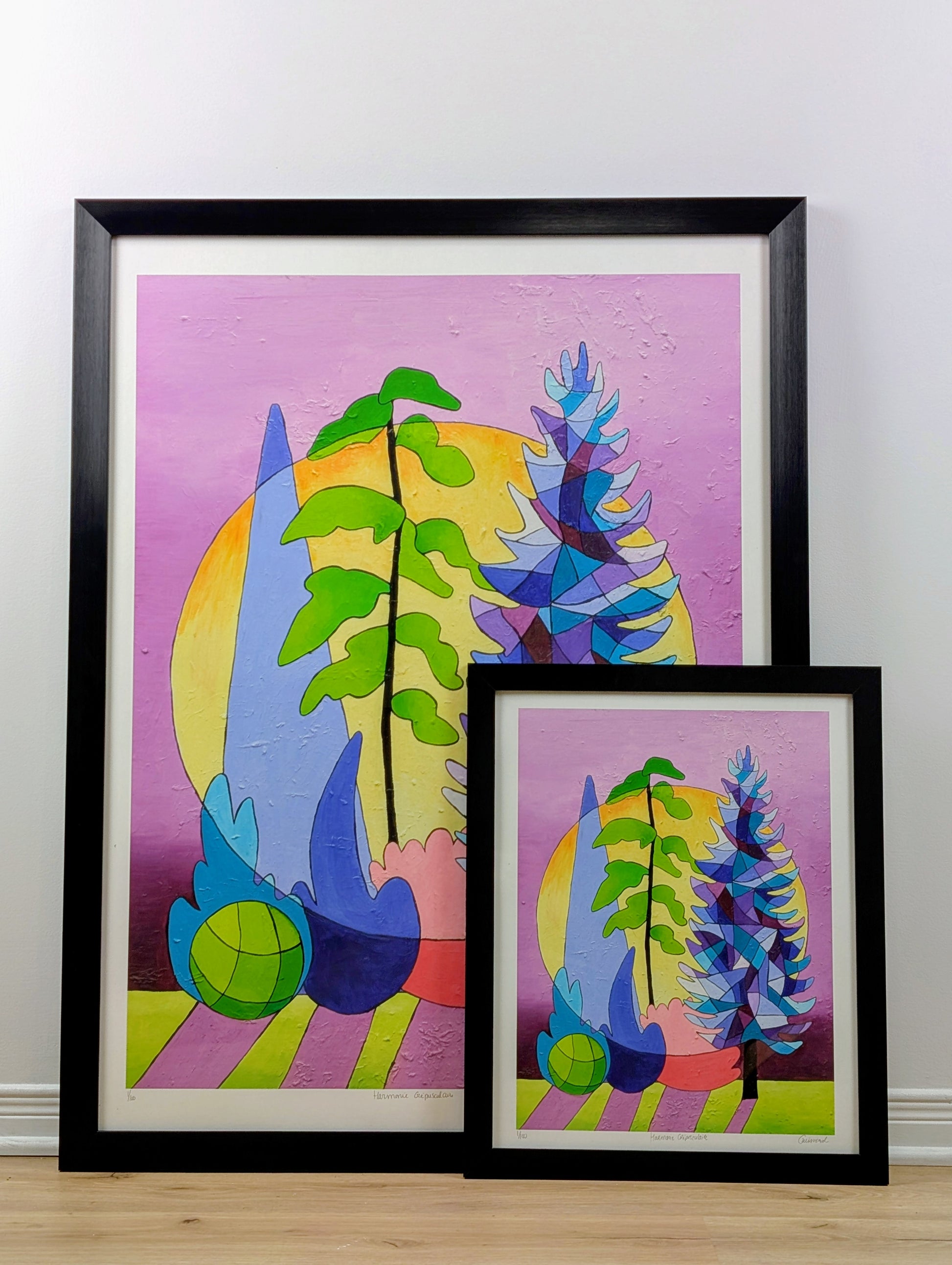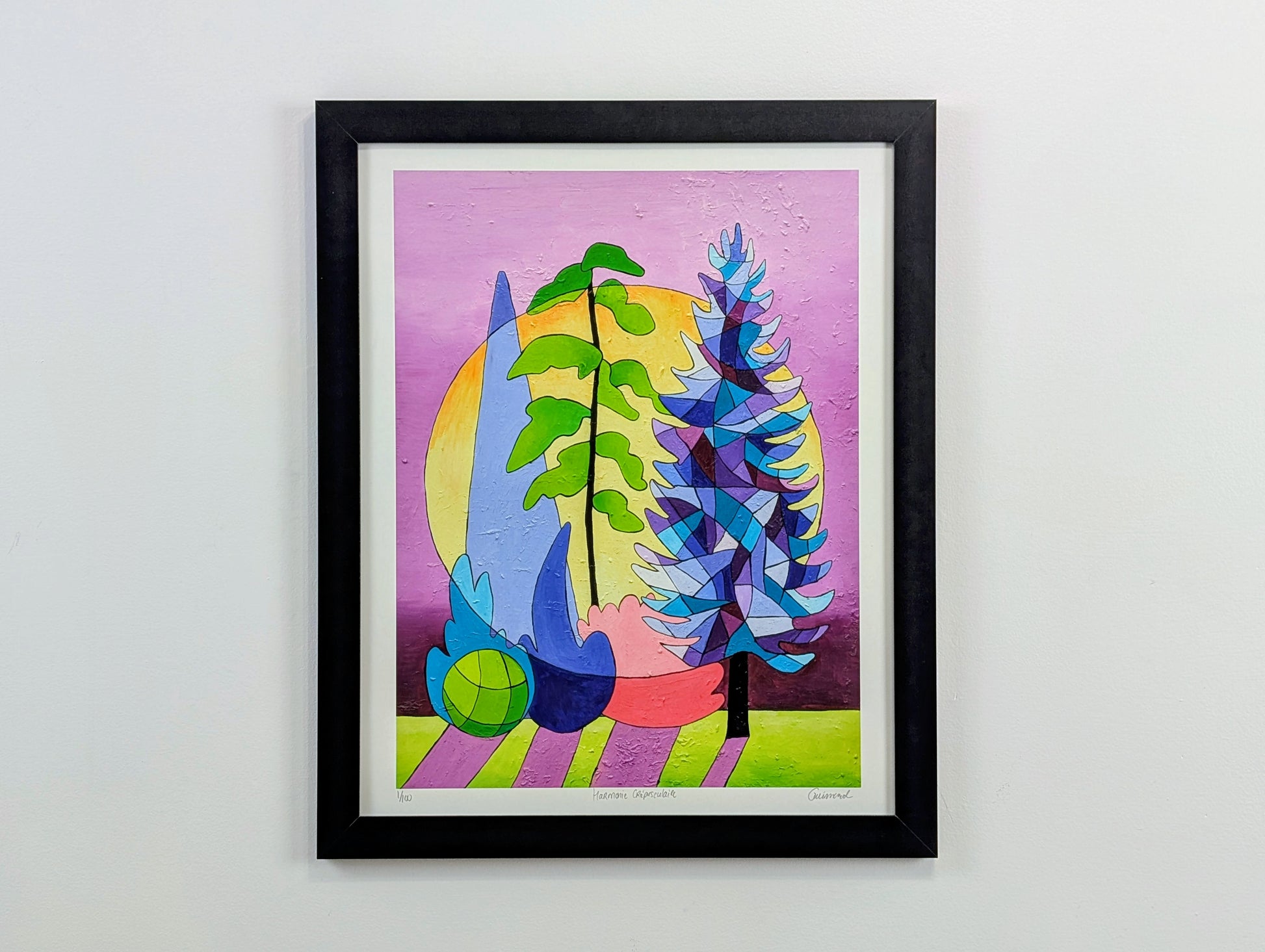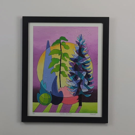 Los tonos de púrpura y rosa del cielo crean un llamativo contraste con el verde brillante del follaje y el azul profundo de los elementos abstractos en primer plano. El equilibrio entre las líneas fluidas y las formas angulares le da a toda una dinámica visual, que evoca un mundo que es real e imaginario.