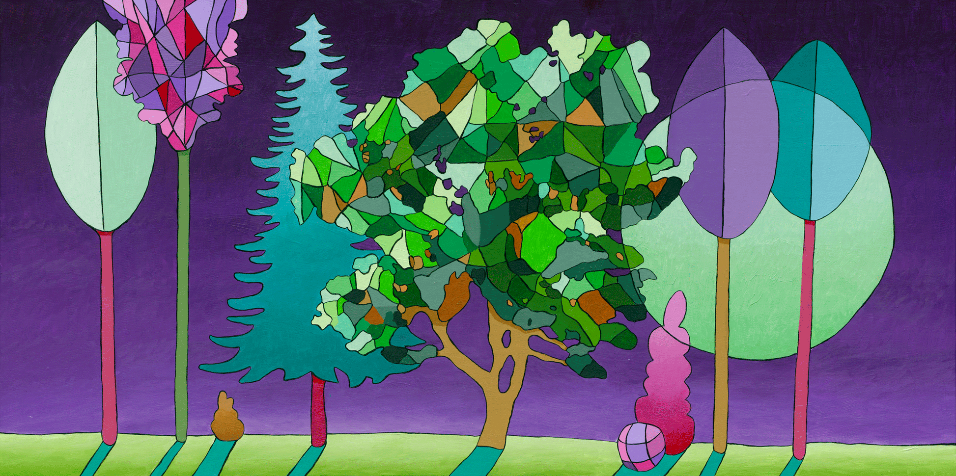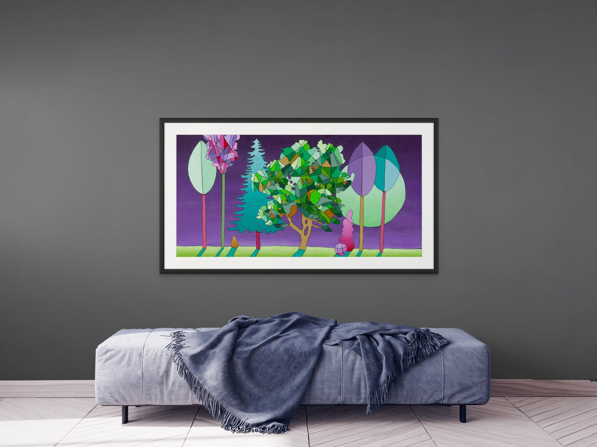 Sumergirse en Crepúsculo, un trabajo vibrante e inmersivo de Guimond. Esta escena presenta un bosque estilizado donde los árboles geométricos y coloridos se elevan bajo un cielo morado profundo, evocando los últimos momentos de crepúsculo. Los vibrantes tonos verdes de follaje contrastan maravillosamente con los tonos más suaves de rosa y morado, creando una armonía visual cautivadora.