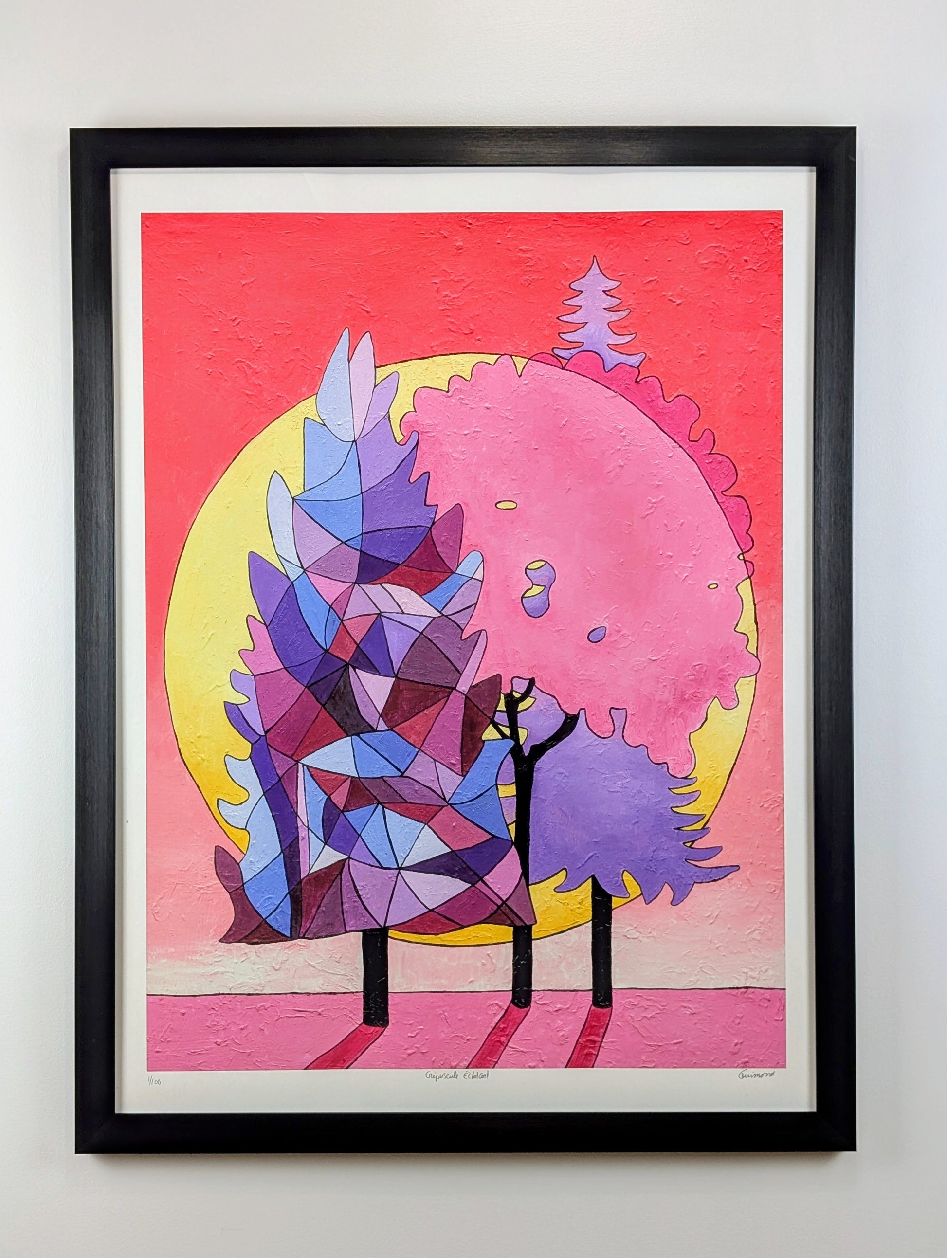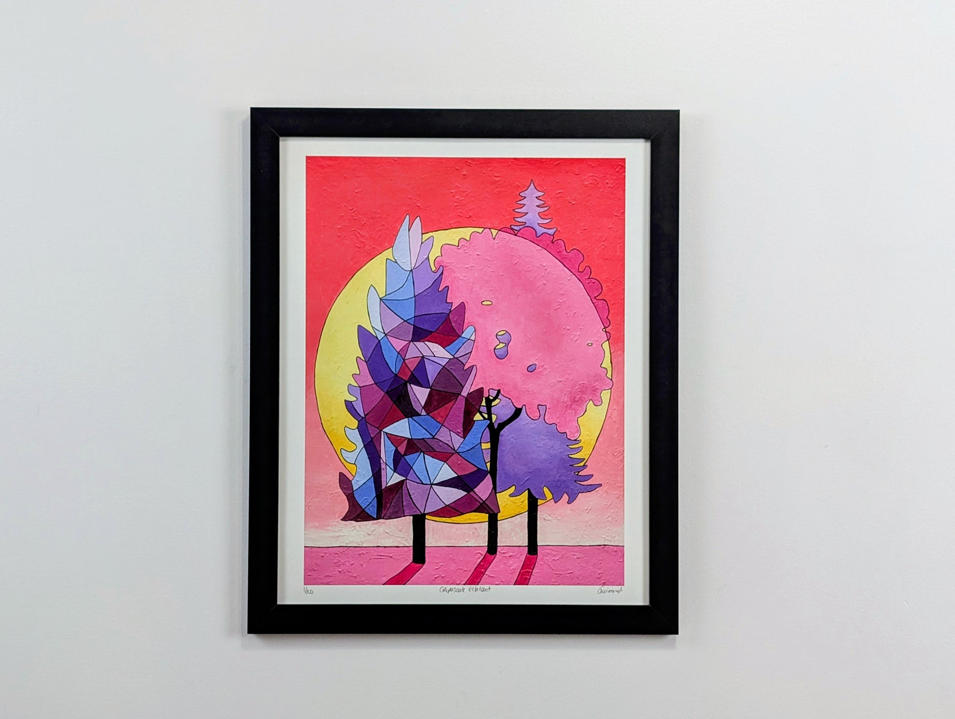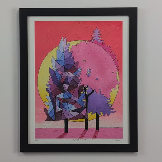 Crepúsculo brillante es una obra vibrante de Guimond, donde la naturaleza está adornada con colores intensos y hechizantes. Los árboles estilizados, en tonos de púrpura, rosa y azul, se elevan frente a un protector solar brillante, proyectando sus sombras en un piso bañado en colores calientes y suaves.