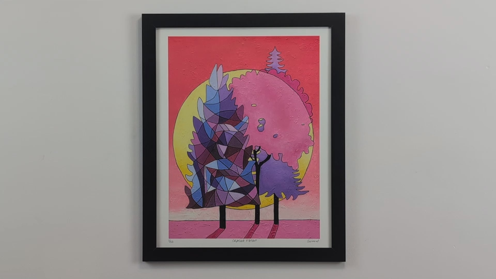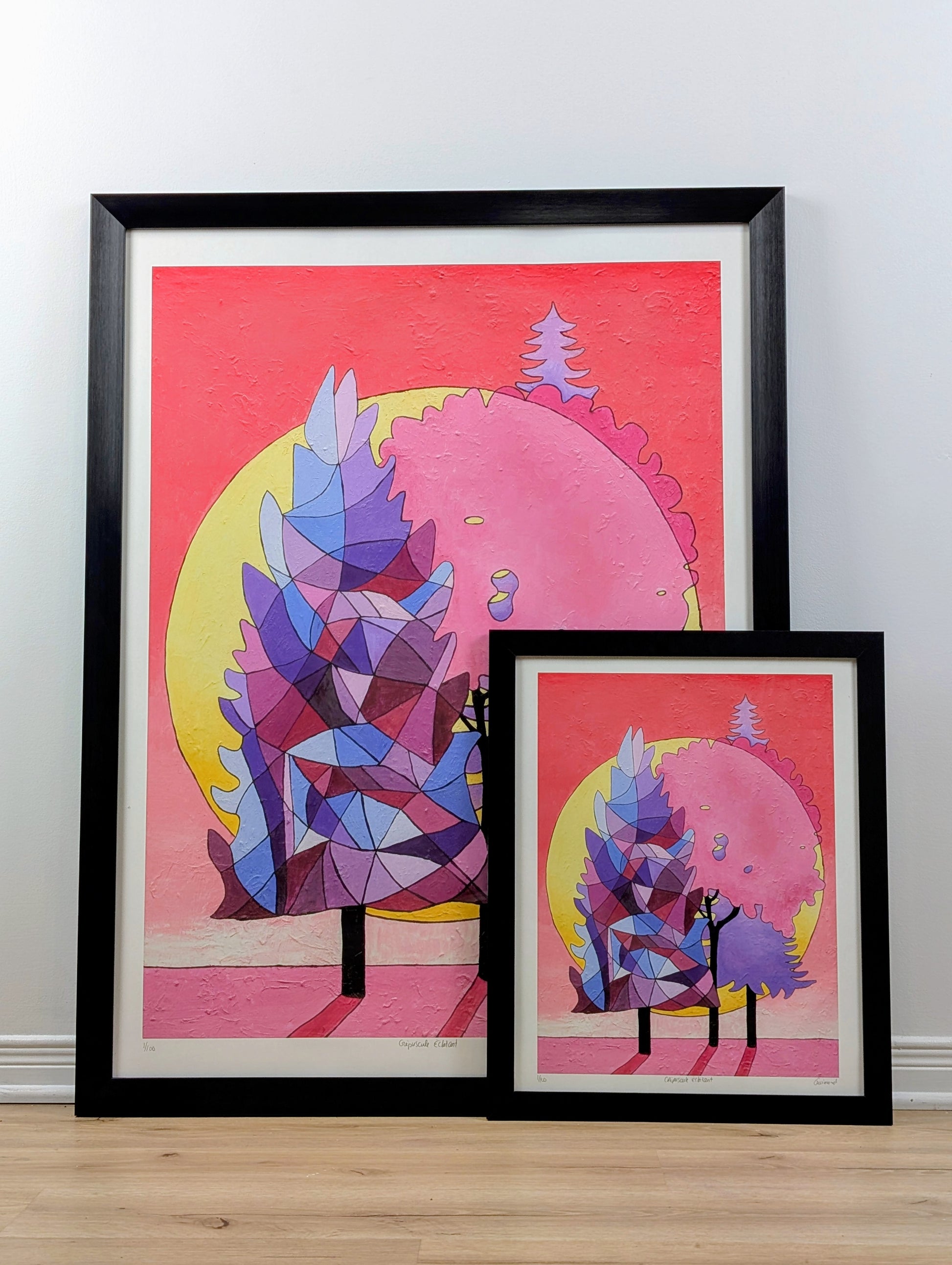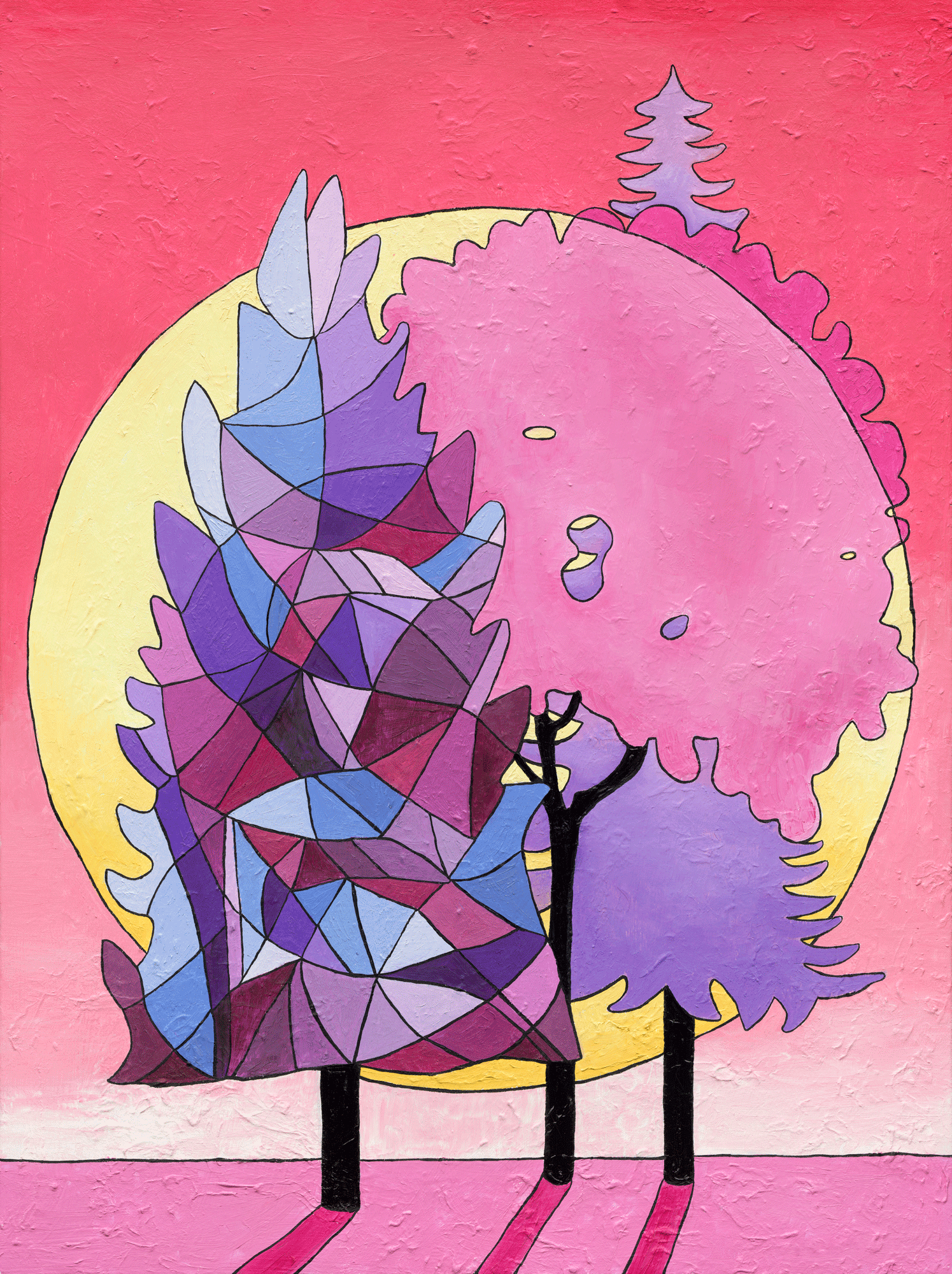 Crepúsculo brillante es una obra vibrante de Guimond, donde la naturaleza está adornada con colores intensos y hechizantes. Los árboles estilizados, en tonos de púrpura, rosa y azul, se elevan frente a un protector solar brillante, proyectando sus sombras en un piso bañado en colores calientes y suaves.