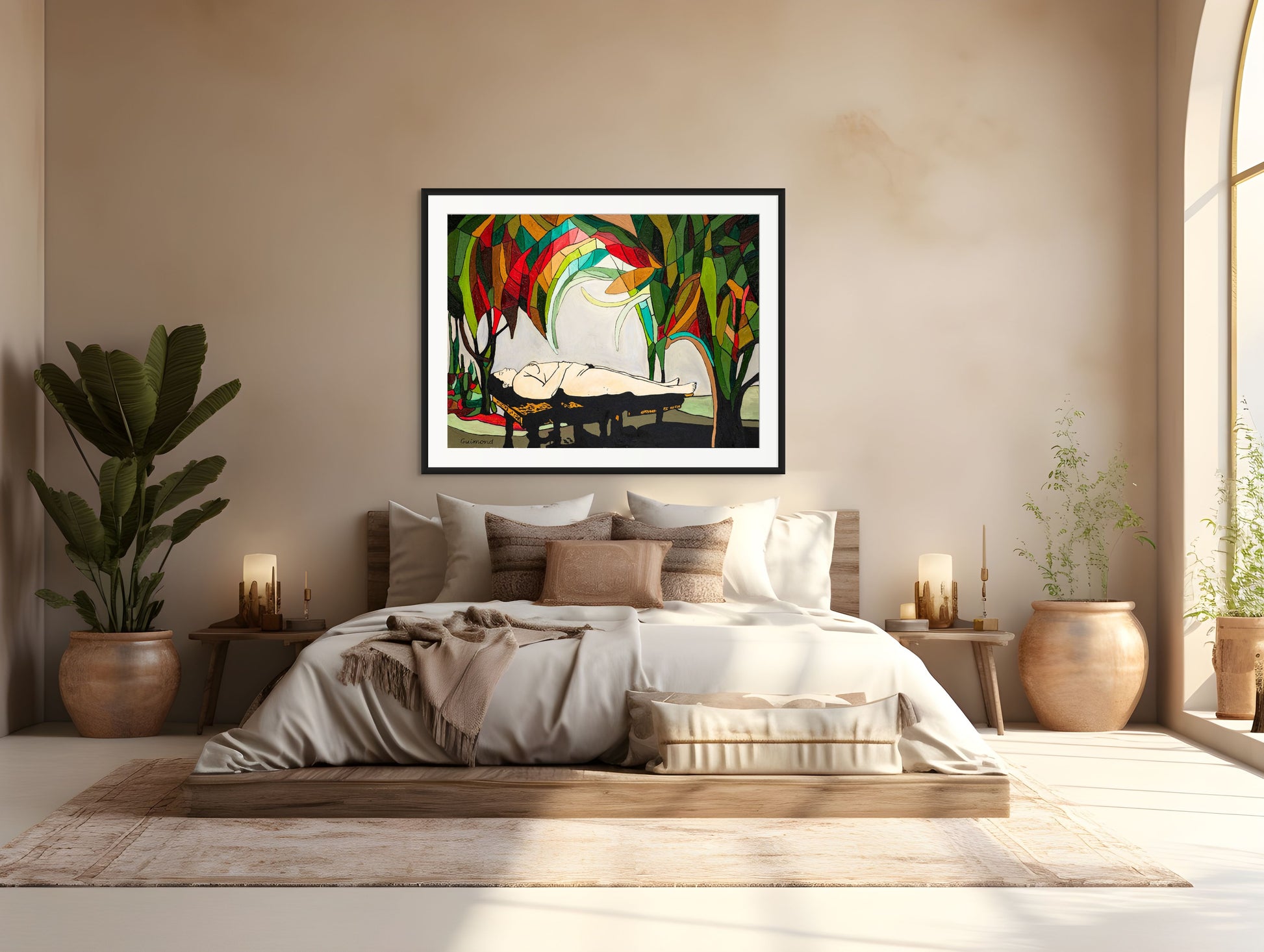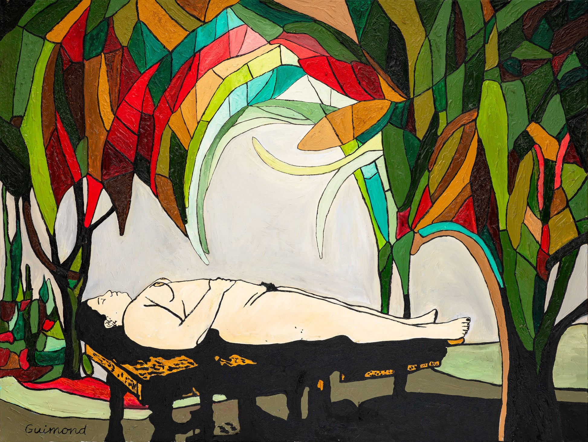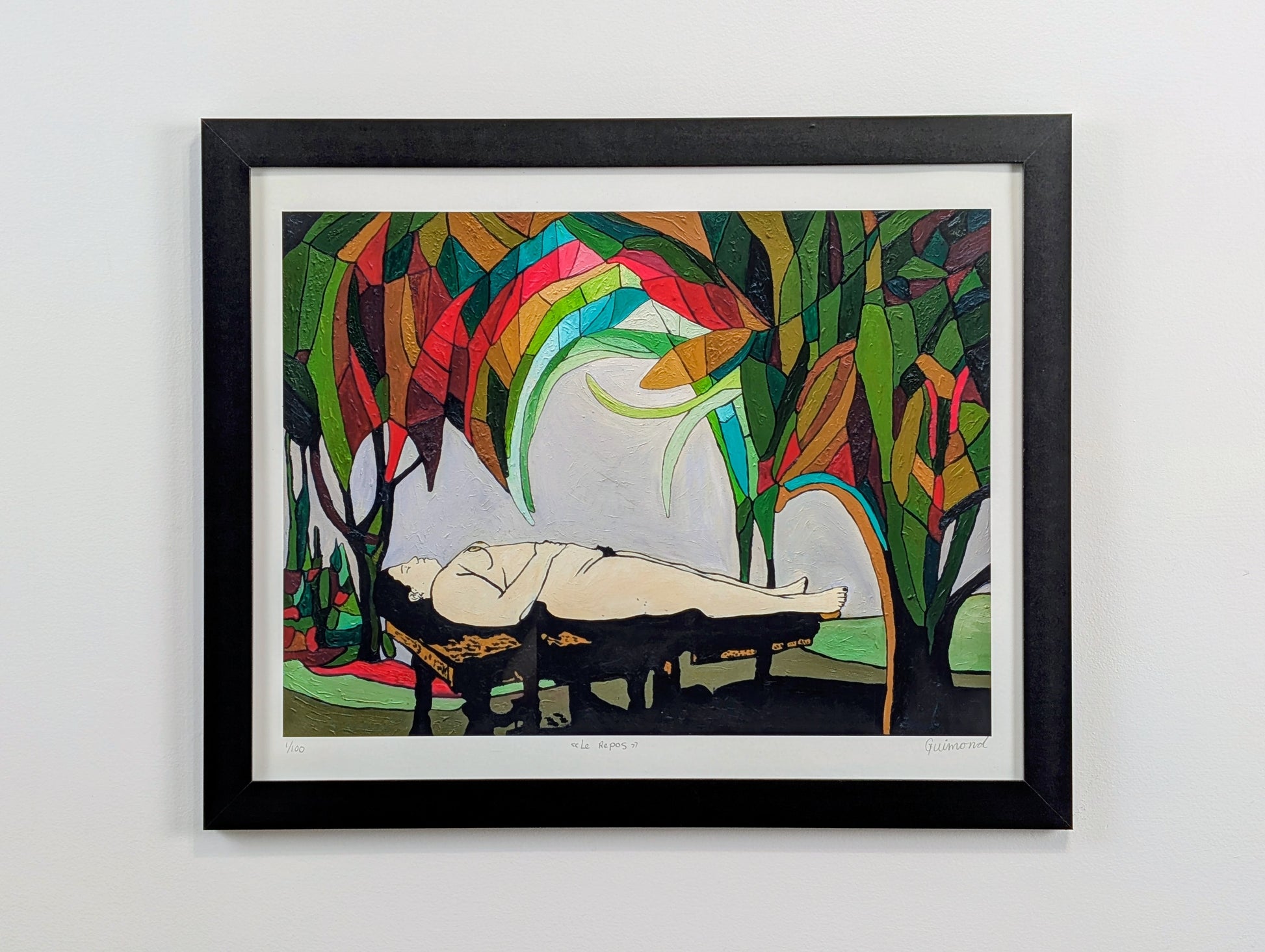 Sumergirse en Descansar, Una obra artística de Guimond, tanto relajante como vibrante. Esta creación transporta al espectador a un universo donde se encuentran la calma y la serenidad. La escena ilustra una figura humana que descansa pacíficamente en el corazón de un bosque en colores cálidos y vibrantes. Los tonos de rojo, verde y amarillo se mezclan armoniosamente, creando una atmósfera cálida y de ensueño.
