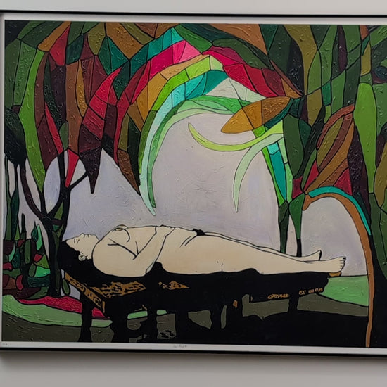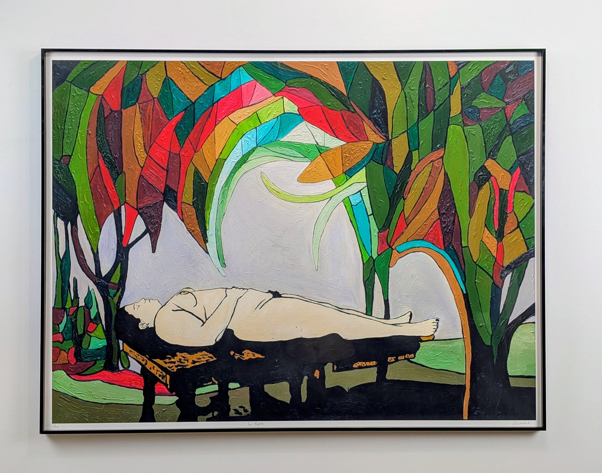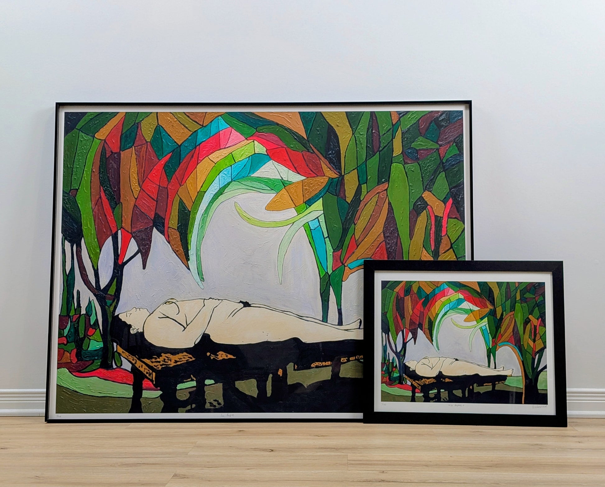 Sumergirse en Descansar, Una obra artística de Guimond, tanto relajante como vibrante. Esta creación transporta al espectador a un universo donde se encuentran la calma y la serenidad. La escena ilustra una figura humana que descansa pacíficamente en el corazón de un bosque en colores cálidos y vibrantes. Los tonos de rojo, verde y amarillo se mezclan armoniosamente, creando una atmósfera cálida y de ensueño.