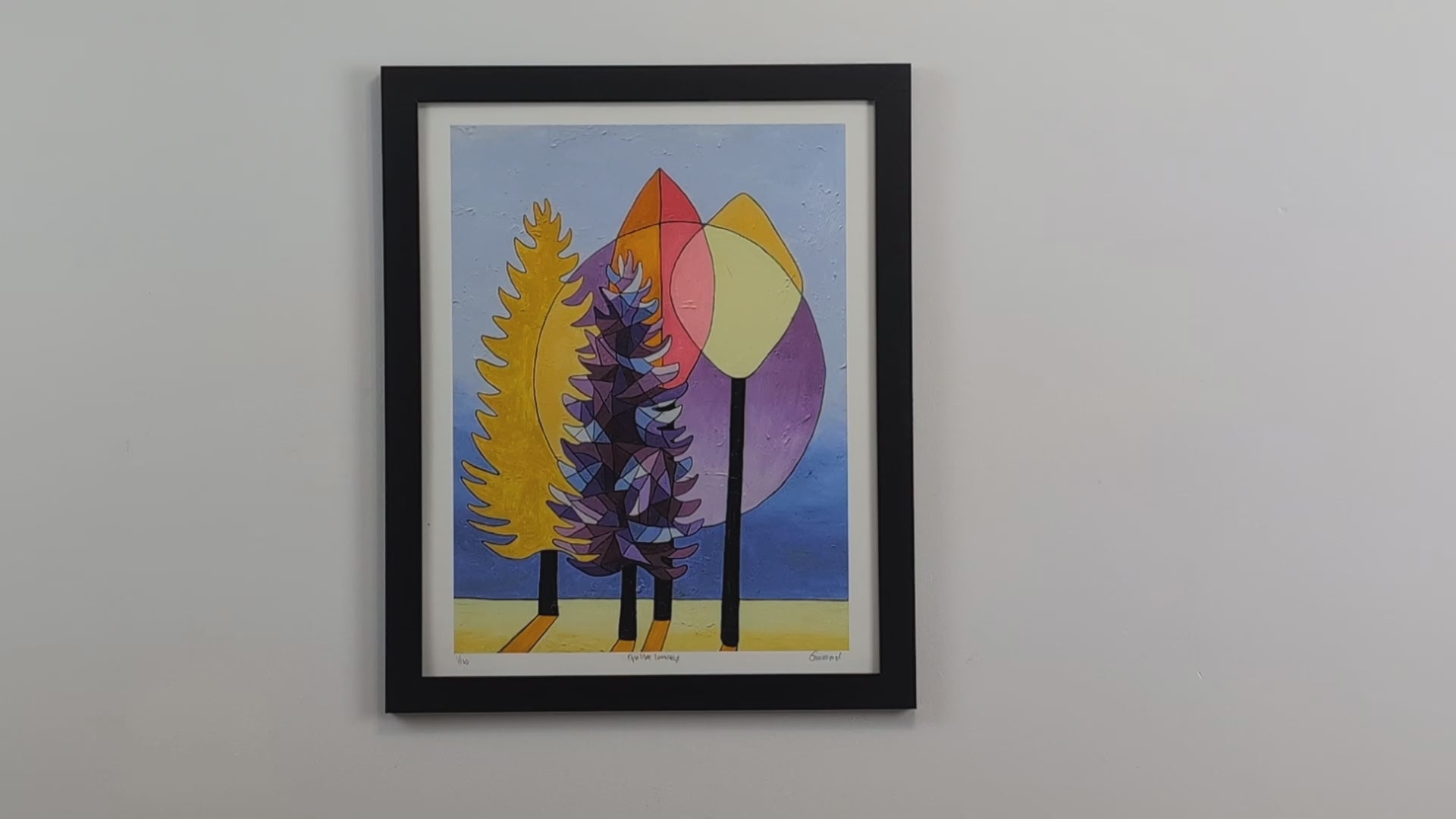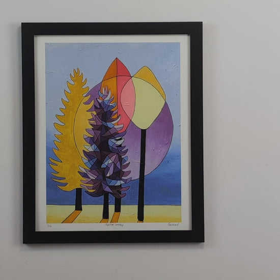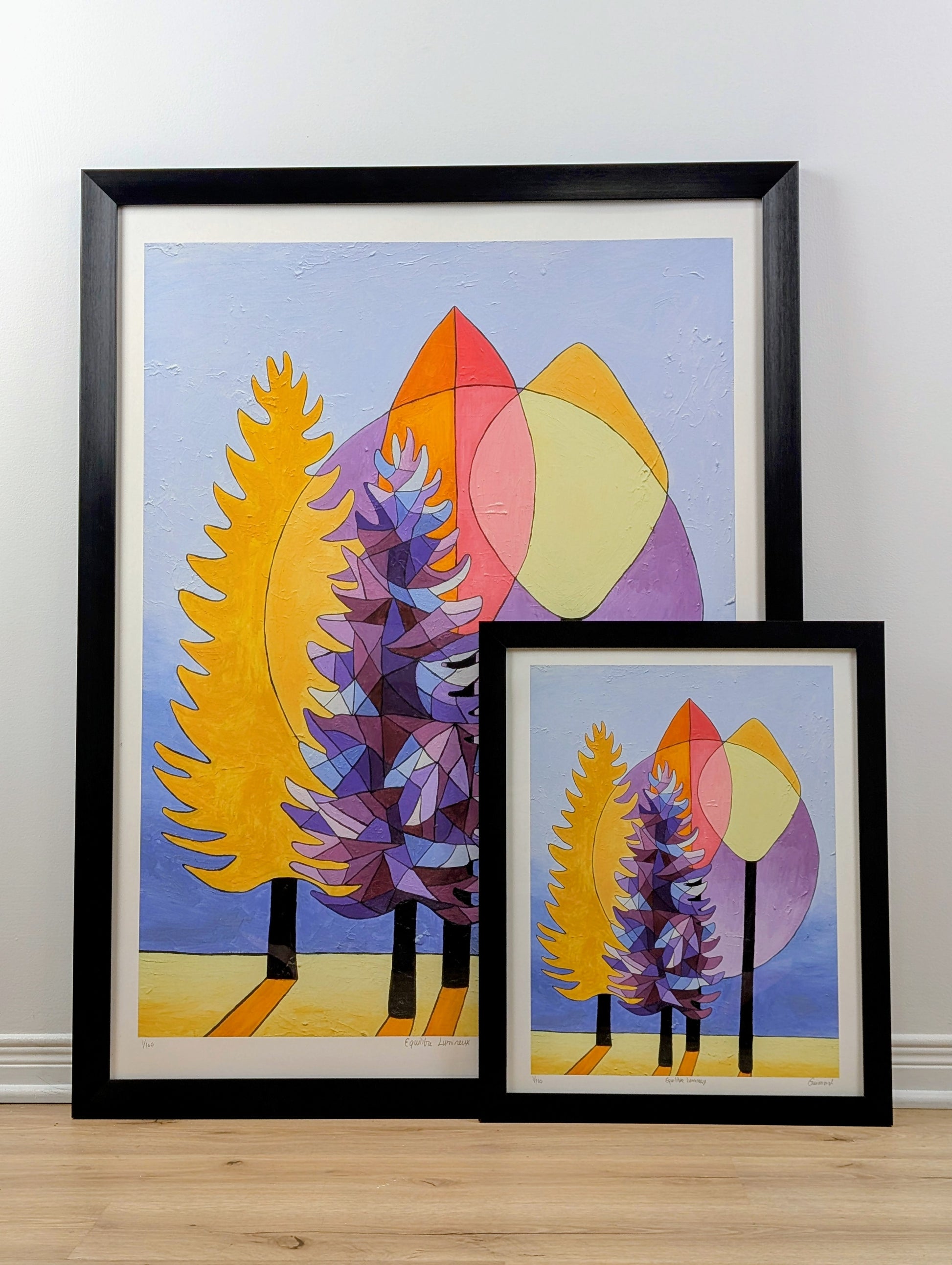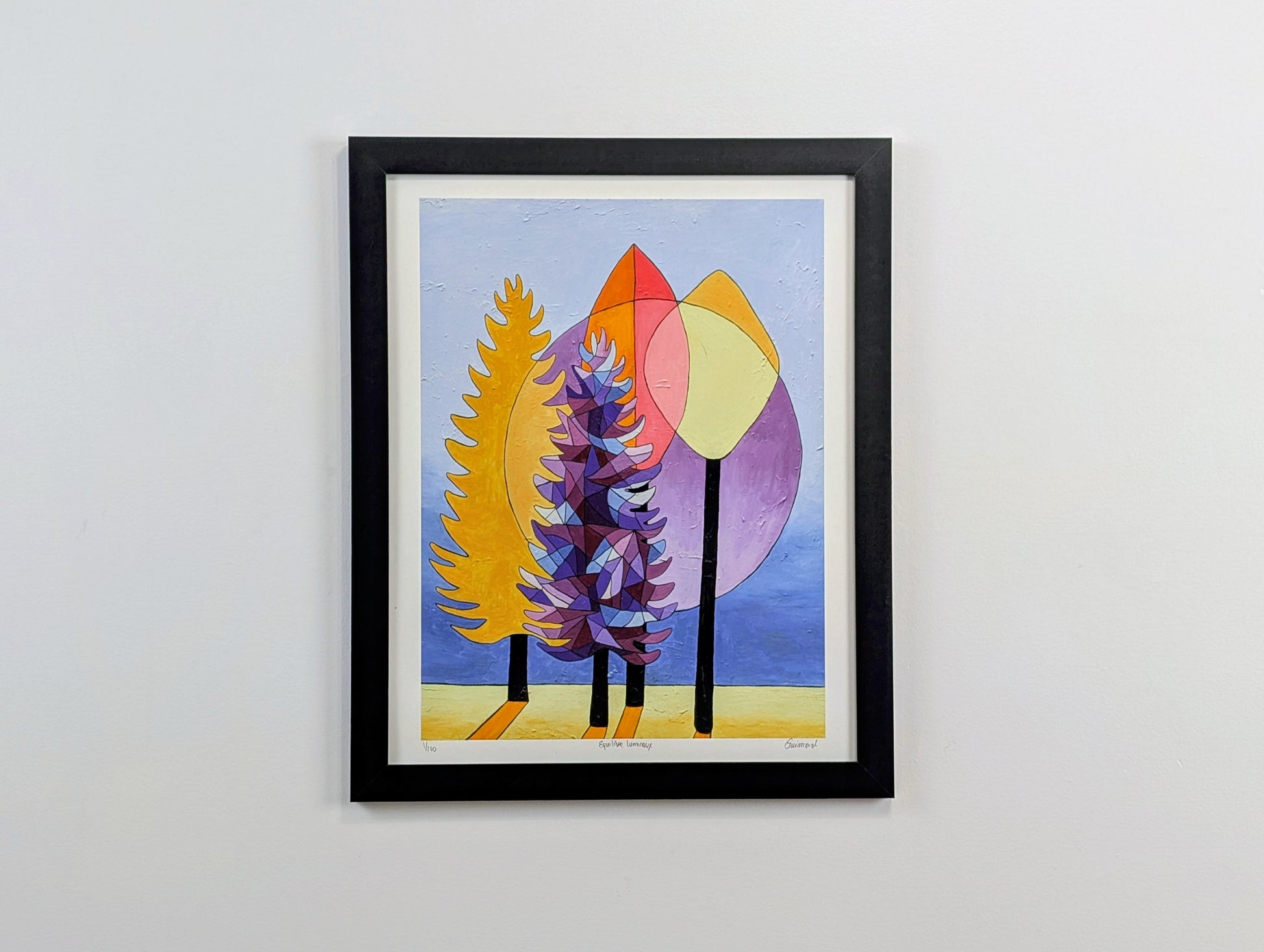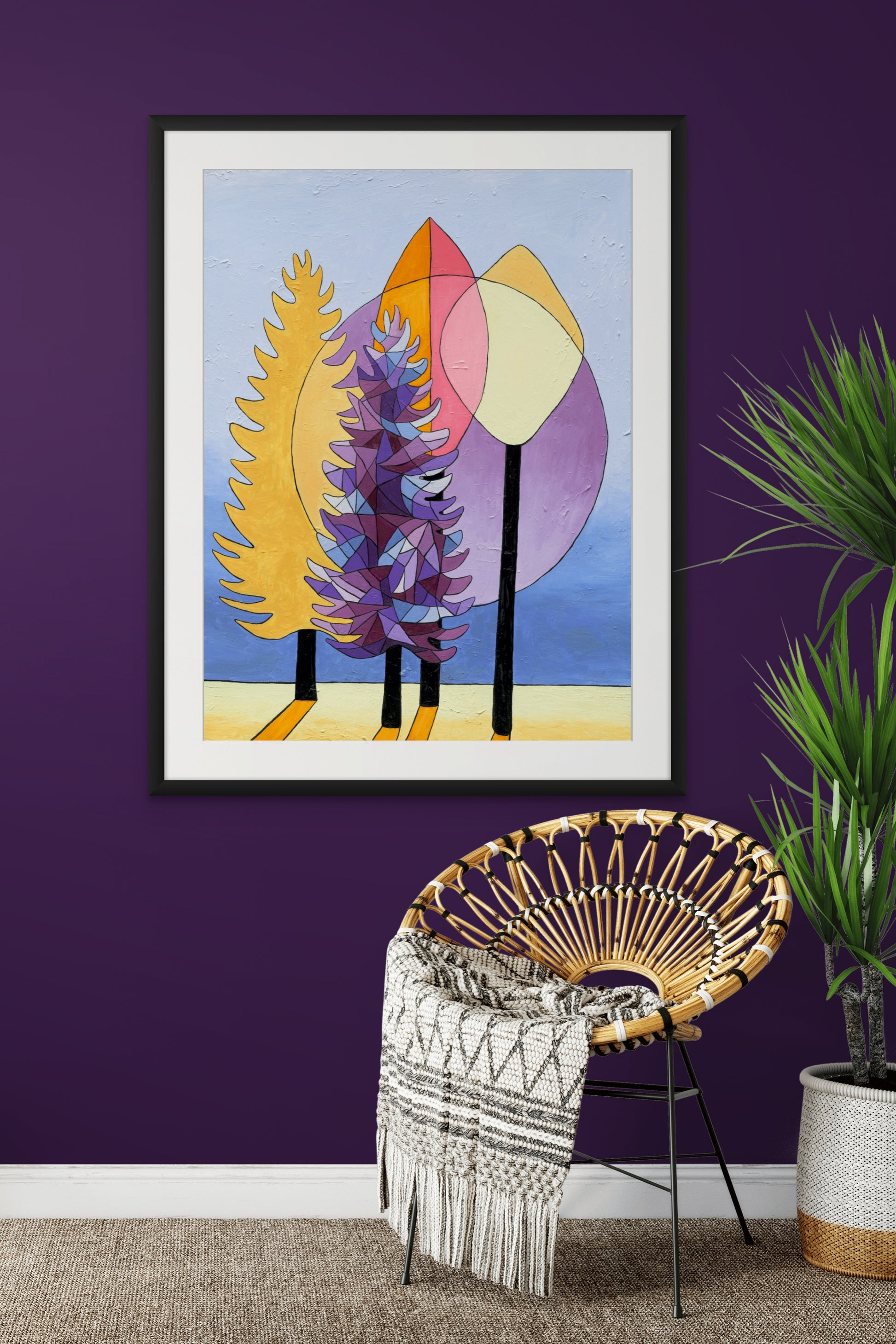 Los tonos dorados y naranjas se mezclan con profundos tonos morados y azules, creando una composición dinámica y armoniosa. El juego de las sombras que se encuentran en el suelo acentúa la verticalidad de los árboles, fortaleciendo la presencia gráfica y la estructura geométrica del trabajo.