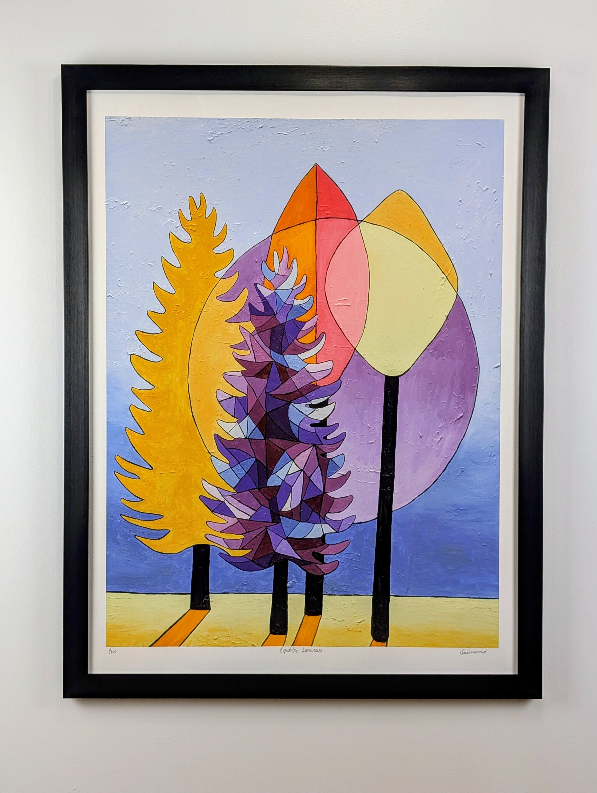 Equilibrio de la luz es una obra vibrante de Guimond, que juega con la dualidad entre la sombra y la luz, el calor y la frescura. Tres árboles estilizados, con siluetas contrastantes, se paran frente a un círculo luminoso que parece simbolizar la reunión del día y la noche.