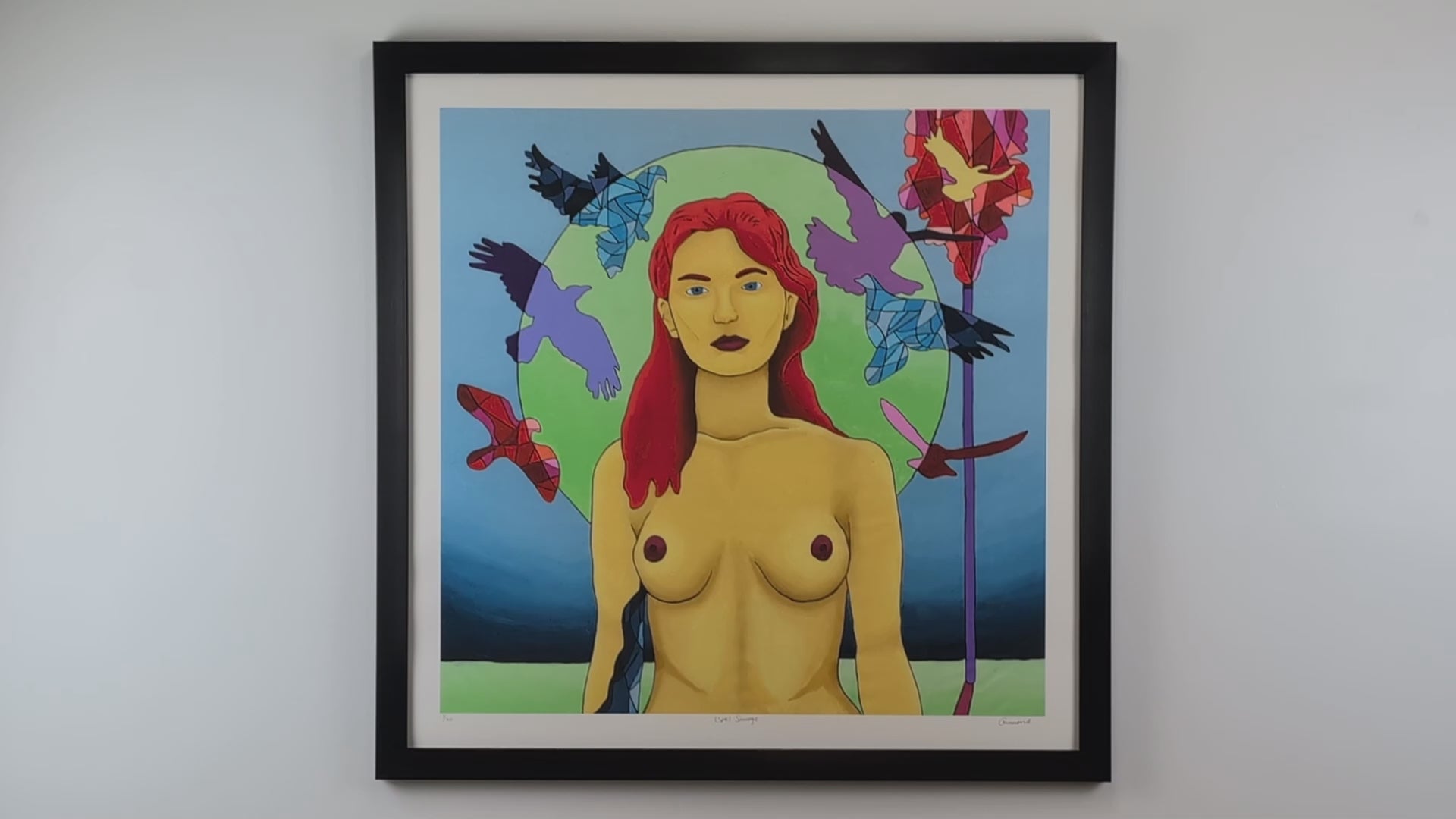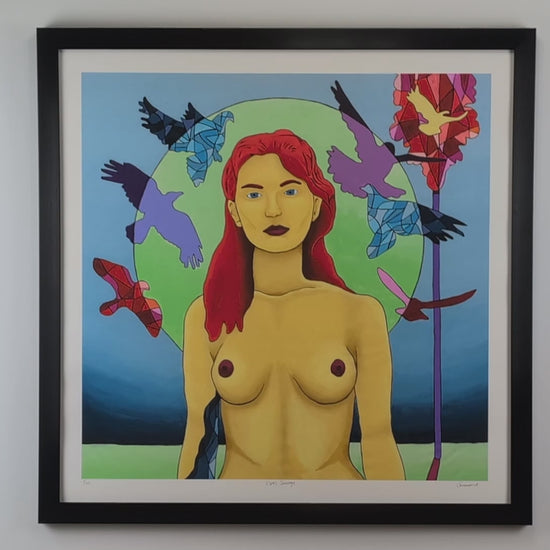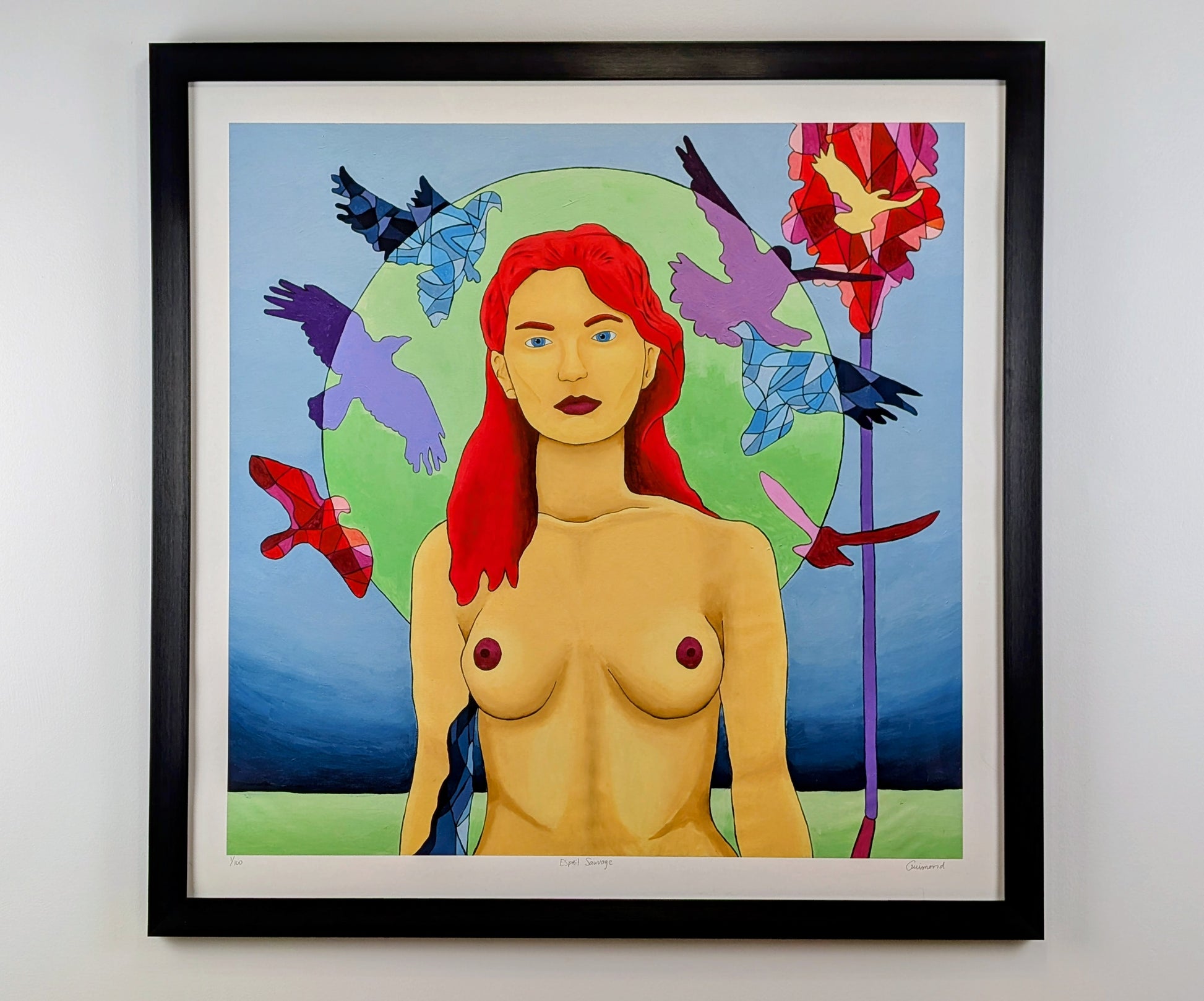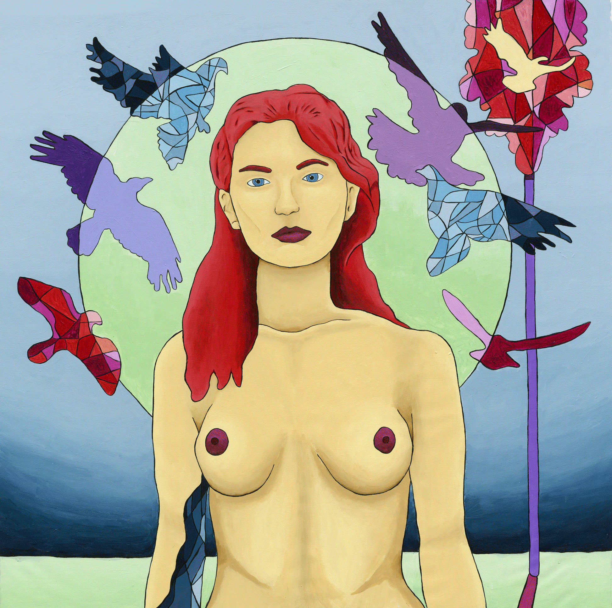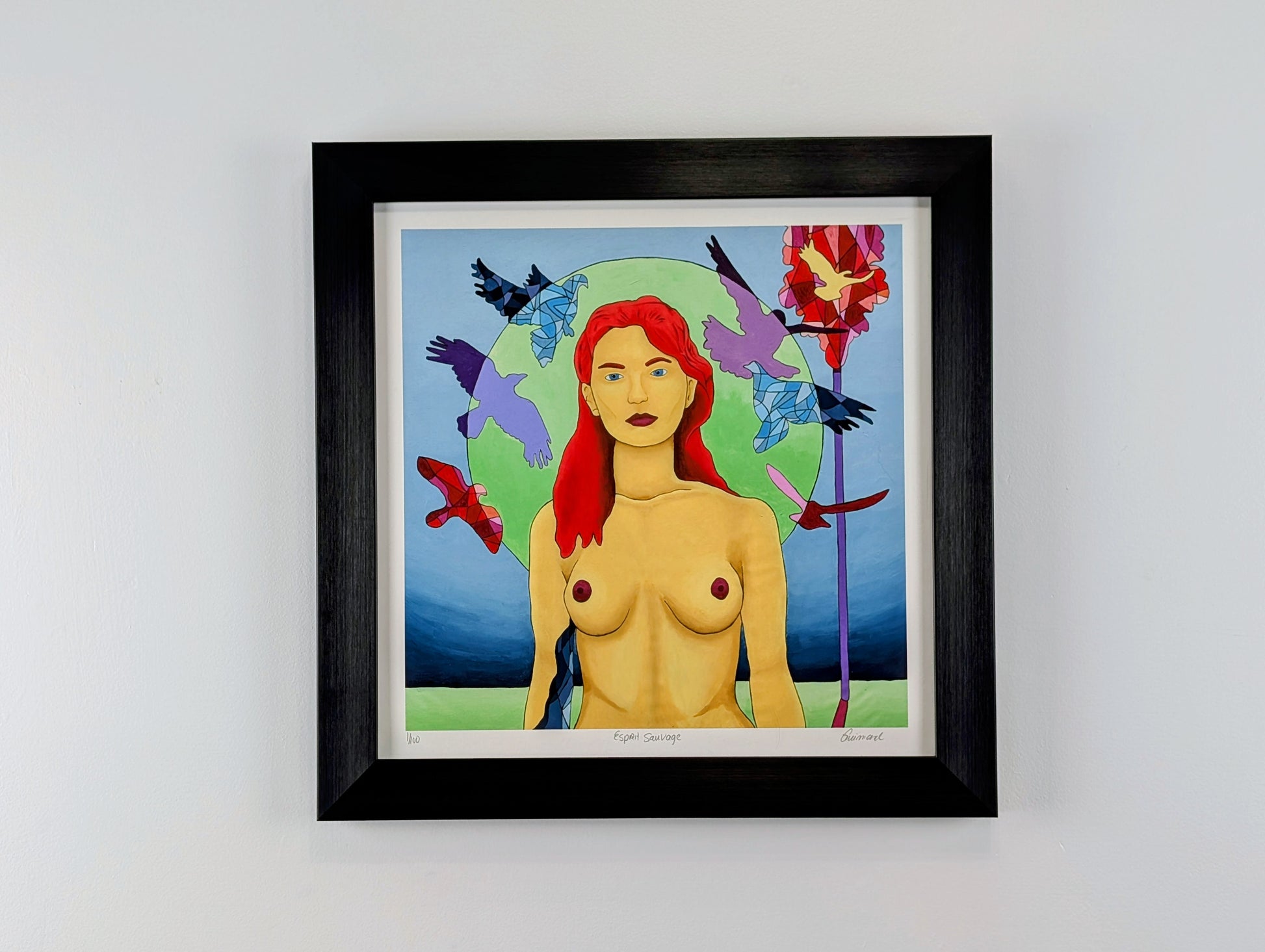En el centro de la composición, una mujer con cabello rojo extravagante se encuentra, inmóvil, con una mirada penetrante, imbuida de una serenidad poderosa. Su asumida desnudez, bañada a la luz, evoca una comunión profunda con el elemento natural que lo rodea. Su rostro, con rasgos asertivos y labios morados, fortalece este aura indomable y mística.