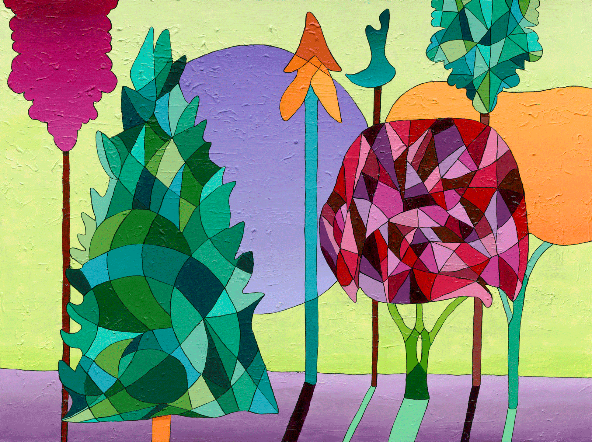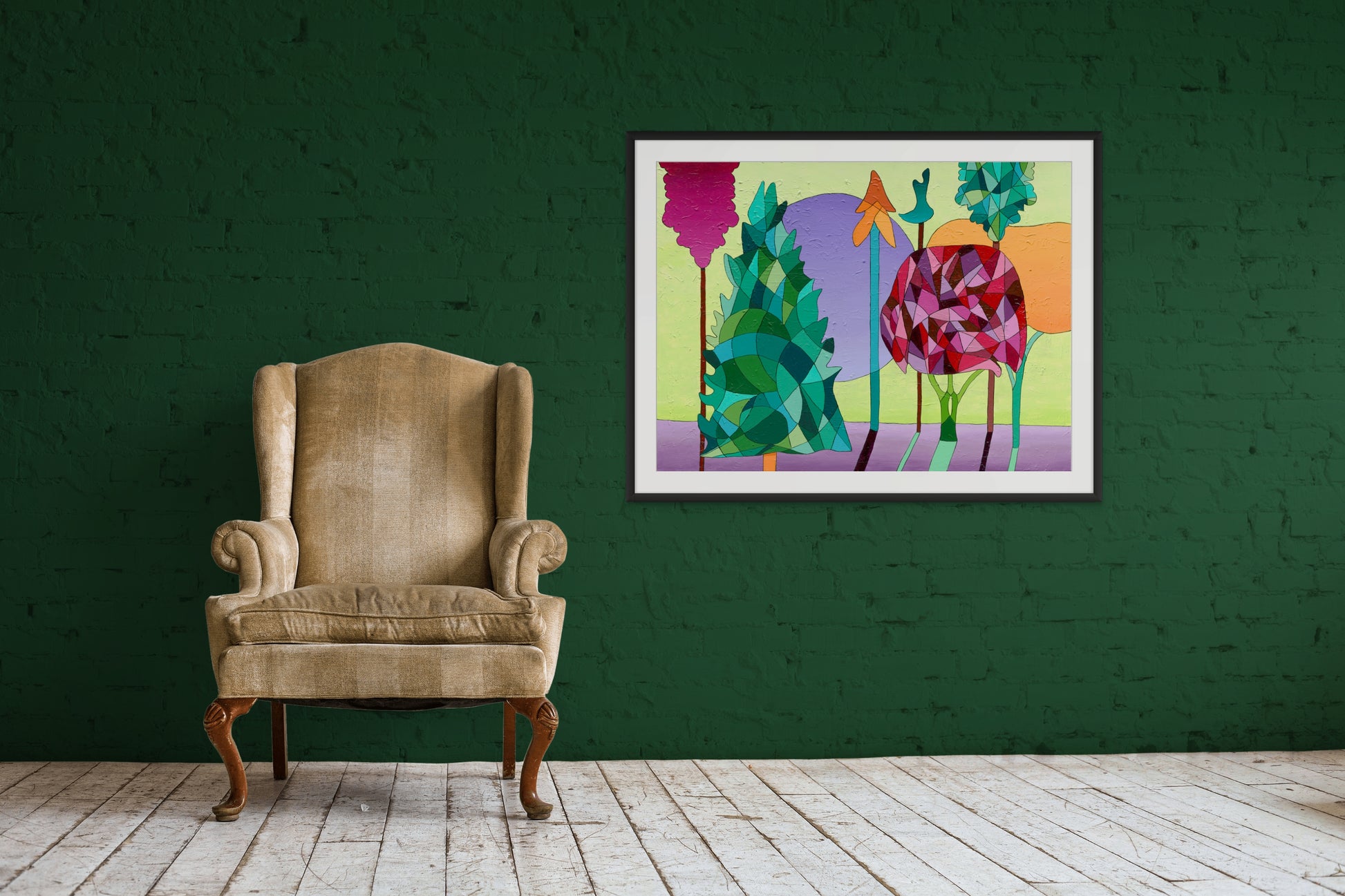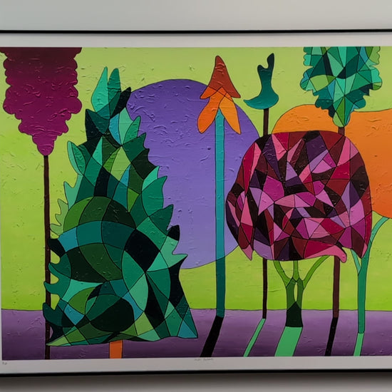 Jardín encantado es una celebración vibrante de la naturaleza y el color de Guimond. Esta composición tiene una variedad de árboles estilizados con formas geométricas únicas, bañadas en una luz suave y relajante. Los tonos verdes y azules del follaje se combinan armoniosamente con los tonos de rosa, rojo y naranja, creando un paisaje dinámico y cautivador.