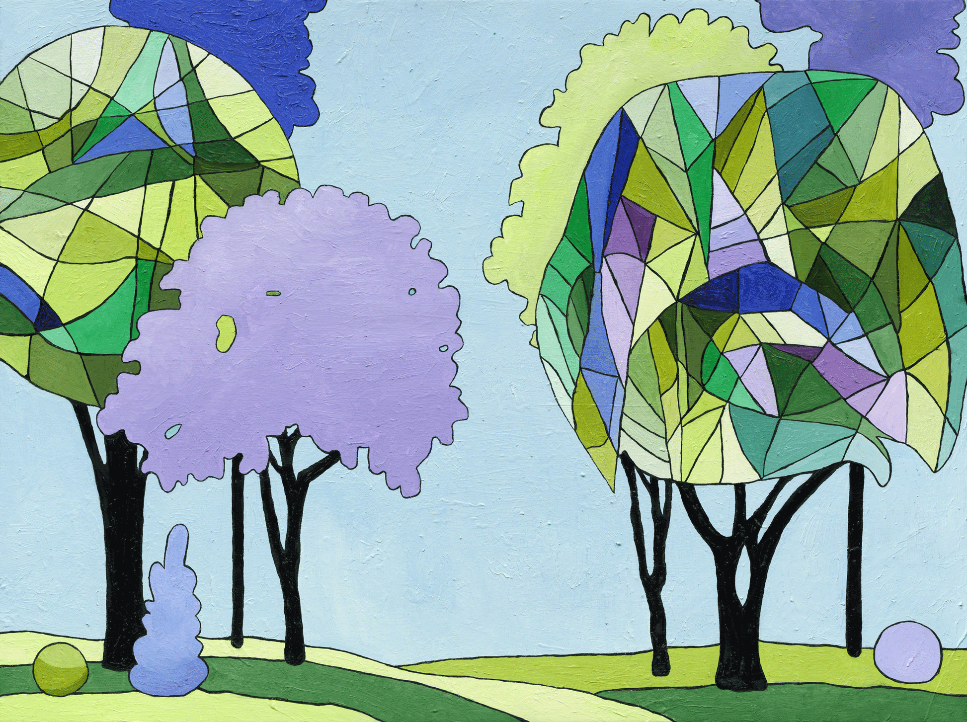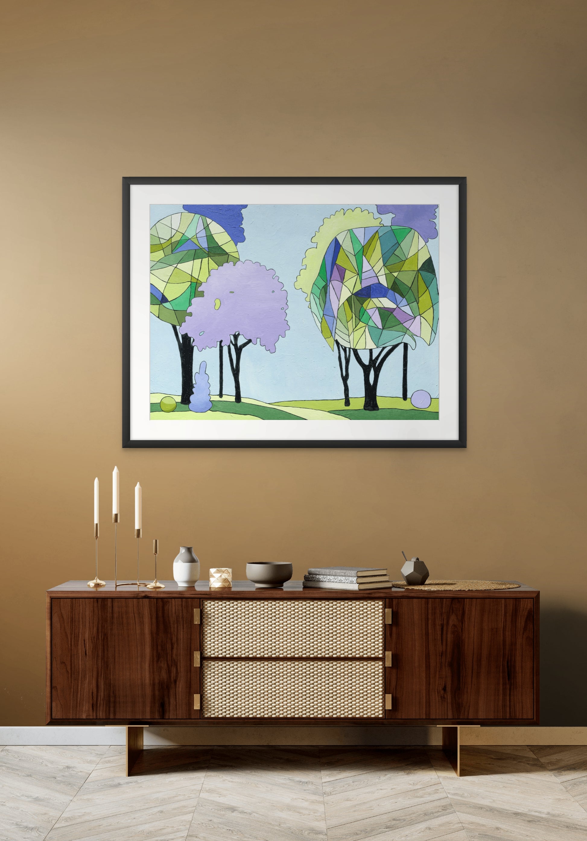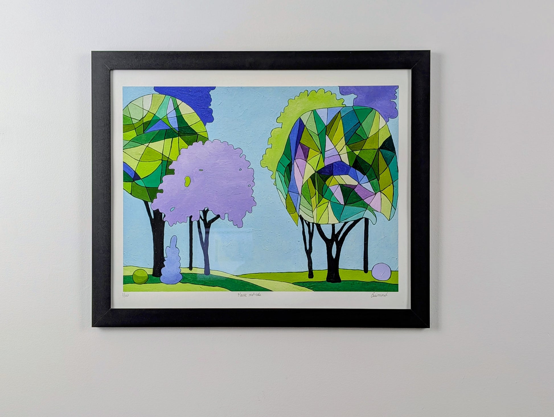 Un paisaje montañoso se extiende bajo un cielo claro, bañado a la luz de la mañana. En primer plano, un árbol de hoja de malva captura inmediatamente el ojo, su silueta vaporosa contrasta con las formas geométricas fragmentadas de los otros árboles. Los tonos de verde, azul y amarillo se entrelazan para crear un equilibrio sutil entre la dulzura orgánica y el rigor abstracto.