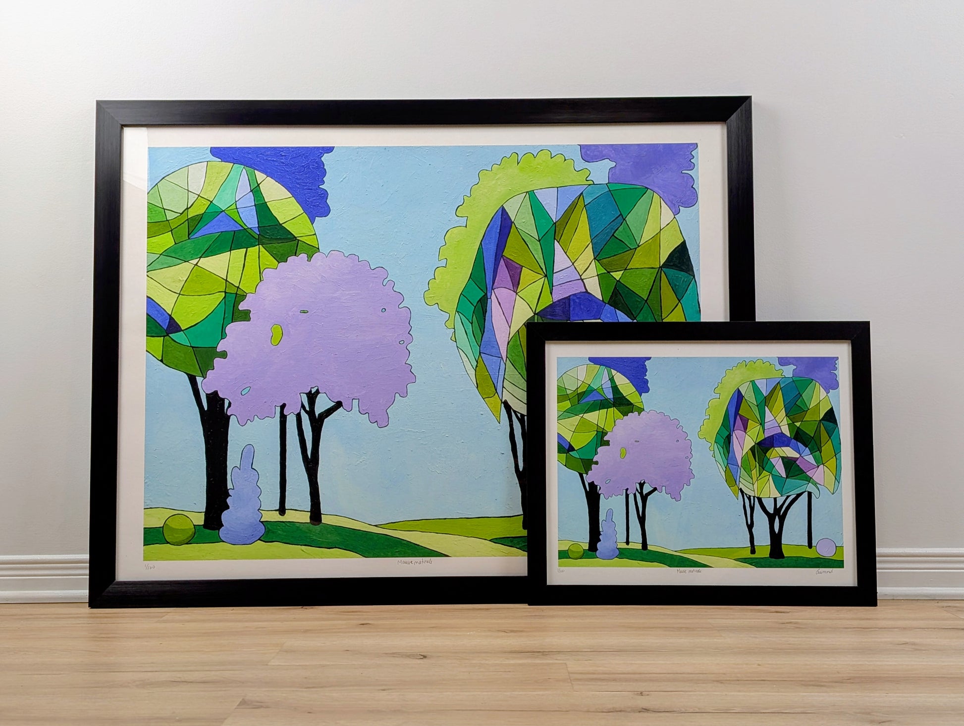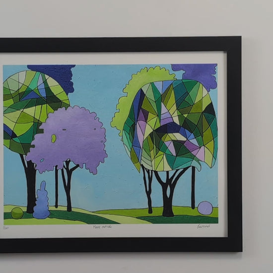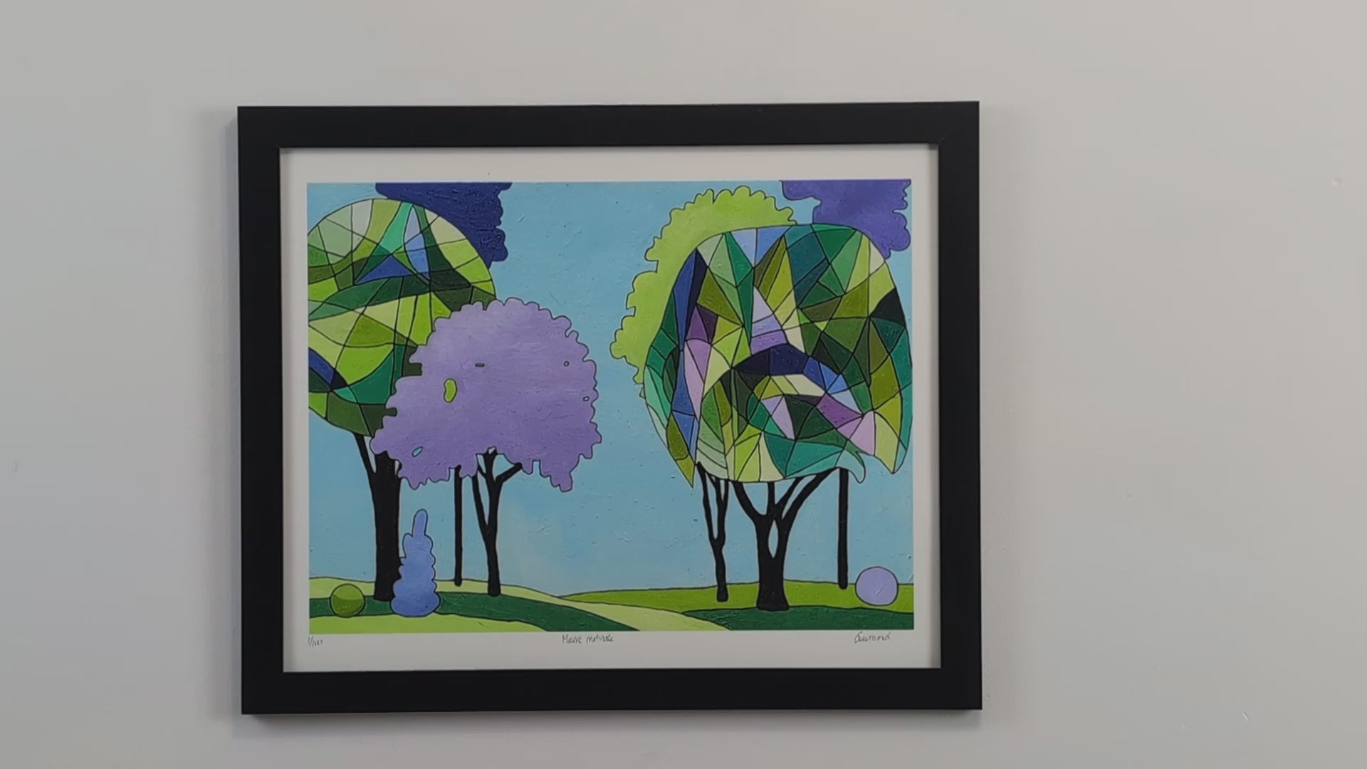 Un paisaje montañoso se extiende bajo un cielo claro, bañado a la luz de la mañana. En primer plano, un árbol de hoja de malva captura inmediatamente el ojo, su silueta vaporosa contrasta con las formas geométricas fragmentadas de los otros árboles. Los tonos de verde, azul y amarillo se entrelazan para crear un equilibrio sutil entre la dulzura orgánica y el rigor abstracto.