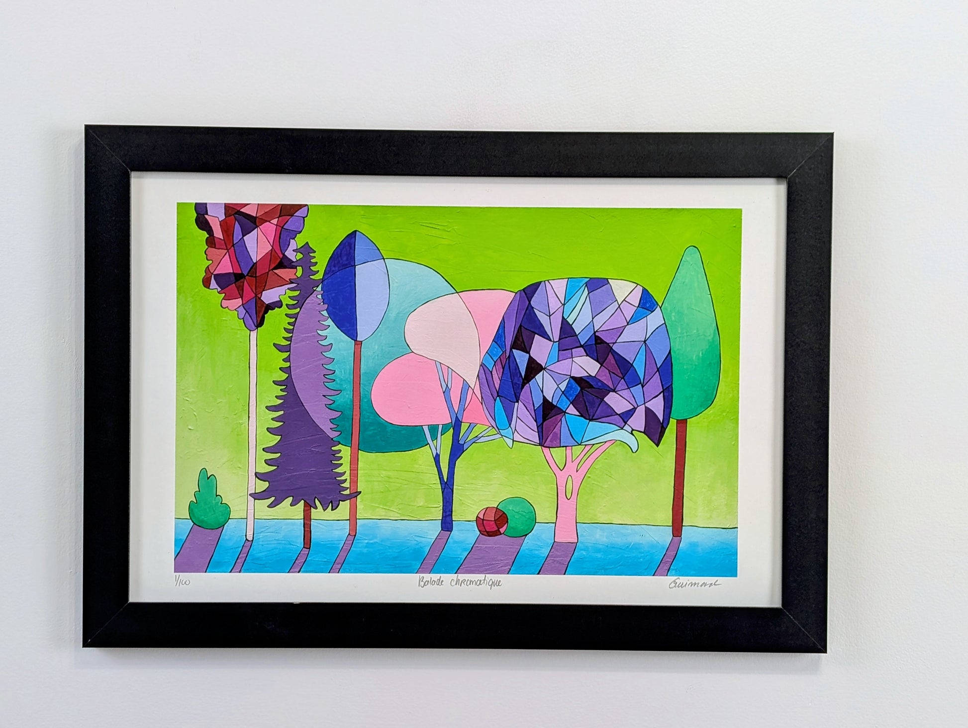 Paseo cromático es una obra brillante y vibrante de Guimond, donde la naturaleza se reinventa en un mosaico colorido y armonioso.