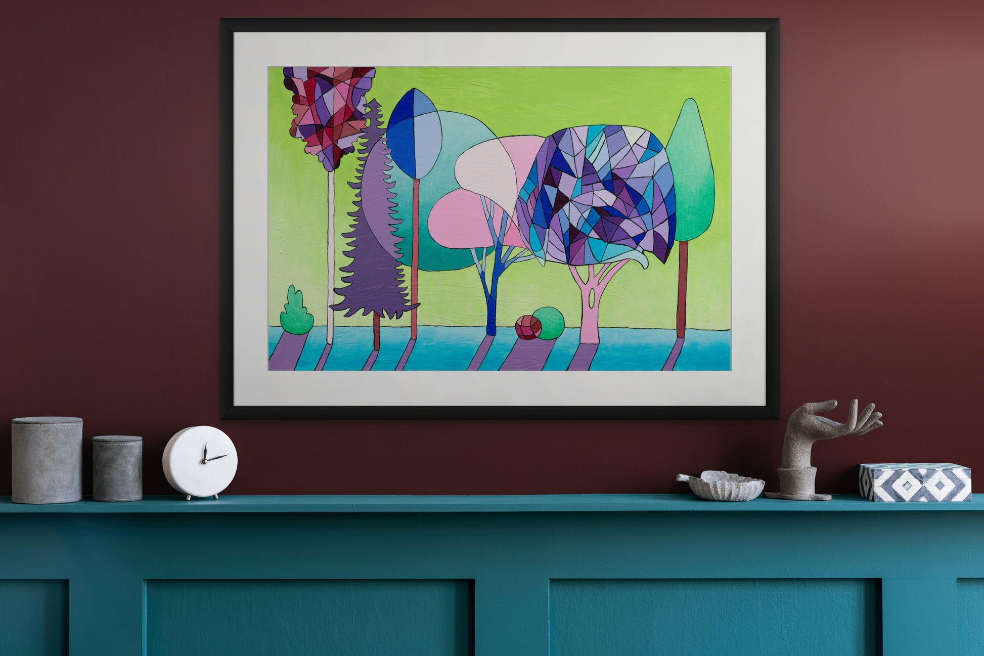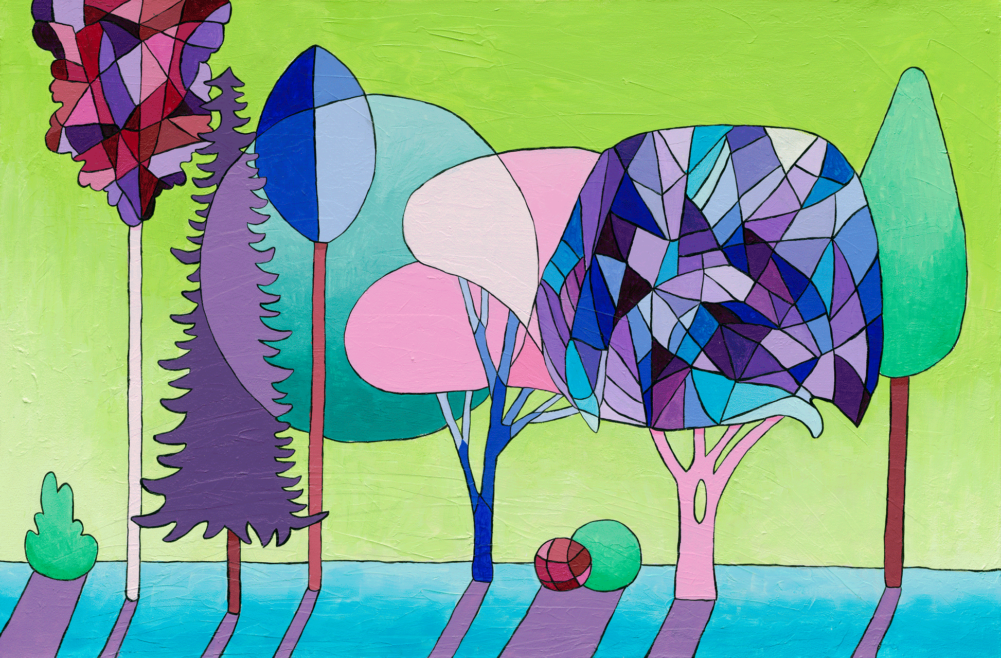 Desde árboles estilizados, formas geométricas y colores atrevidos, se paran en un bosque de ensueño bañado con una luz brillante. Las hojas están disponibles en tonos de azul, púrpura y rosa, en contraste con un fondo verde ácido que inculca una energía estimulante con la composición.