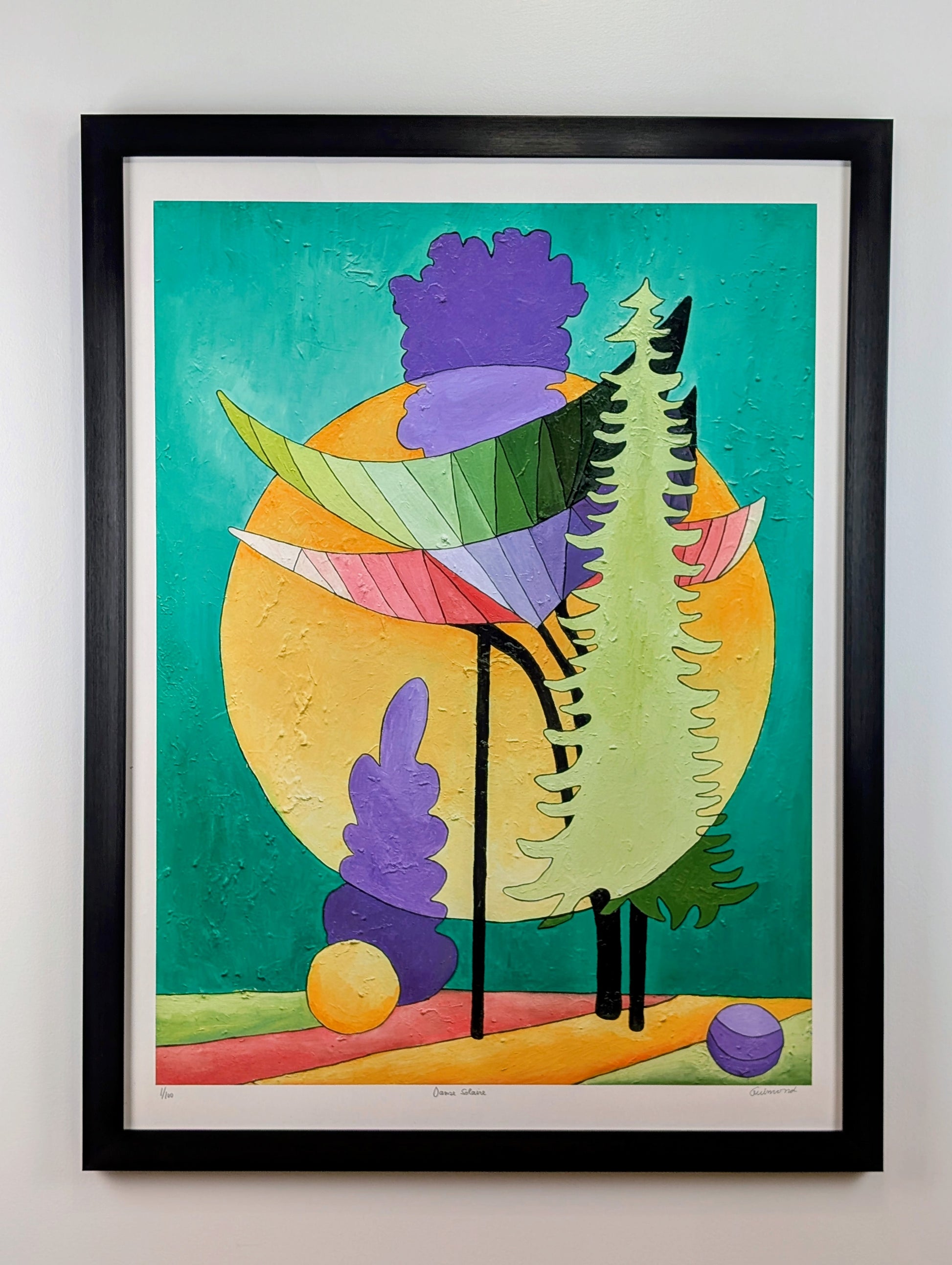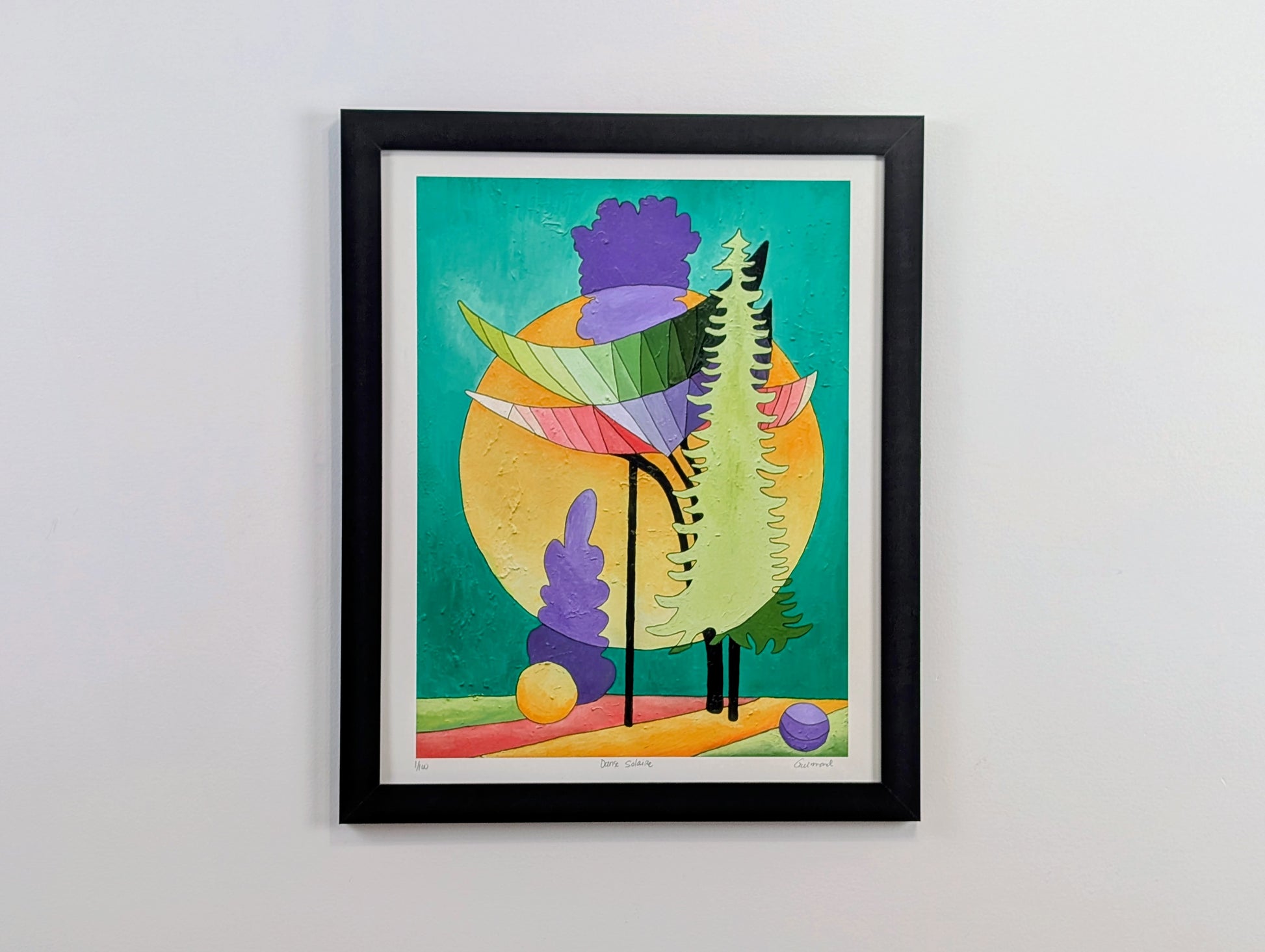 Protector solar es un trabajo cautivador de Guimond, donde las formas y los colores se mezclan en armonía ligera. Una composición atrevida donde la naturaleza parece estar viva bajo el brillo de un sol dorado, proyectando sombras y reflejos vibrantes en el suelo.