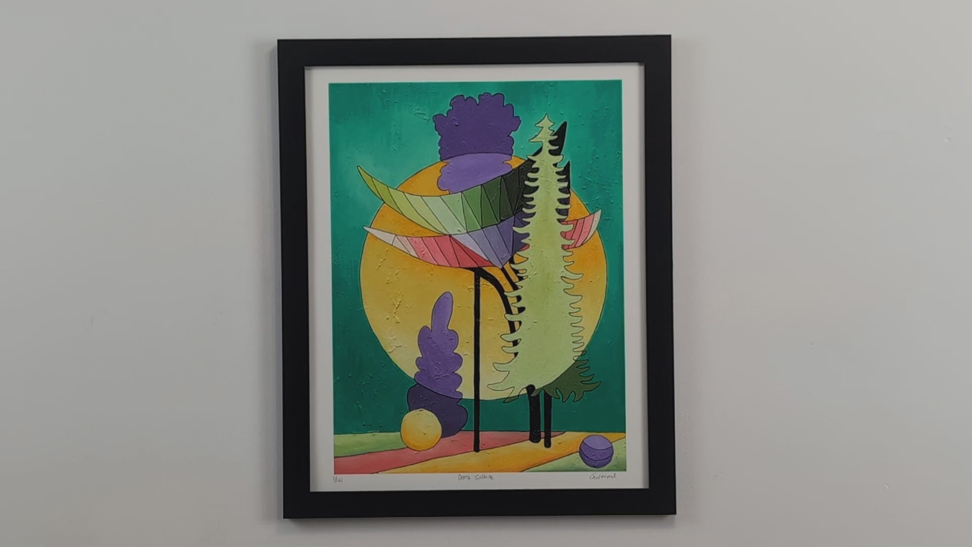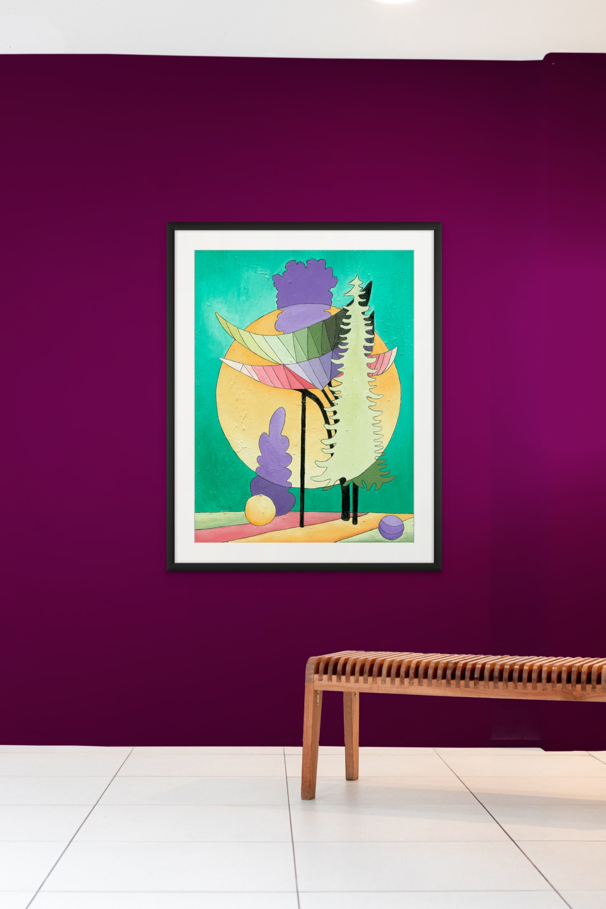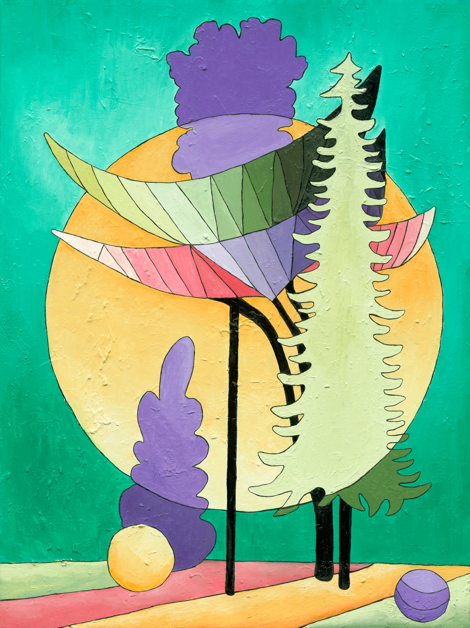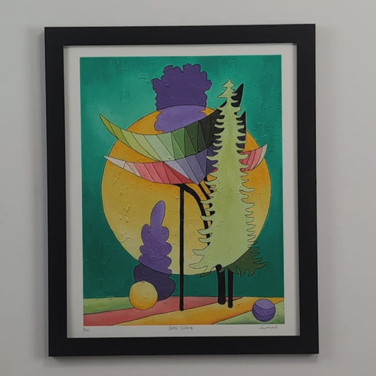 Las curvas orgánicas de los árboles, combinadas con elementos geométricos y tonos pastel, crean una impresión de movimiento, como una coreografía entre la luz y la vegetación. El contraste entre los verdes profundos y los tonos calientes del fondo amplifica esta sensación de energía en equilibrio.