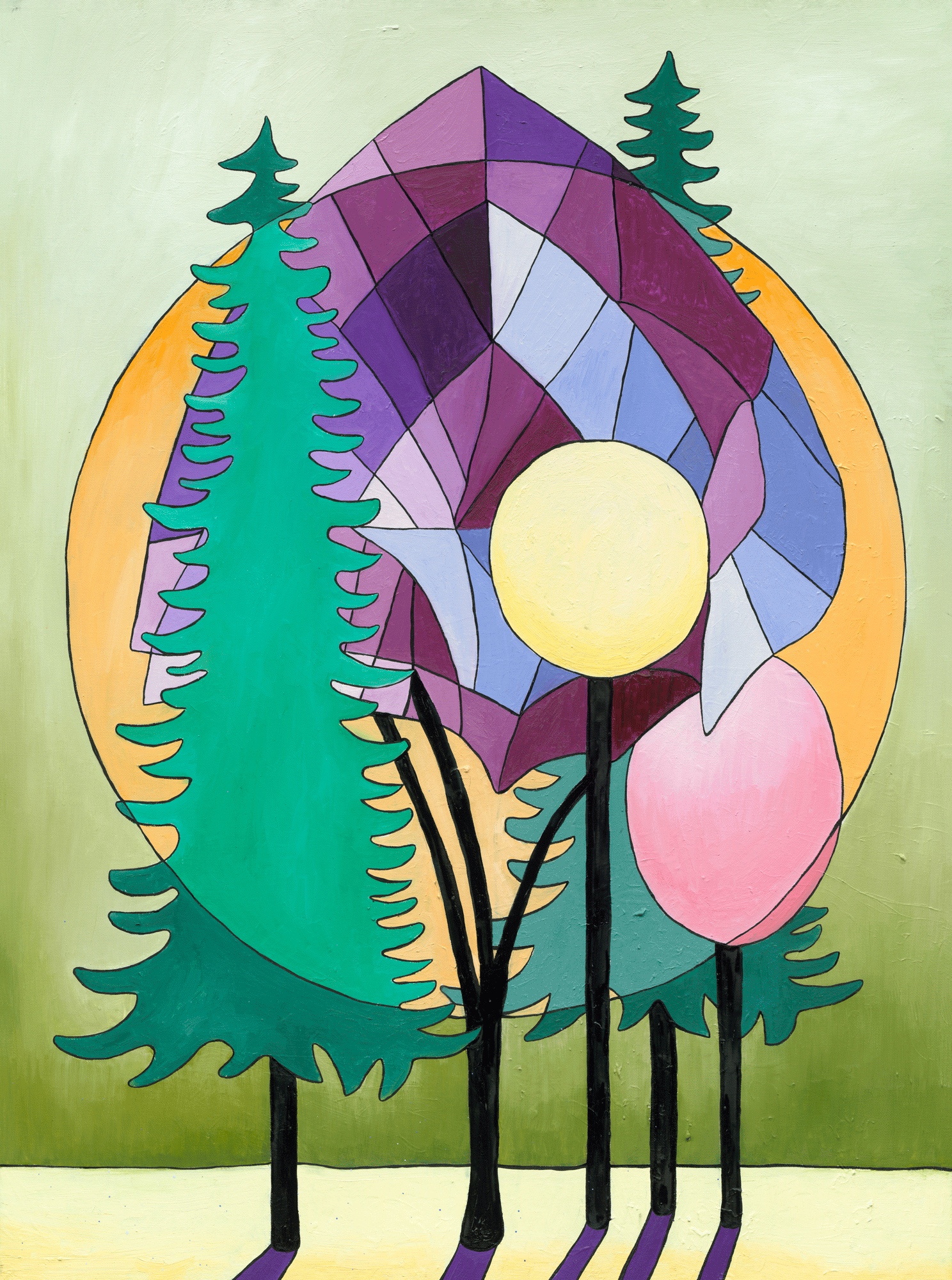 Los tonos verdes profundos de los abetos contrastan maravillosamente con los colores morados y dorados del fondo, creando una composición rica y vibrante. Las sombras proyectadas en el suelo refuerzan la sensación de profundidad y movimiento, como si la naturaleza misma respondiera a la luz del día o los misterios de la noche.