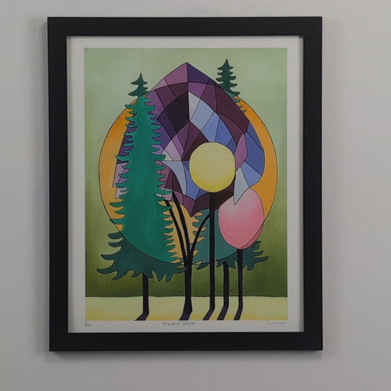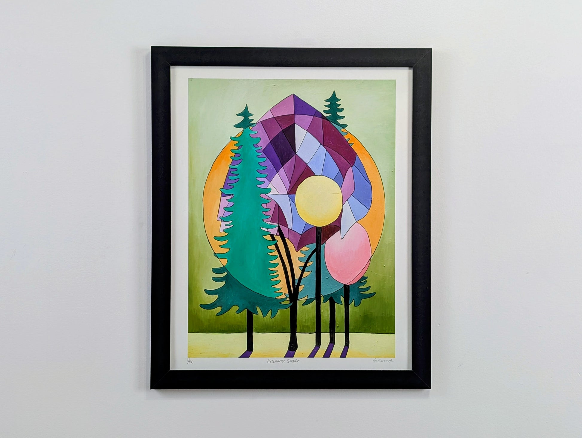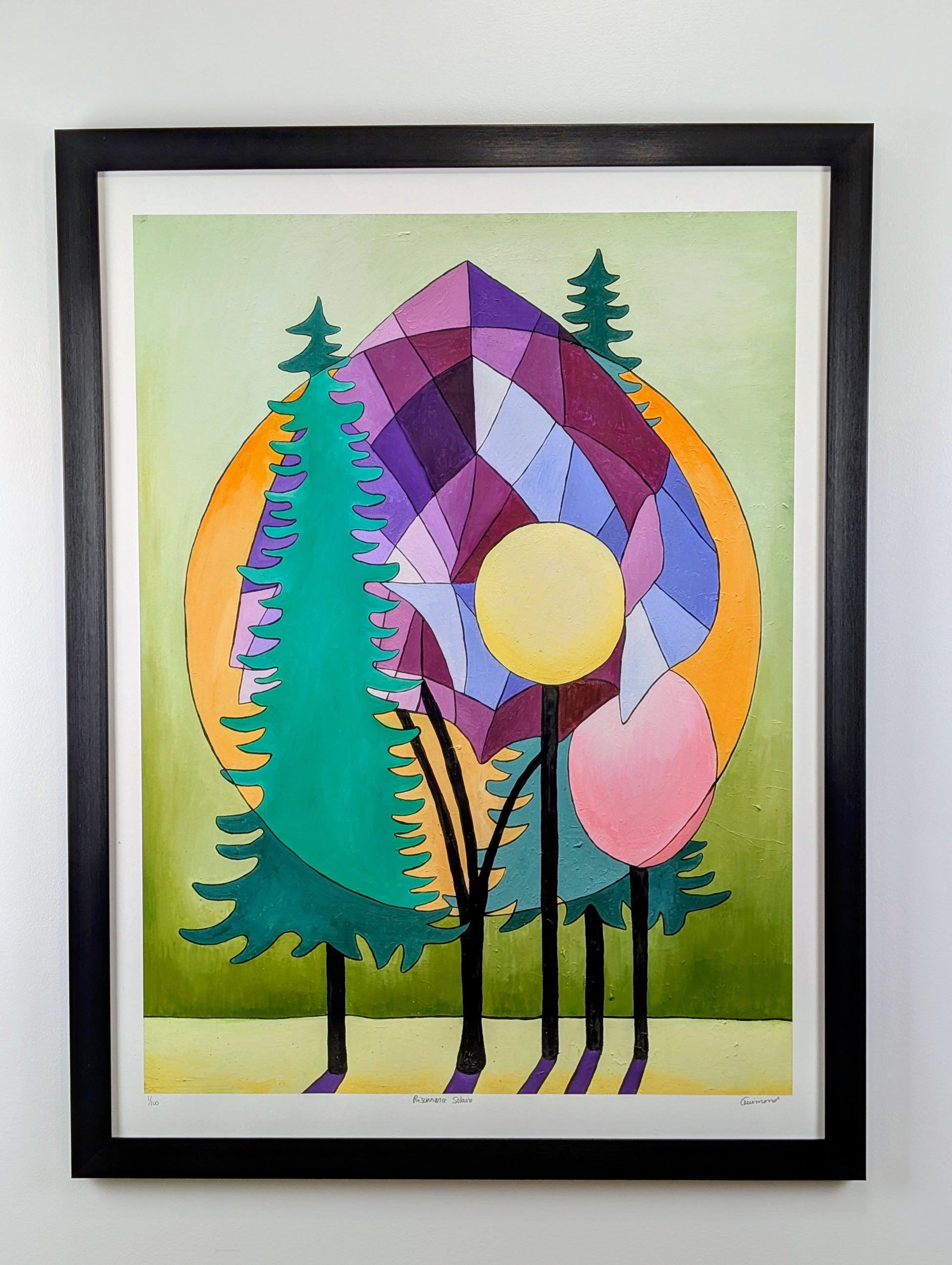 Resonancia solar es una obra brillante y poética de Guimond, que explora la armonía entre la naturaleza y la luz. Los árboles estilizados se separan elegantemente en un fondo compuesto de formas geométricas y círculos solares, fusionando la sombra y la radiación en un equilibrio perfecto.