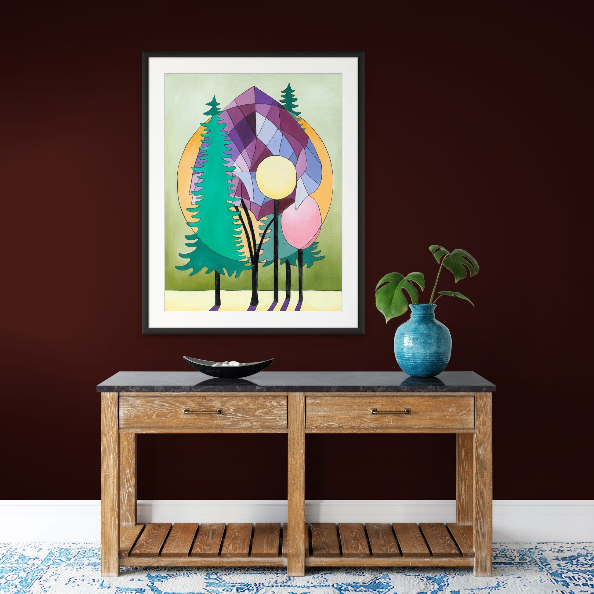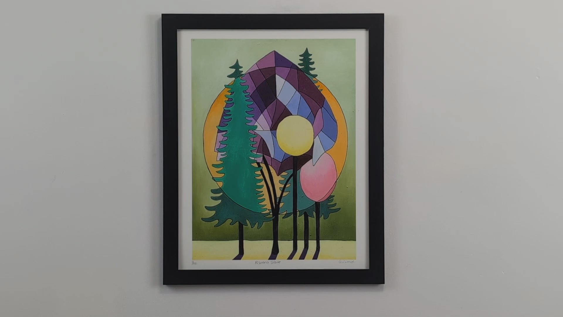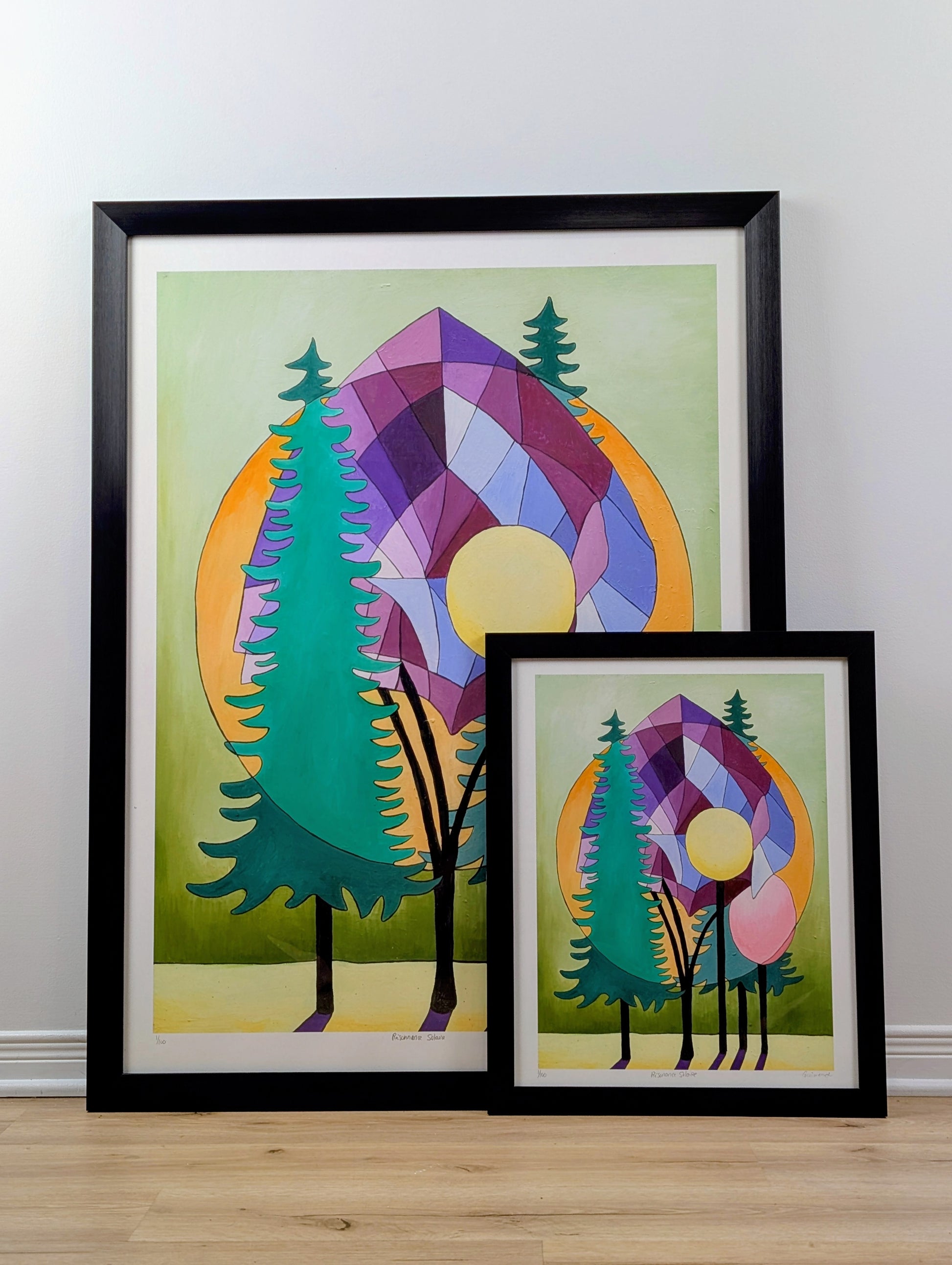 Resonancia solar es una obra brillante y poética de Guimond, que explora la armonía entre la naturaleza y la luz. Los árboles estilizados se separan elegantemente en un fondo compuesto de formas geométricas y círculos solares, fusionando la sombra y la radiación en un equilibrio perfecto.