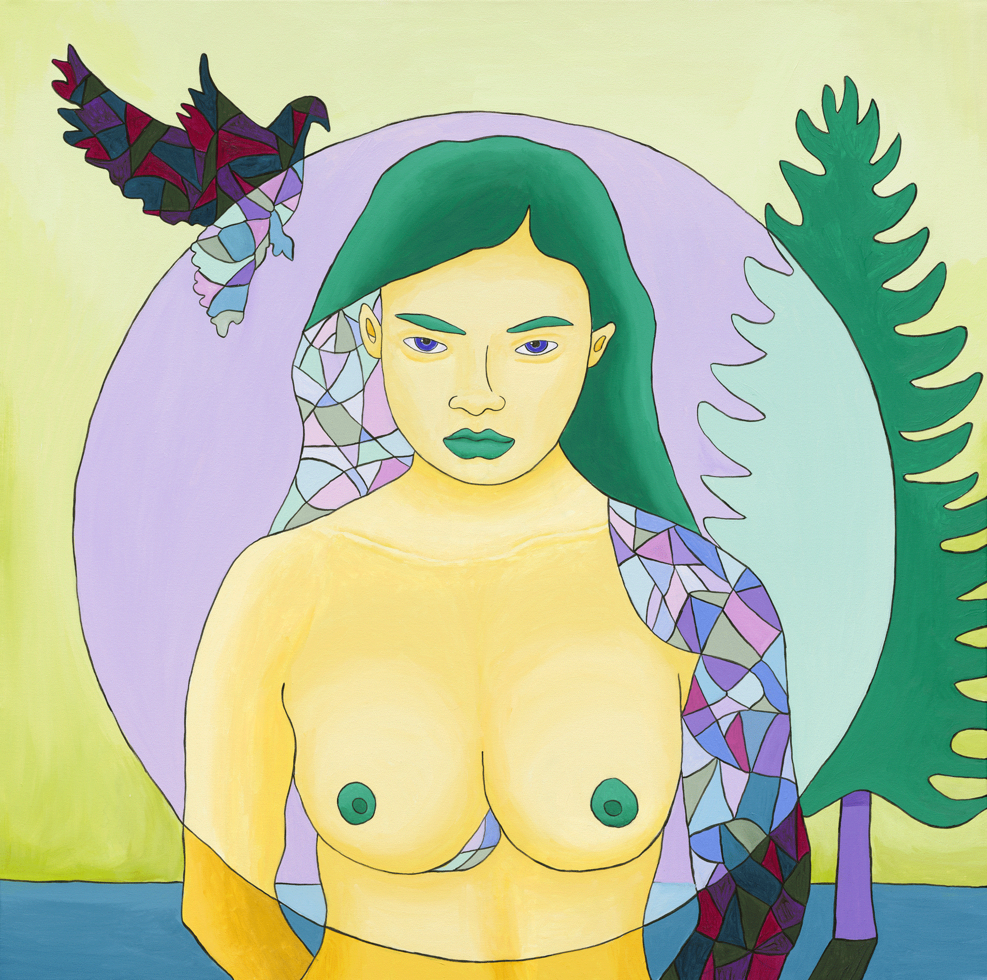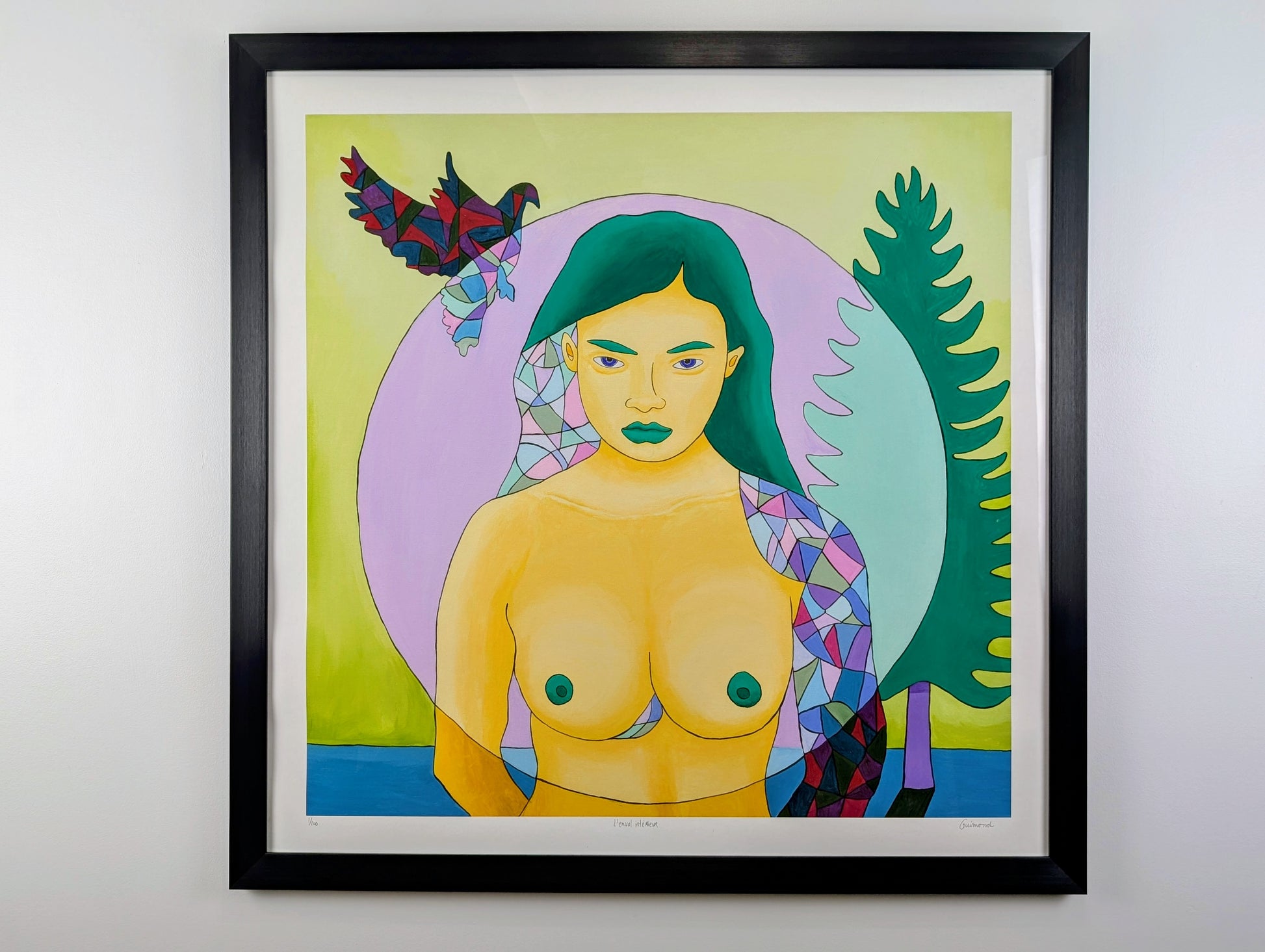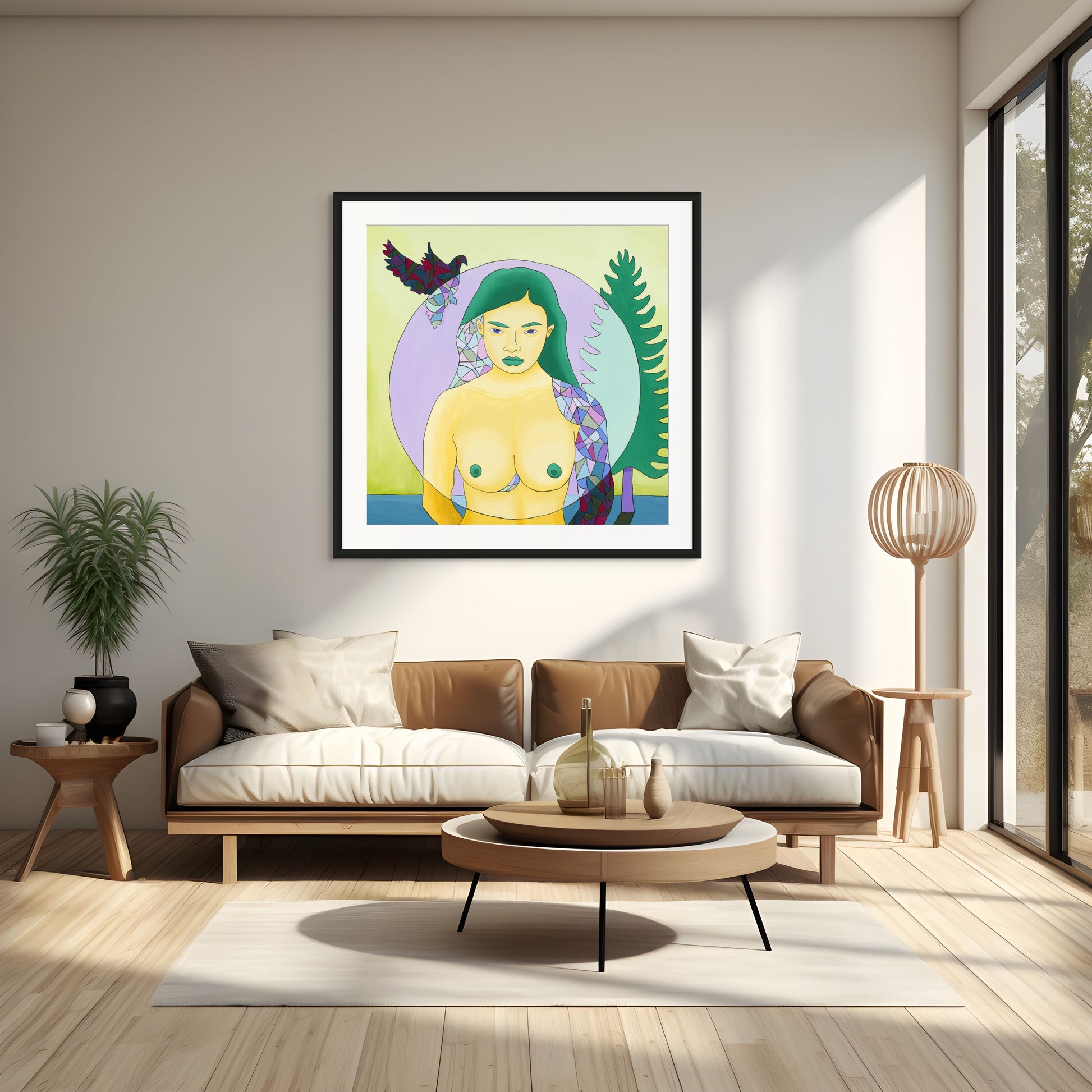 Un pájaro geometrizado, compuesto por fragmentos coloridos, comienza en el fondo, evocando tanto la libertad como la trascendencia. Este vuelo simbólico resuena con el aura de la mujer, como si este pájaro encarnara una respiración interior, una parte de sí lista para comenzar más allá de los límites visibles.