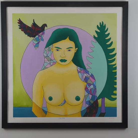 En el centro de la composición, una mujer con una mirada penetrante fija al espectador con una intensidad hipnótica. Sus rasgos asertivos y su postura correcta emiten energía soberana, una presencia enraizada en la naturaleza que lo rodea. Su cabello verde profundo parece prolongar el impulso de los árboles detrás de ella, fortaleciendo su vínculo inseparable con el mundo vegetal.