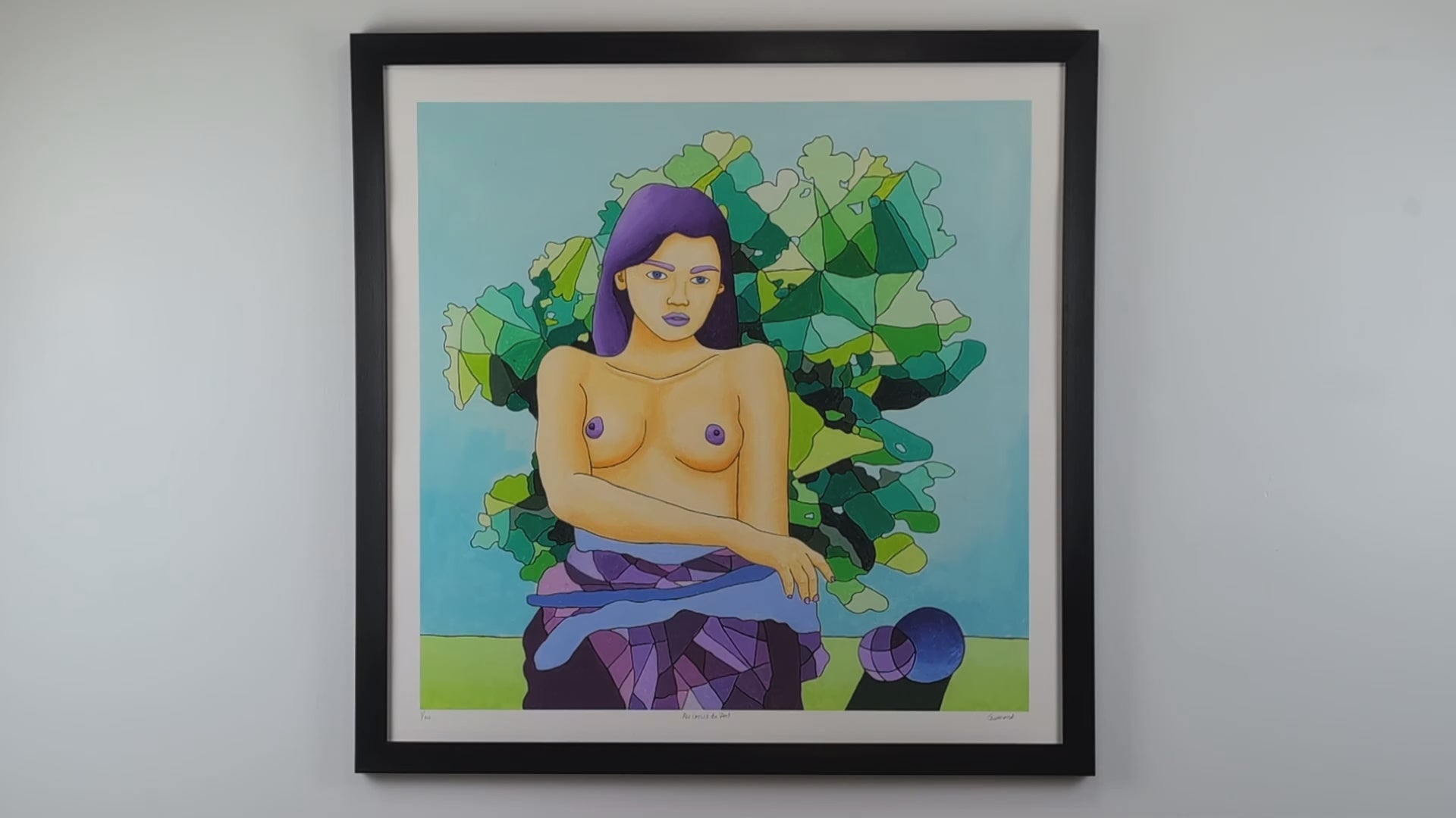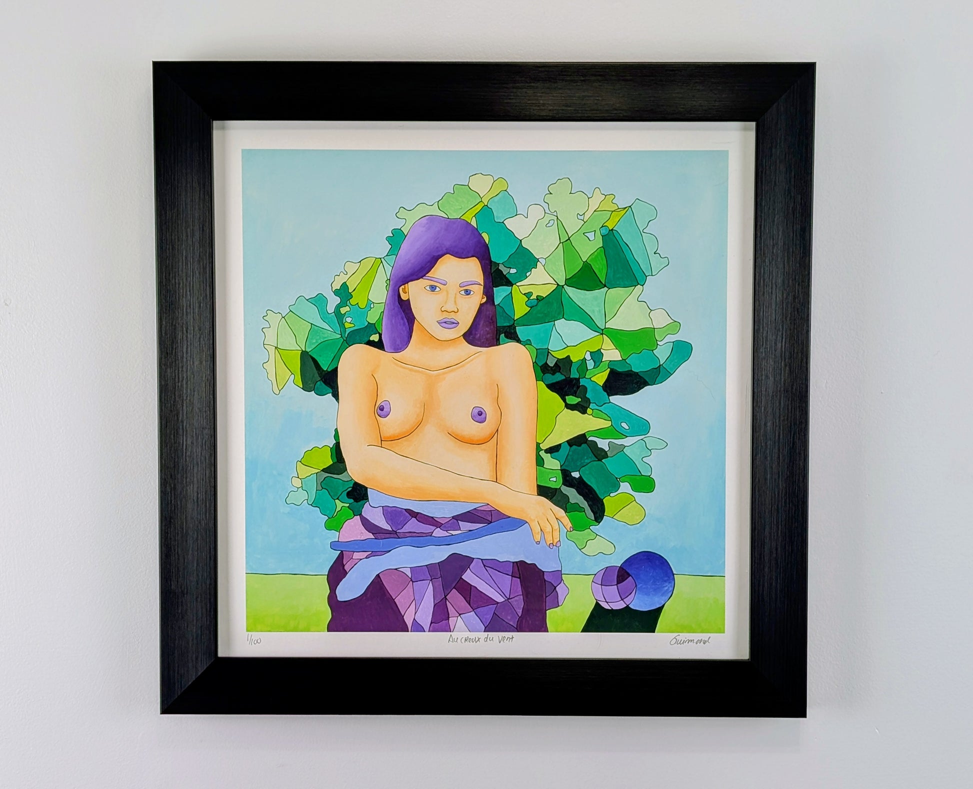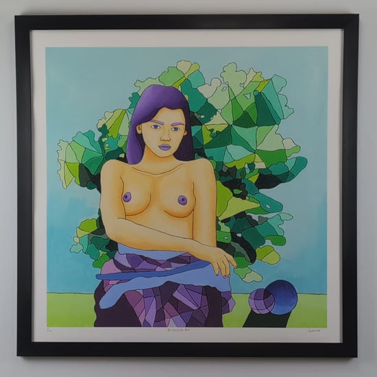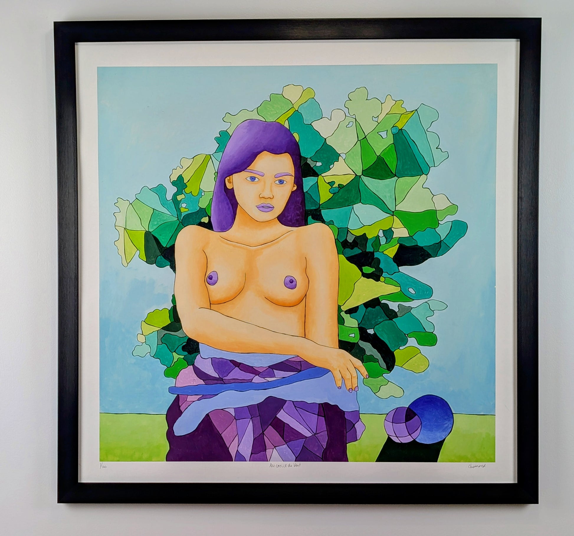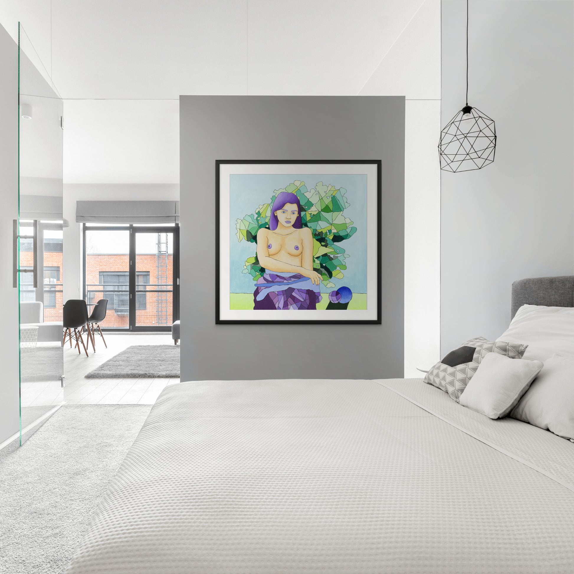 Assise avec une sérénité tranquille, une femme à la chevelure violette se fond dans un paysage végétal foisonnant. Son regard perçant et calme invite à un moment suspendu, où le temps semble s’arrêter, bercé par le souffle du vent et la lumière diffuse. Sa nudité, dévoilée avec une simplicité assumée, s’intègre aux motifs géométriques du tissu qui l’entoure, rappelant l’union entre la peau et l’environnement naturel.