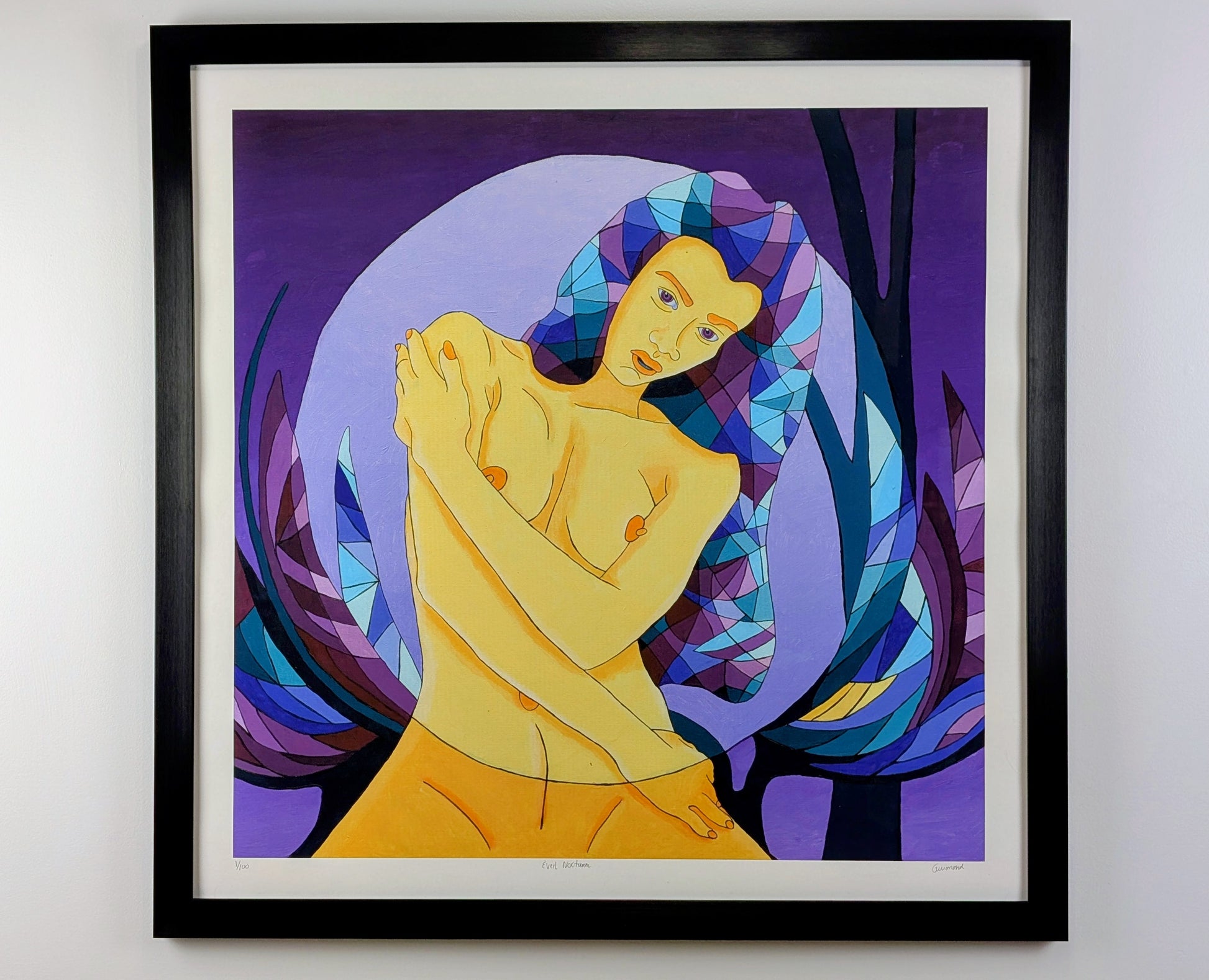 Éveil Nocturne est une œuvre fascinante de Guimond, où le corps et l’esprit semblent fusionner dans un moment de profonde introspection. Une femme, enveloppée d’une douce lumière, se tient dans une étreinte intime, comme en dialogue avec elle-même ou avec l’univers qui l’entoure.