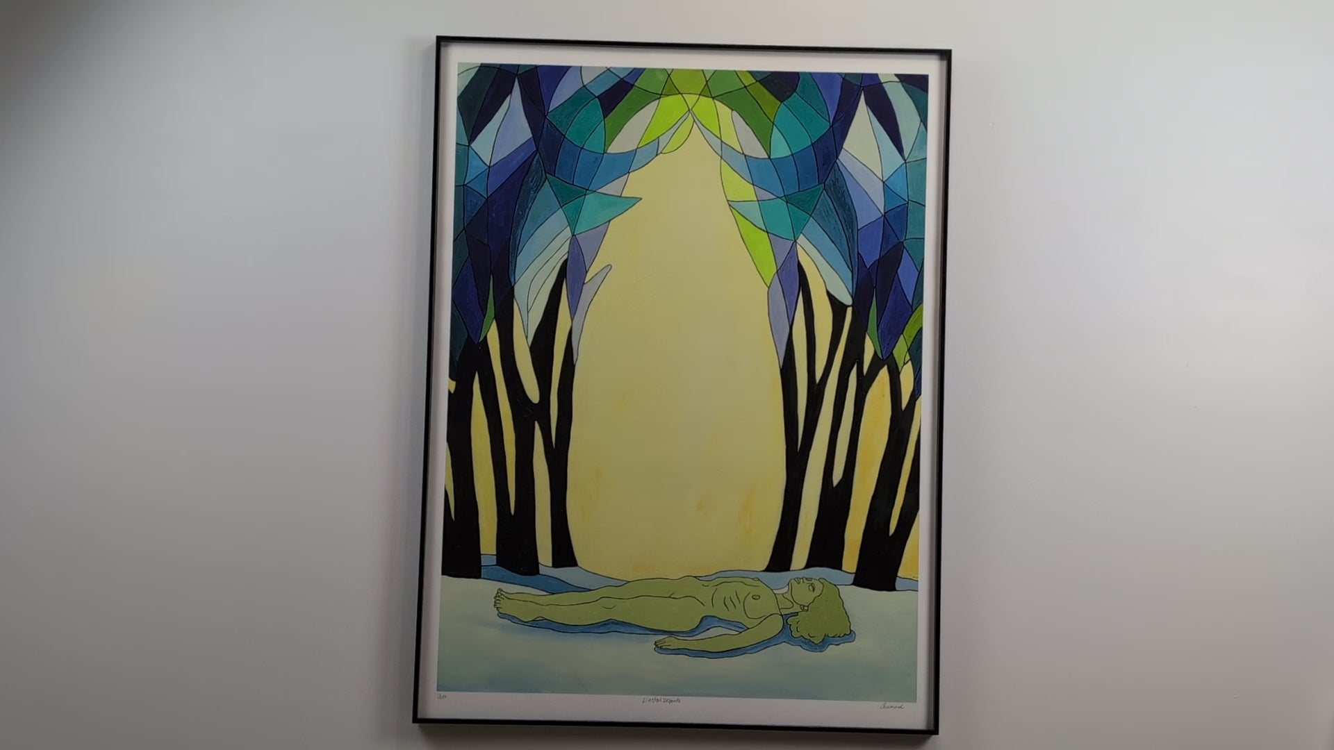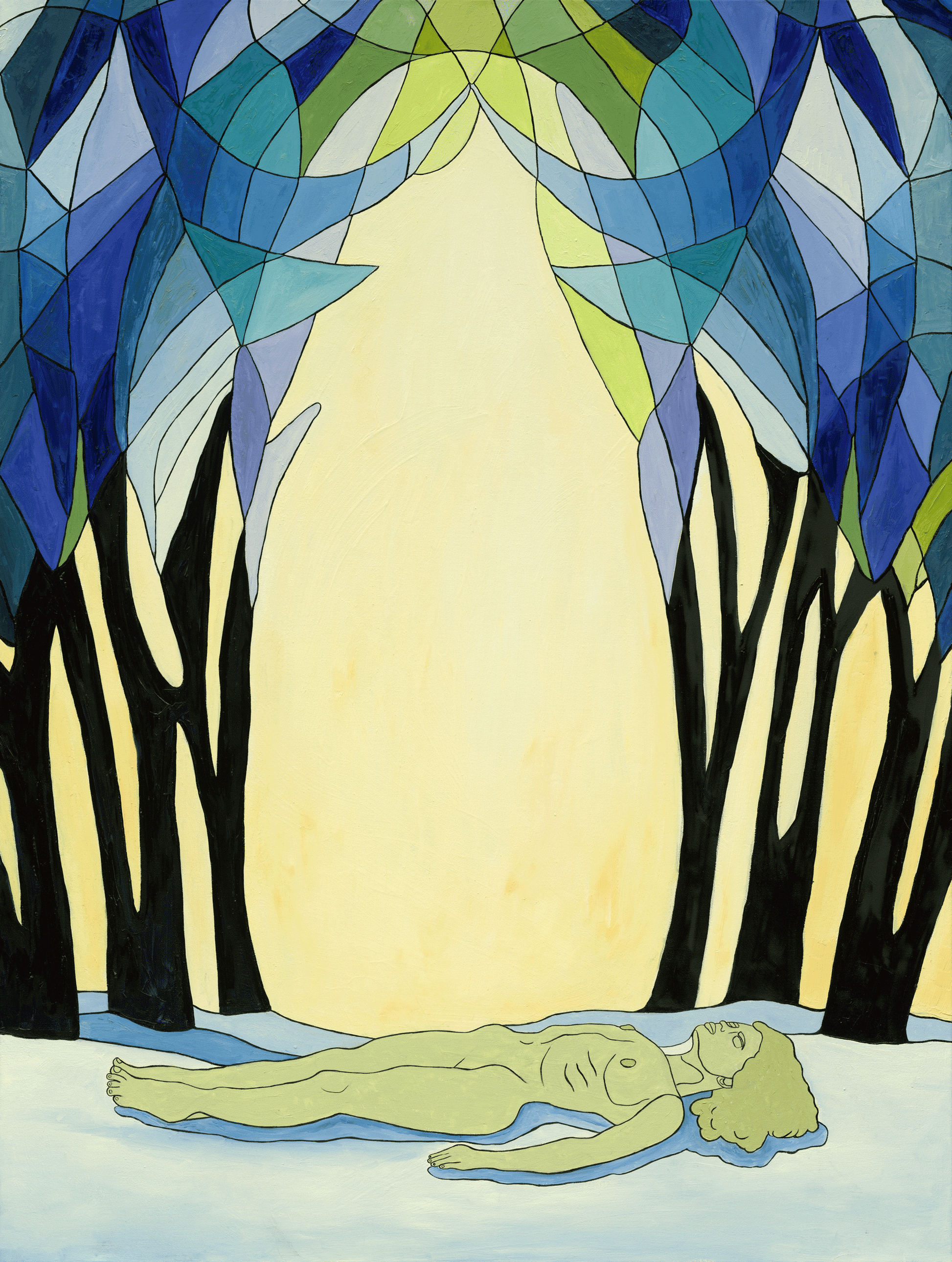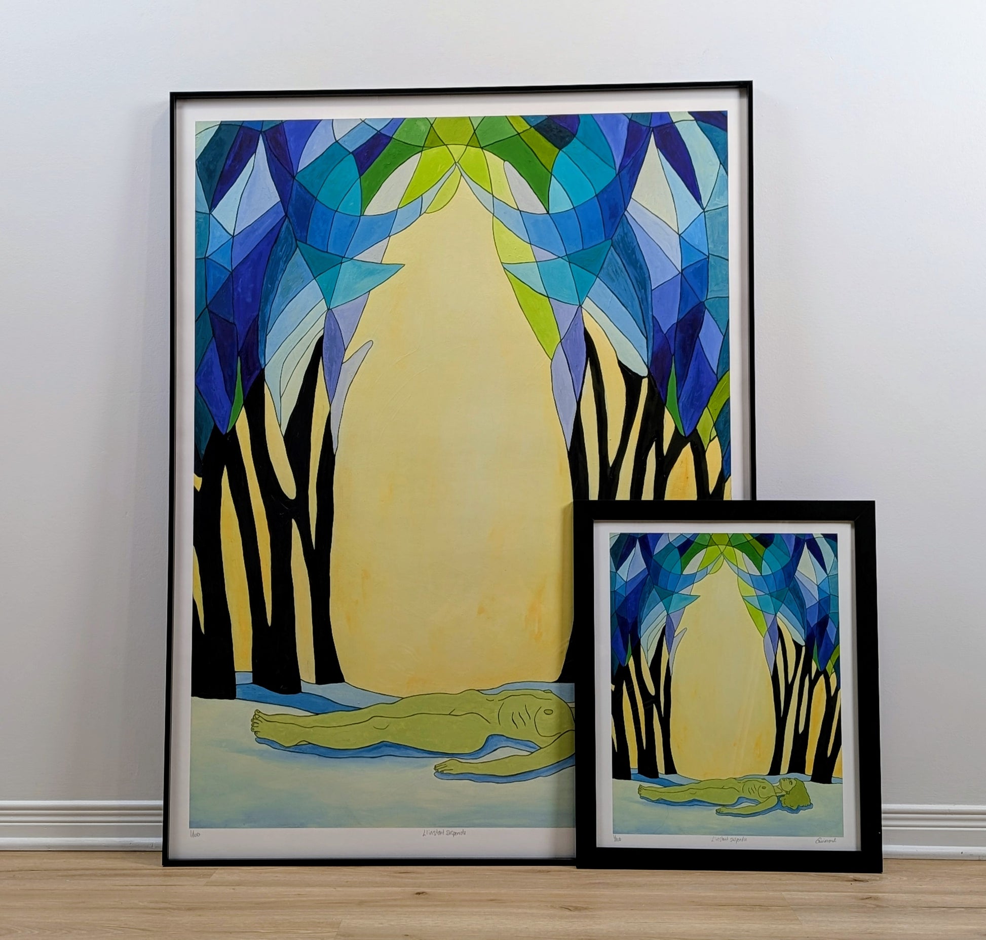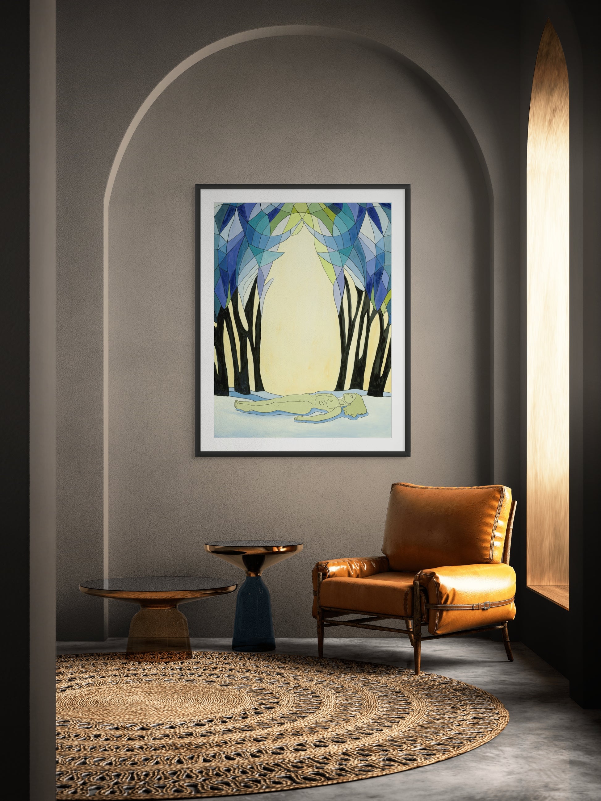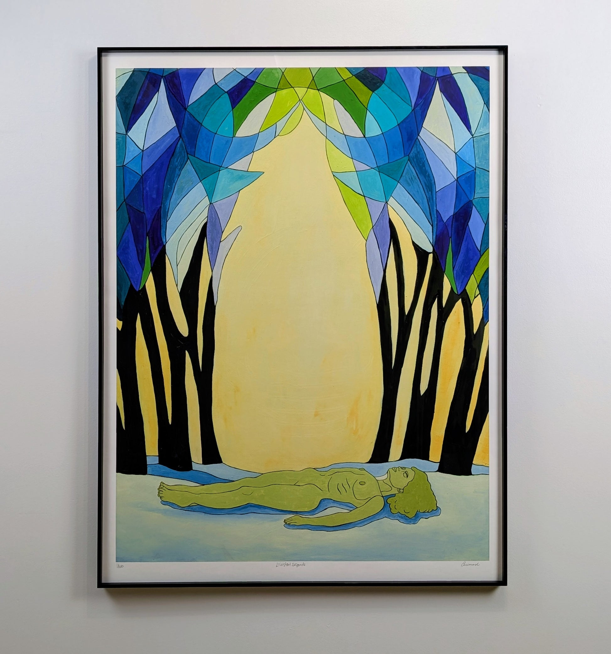 Autour d’elle, des arbres sombres forment un passage, une sorte de voûte sacrée qui s’ouvre vers une lumière éclatante. Leurs feuillages géométriques, dans des tons de bleu et de vert, créent un mouvement fluide qui semble s’étirer vers le ciel, donnant à la scène une dimension presque mystique. La lumière dorée au centre agit comme une force enveloppante, un appel vers un ailleurs ou une énergie bienveillante qui baigne la figure allongée.