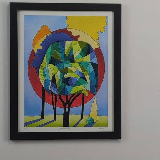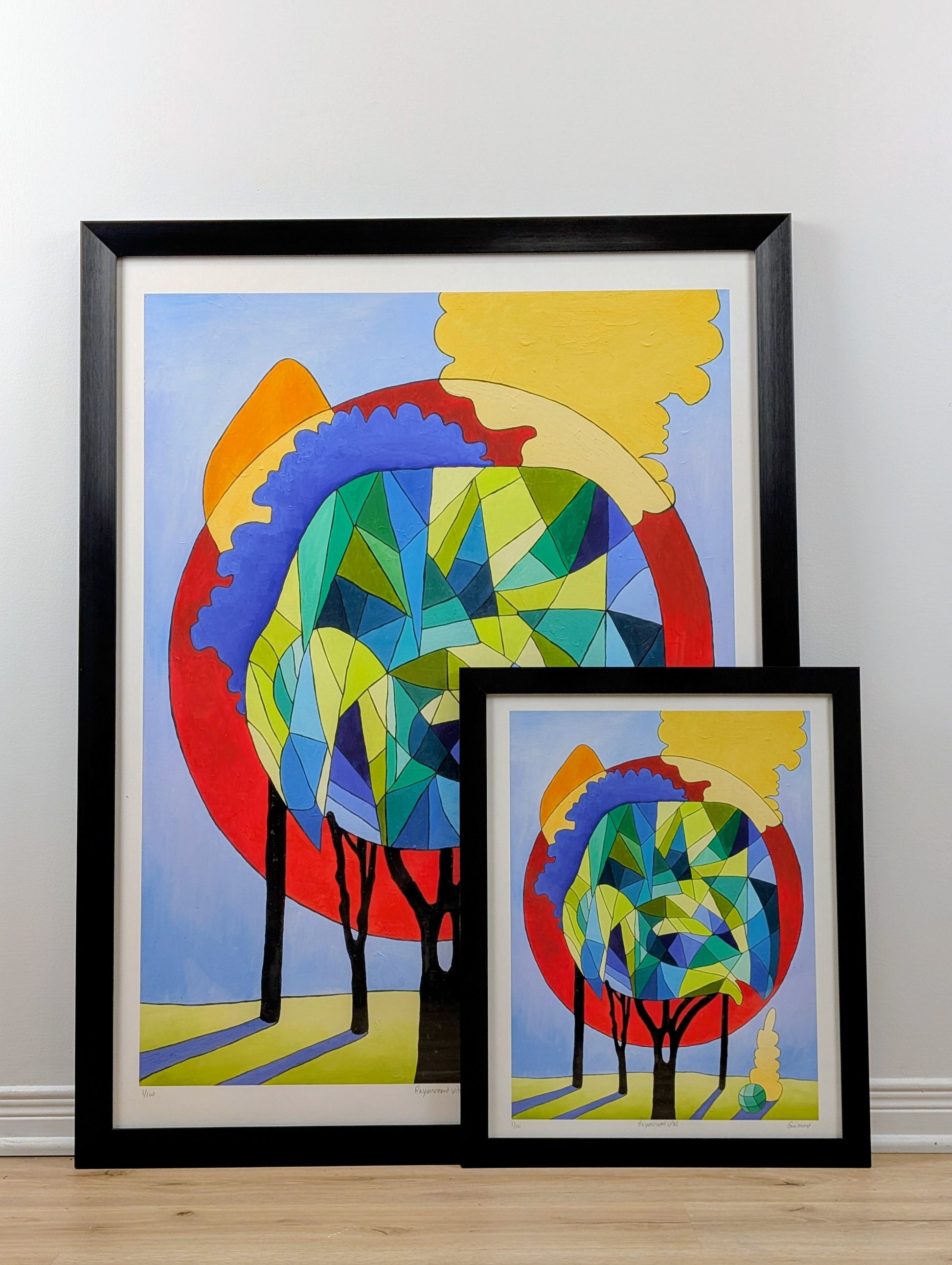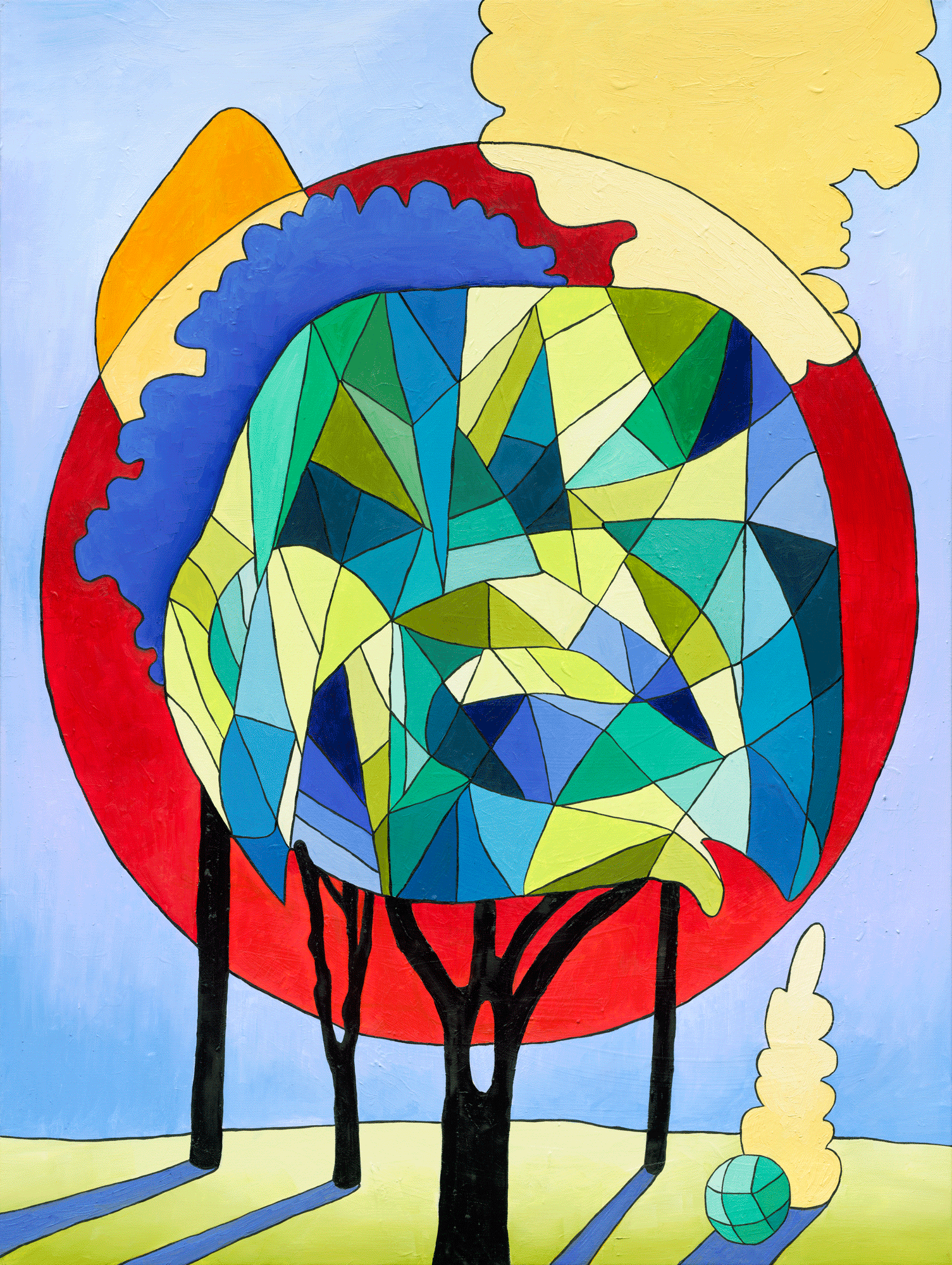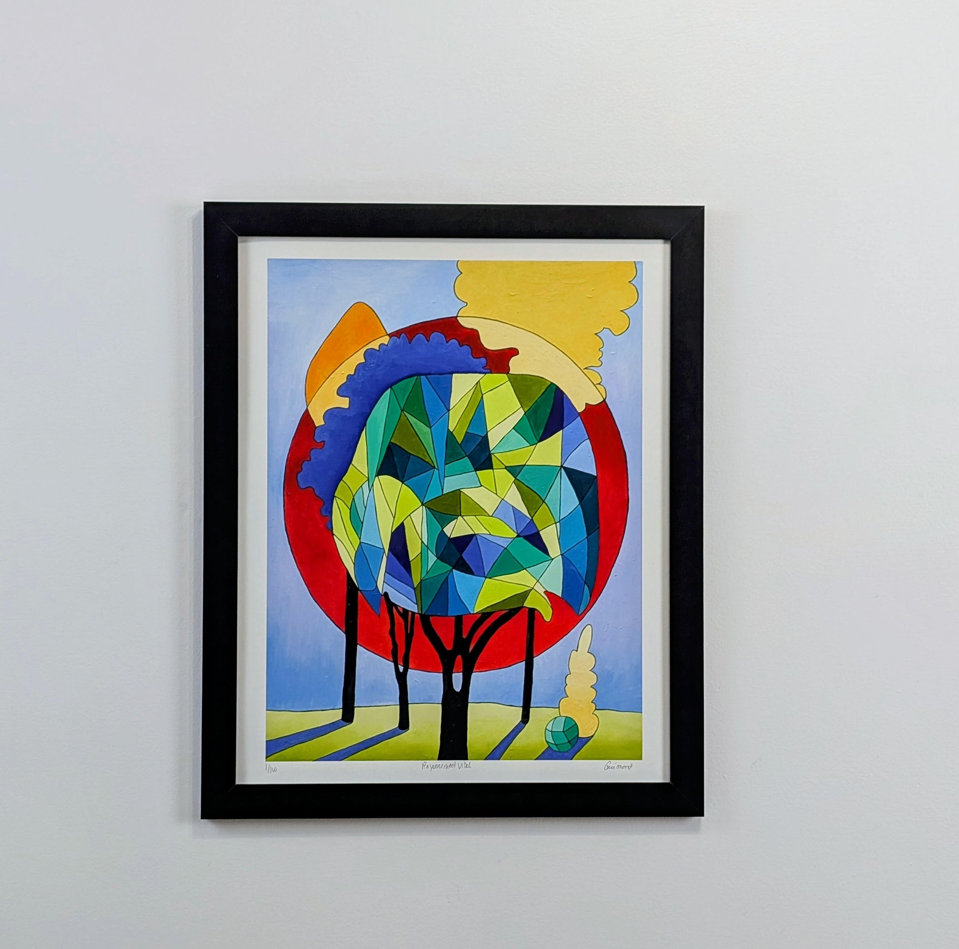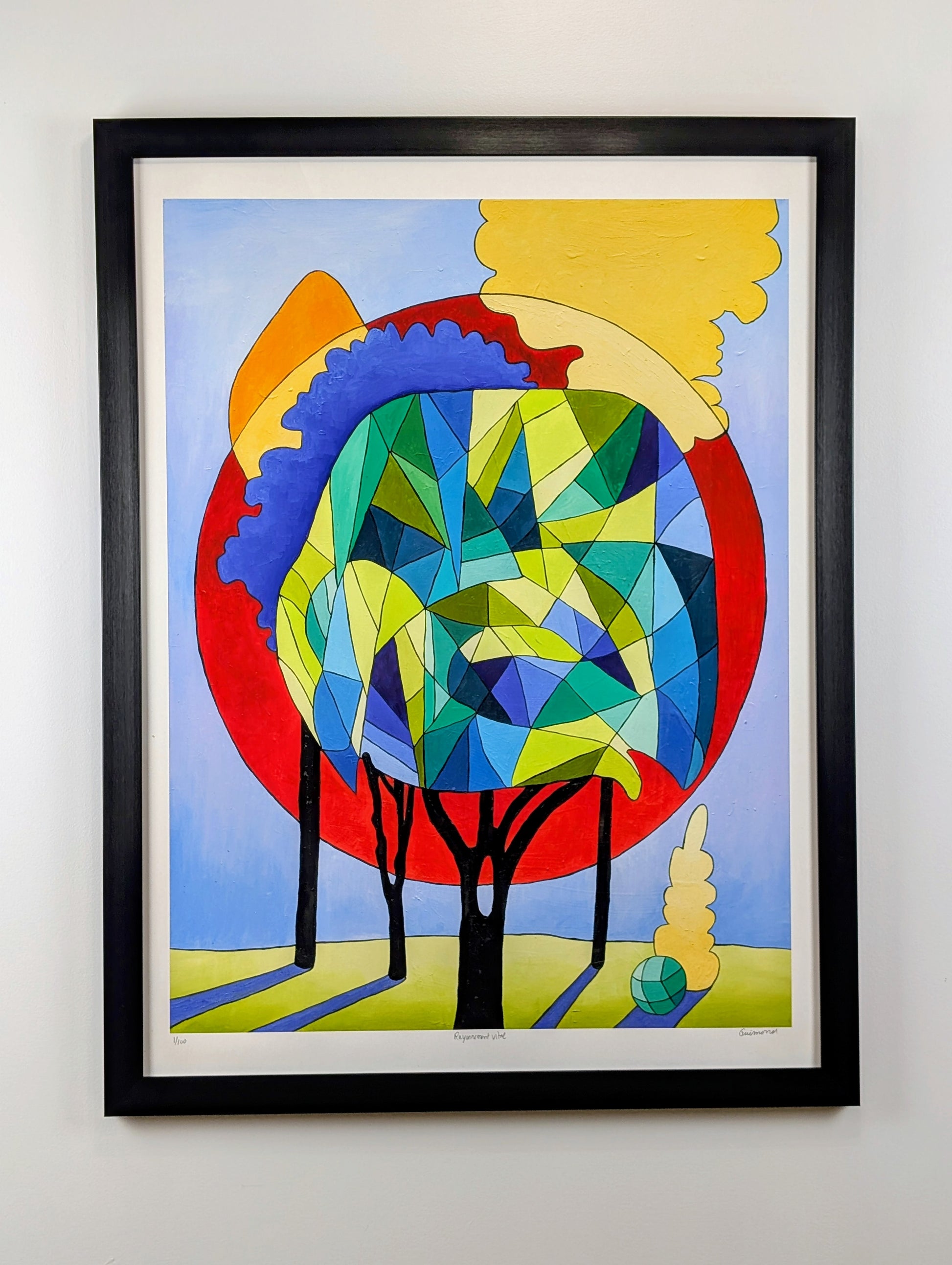 Rayonnement Vital est une œuvre éblouissante de Guimond, où la nature et l’énergie cosmique s’unissent dans une composition dynamique et immersive. Un arbre majestueux au feuillage géométrique vert et bleu se dresse au centre de la scène, encadré par un disque solaire rouge vif, comme une aura vibrante de vitalité.